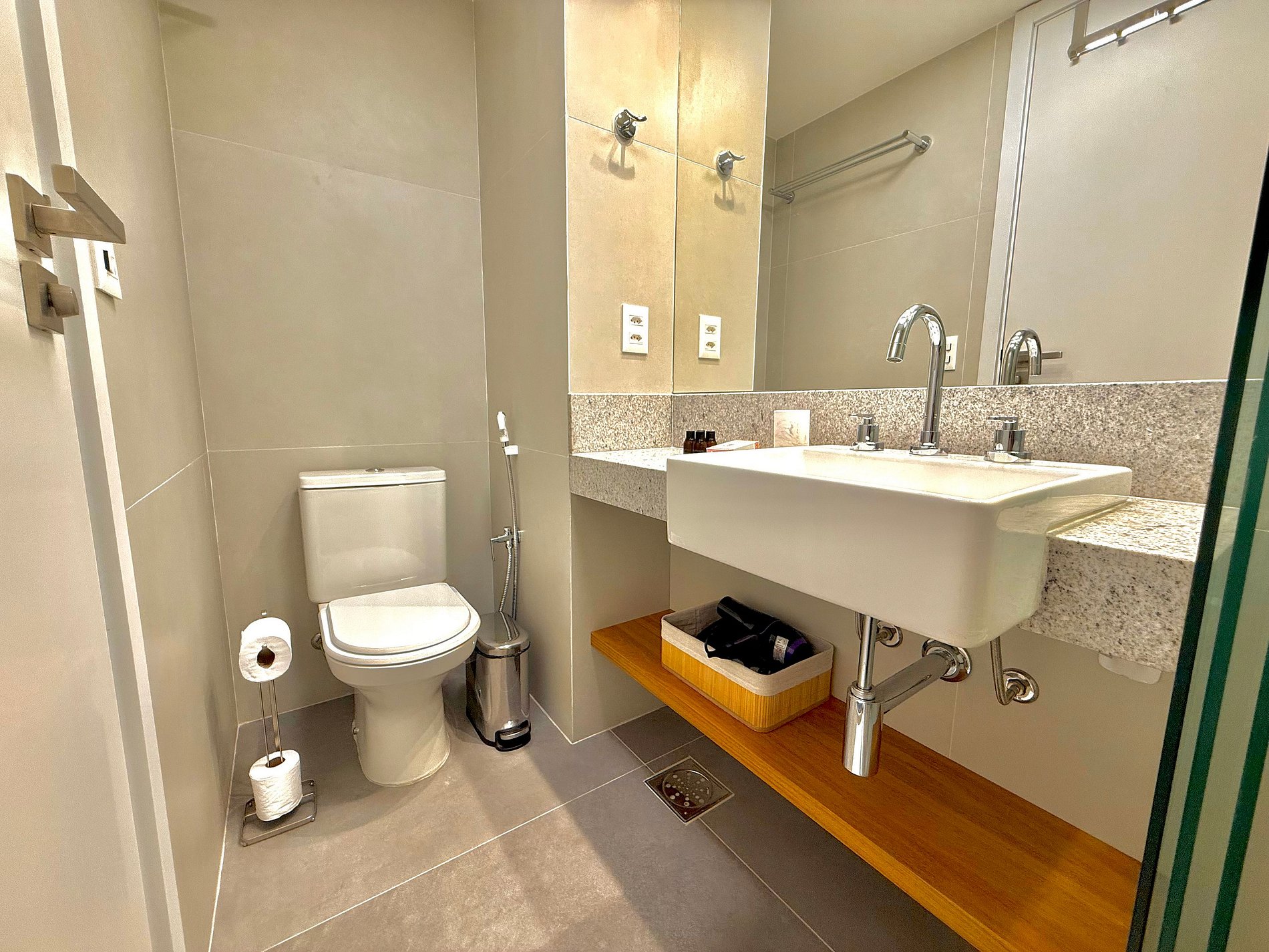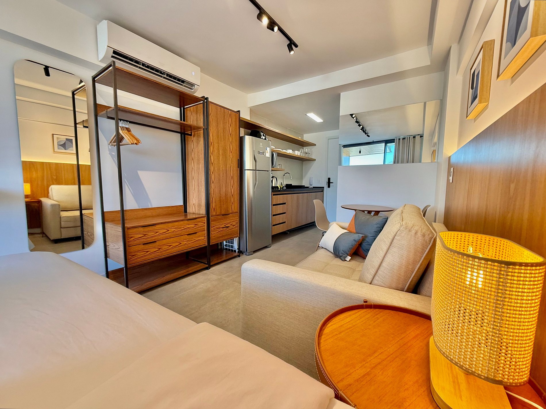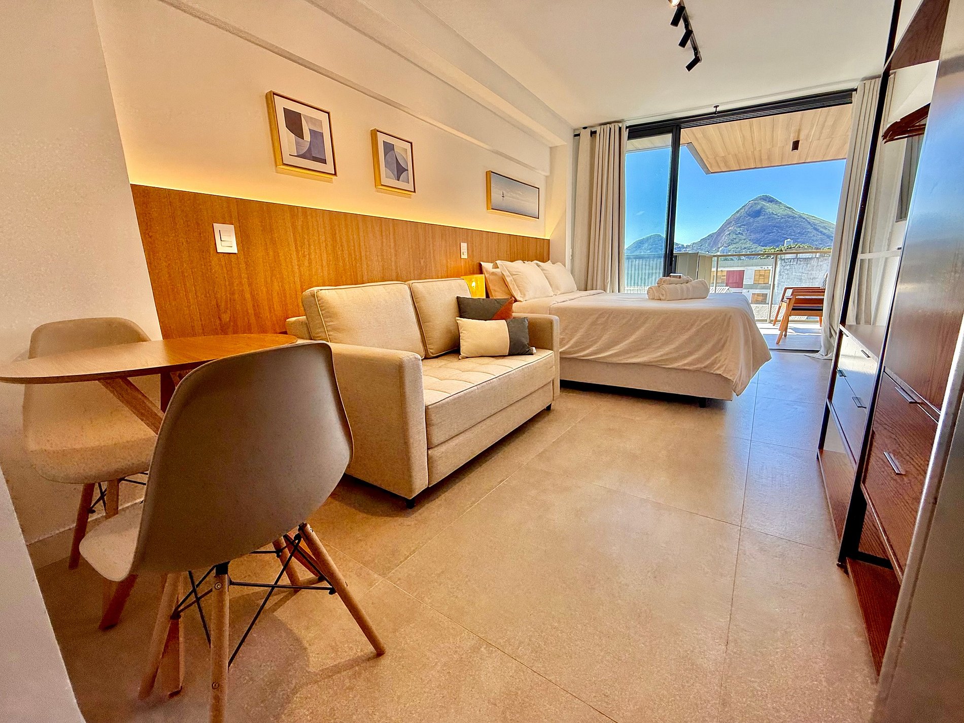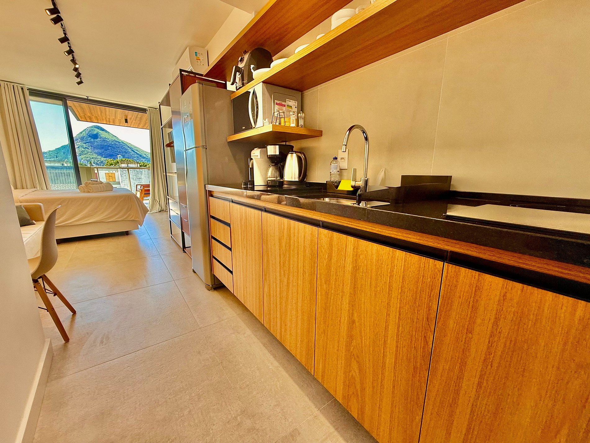 Studio super agradável com cama queen confortável, sofá-cama, armários, ar condicionado potente, Smart TV de 50 polegadas, cortina blackout, mesa de jantar, estação de trabalho, diversas tomadas, além de contar com uma varanda super charmosa com vista para o Cristo Redentor, montanhas e para a rua. Internet de alta velocidade. Banheiro todo completo e com chuveiro com boa pressão. Cozinha equipada com geladeira, cooktop, microondas, máquina de Nespresso, cafeteira elétrica, chaleira elétrica, Airfryer, sanduicheira, filtro de água e diversos utensílios. Oferece também outras comodidades, como berço portátil*, secador de cabelo, ferro de passar roupa e kit de amenities (shampoo, condicionador e sabonete).