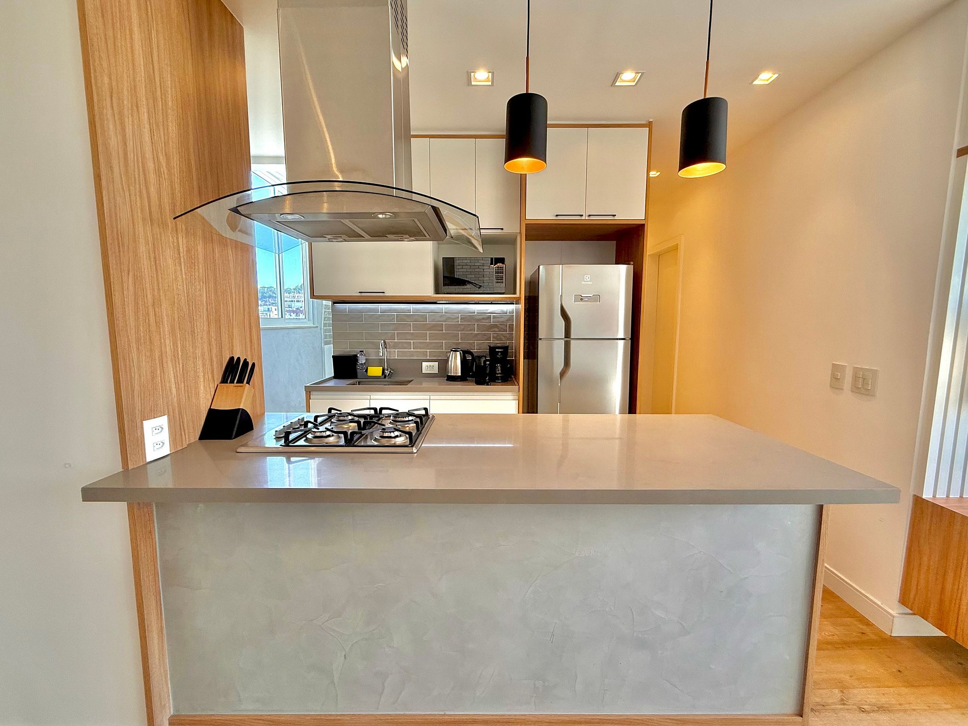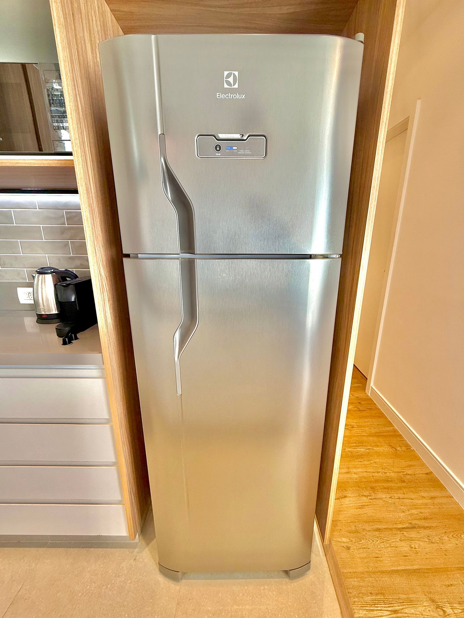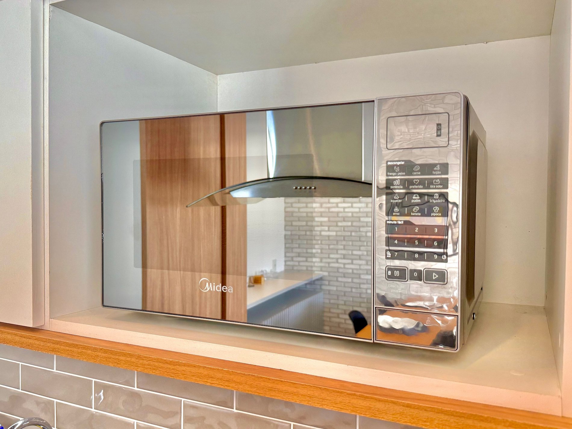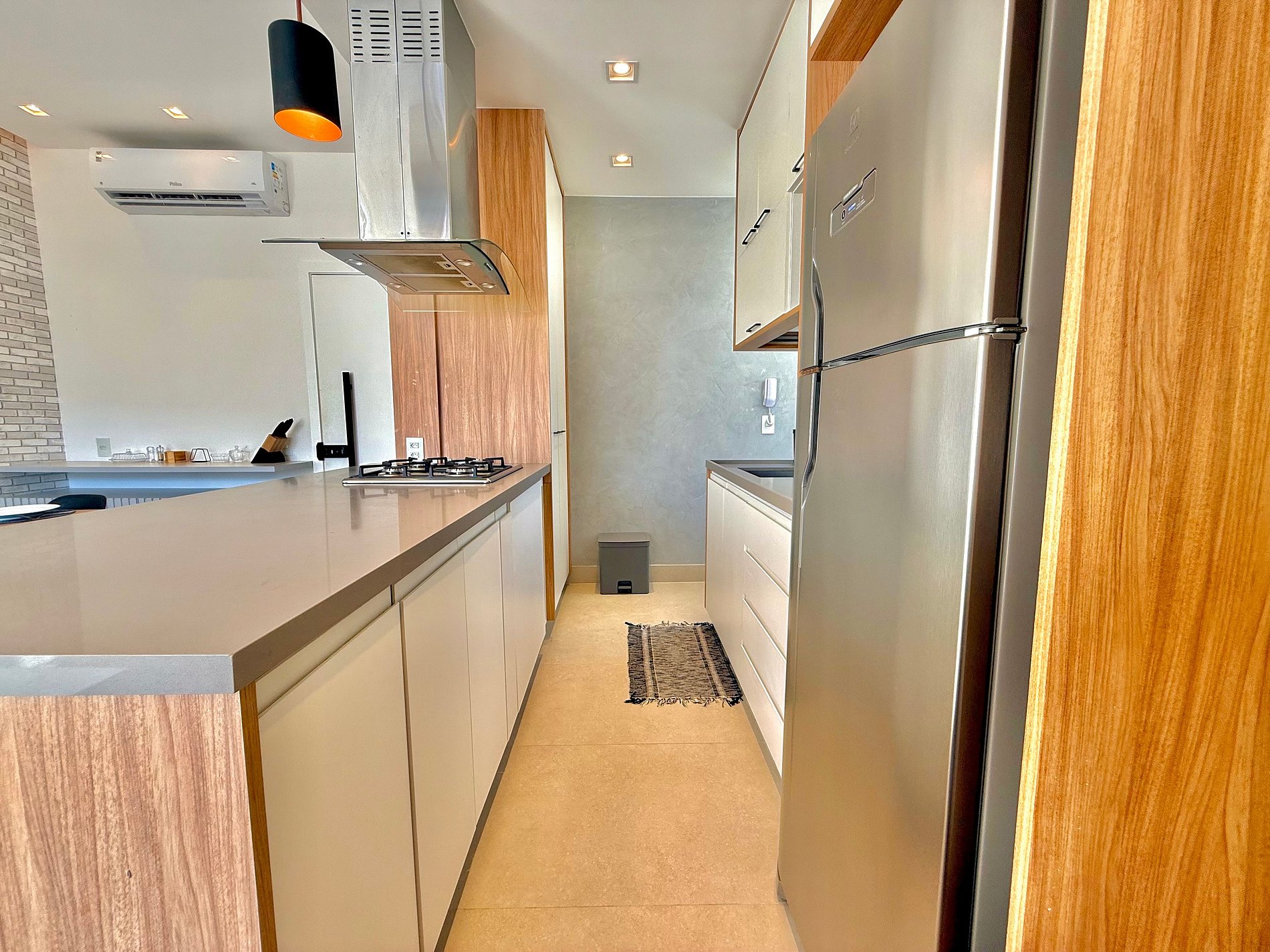 A cozinha é totalmente equipada: geladeira, freezer, fogão, microondas, máquina de café, cafeteira Nespresso, chaleira elétrica, Airfryer, filtro de água, liquidificador, sanduicheira e utensílios variados para preparar suas refeições.