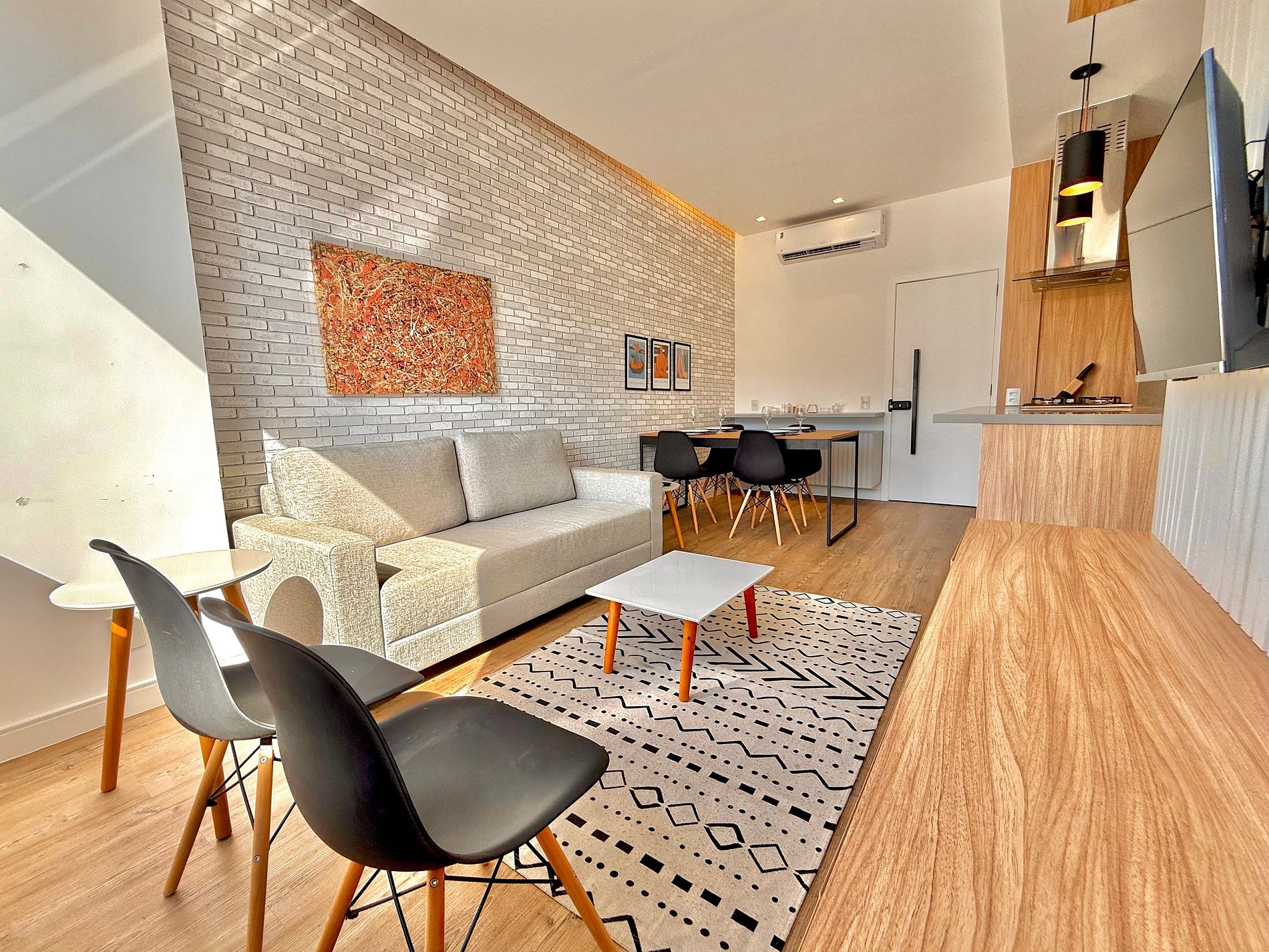 A sala de estar tem um sofá confortável, TV Smart, mesa de refeições para 4 pessoas e ar condicionado. Ideal para ter momentos especiais de lazer e também de trabalho.