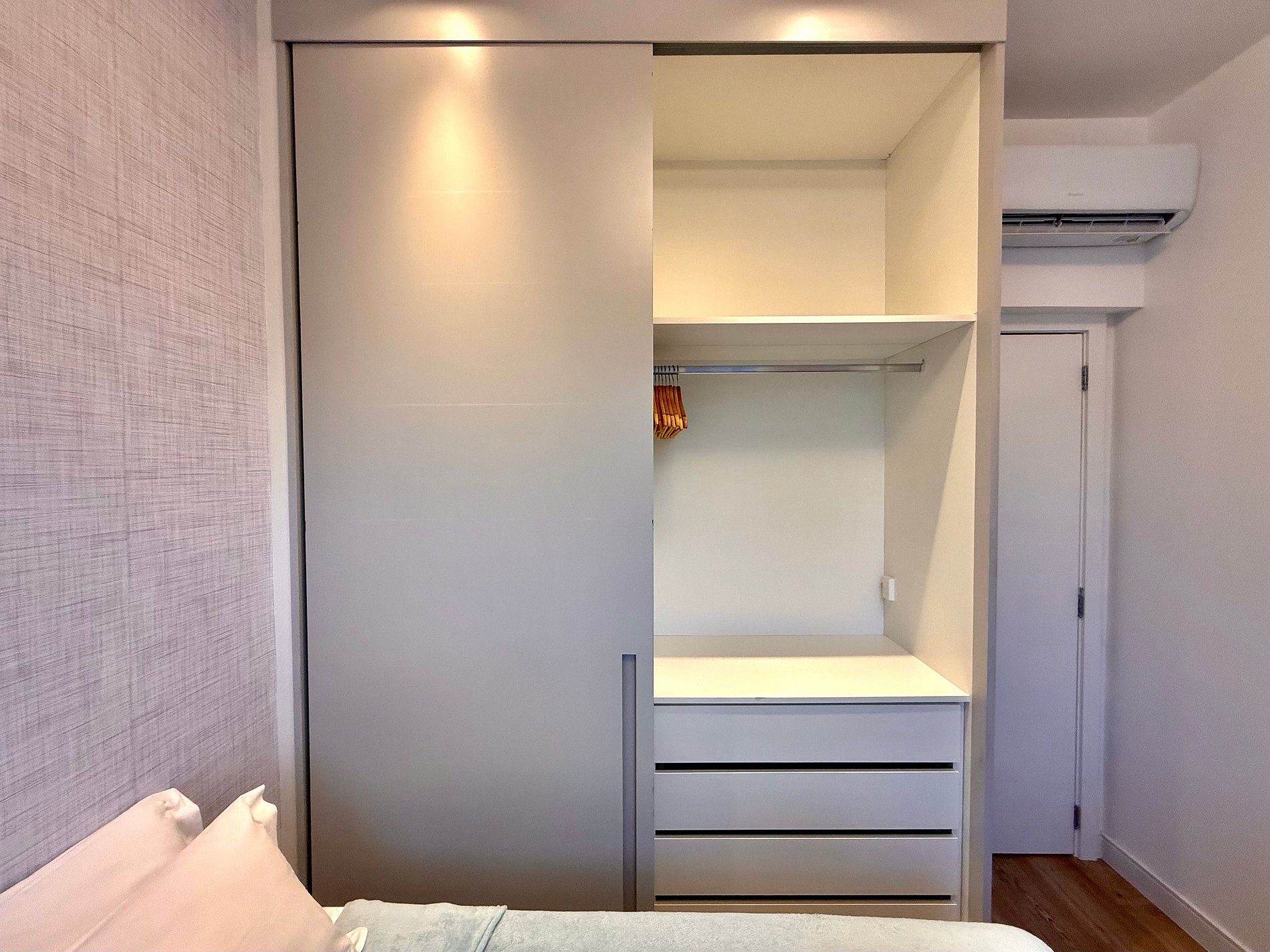 A suíte conta com cama queen, armário, closet, cortina com blackout e ar condicionado.