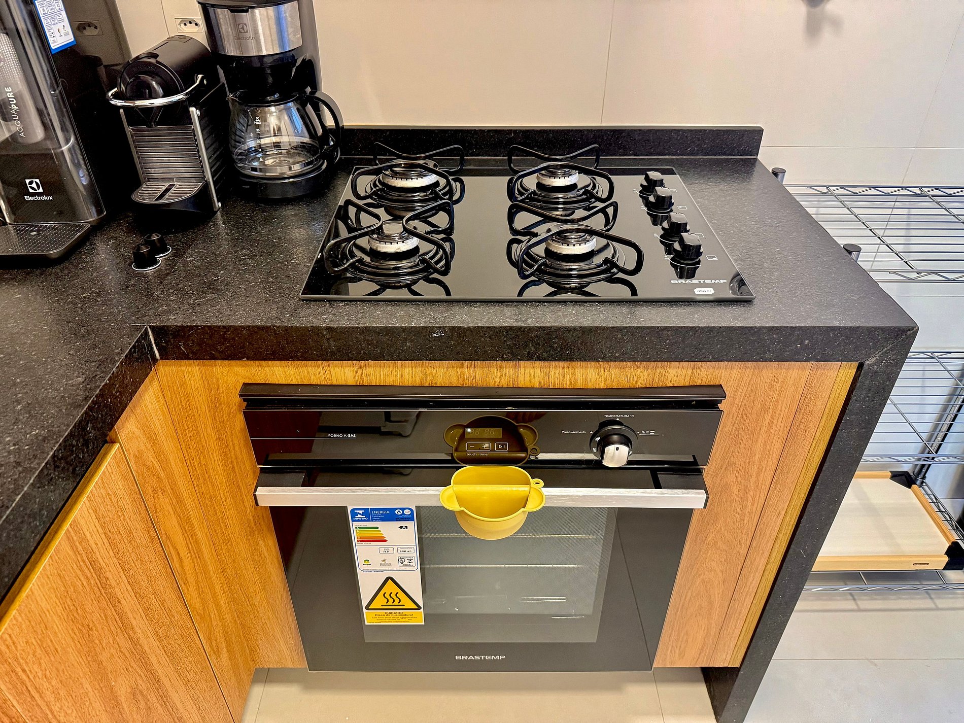 A cozinha é espetacular para quem gosta e/ou precisa cozinhar. Toda completa e equipada com utensílios e eletrodomésticos, como por exemplo geladeira com freezer, fogão, coifa, microondas, forno, máquina de Nespresso, cafeteira elétrica, filtro de água, entre outros.