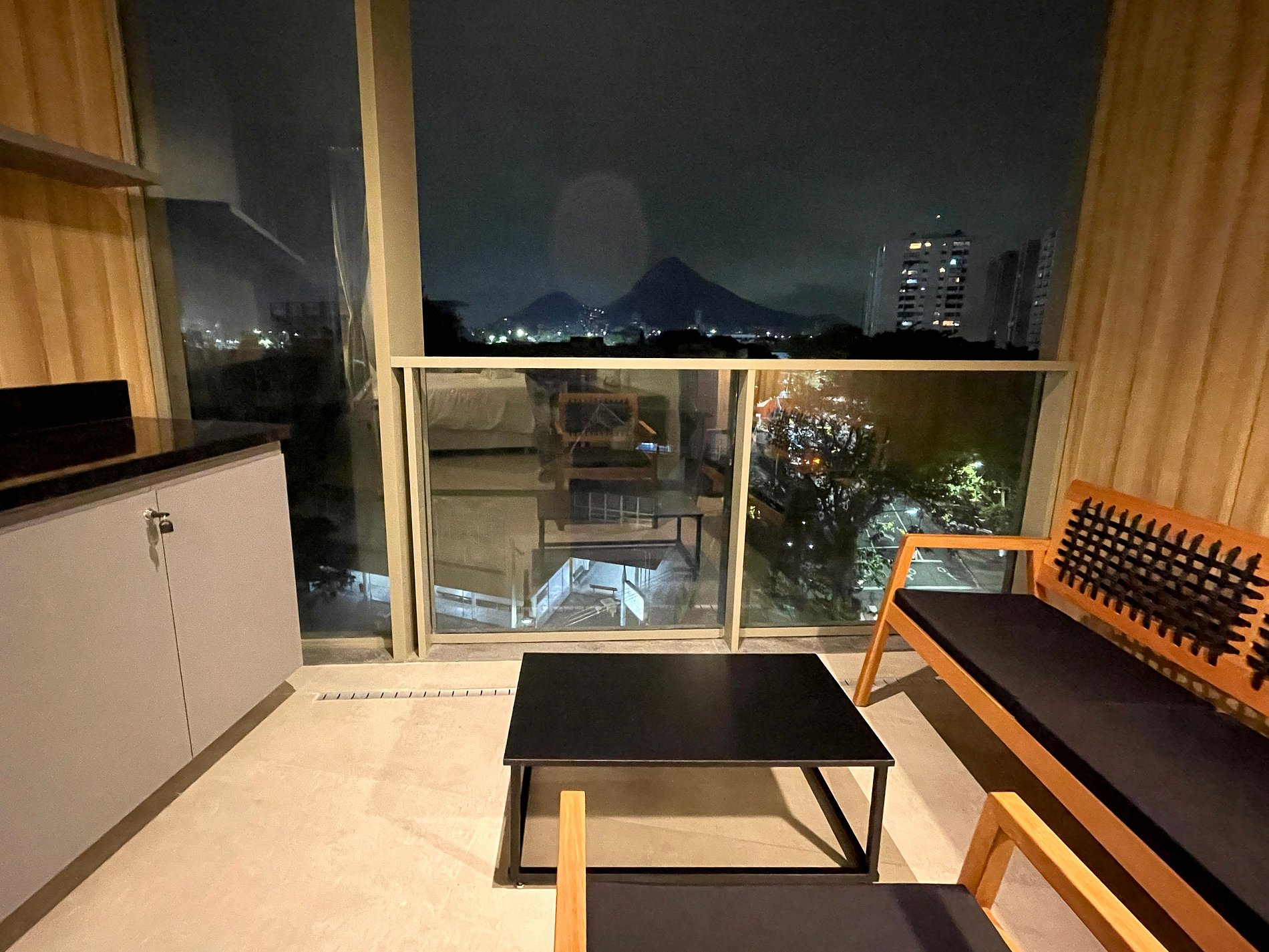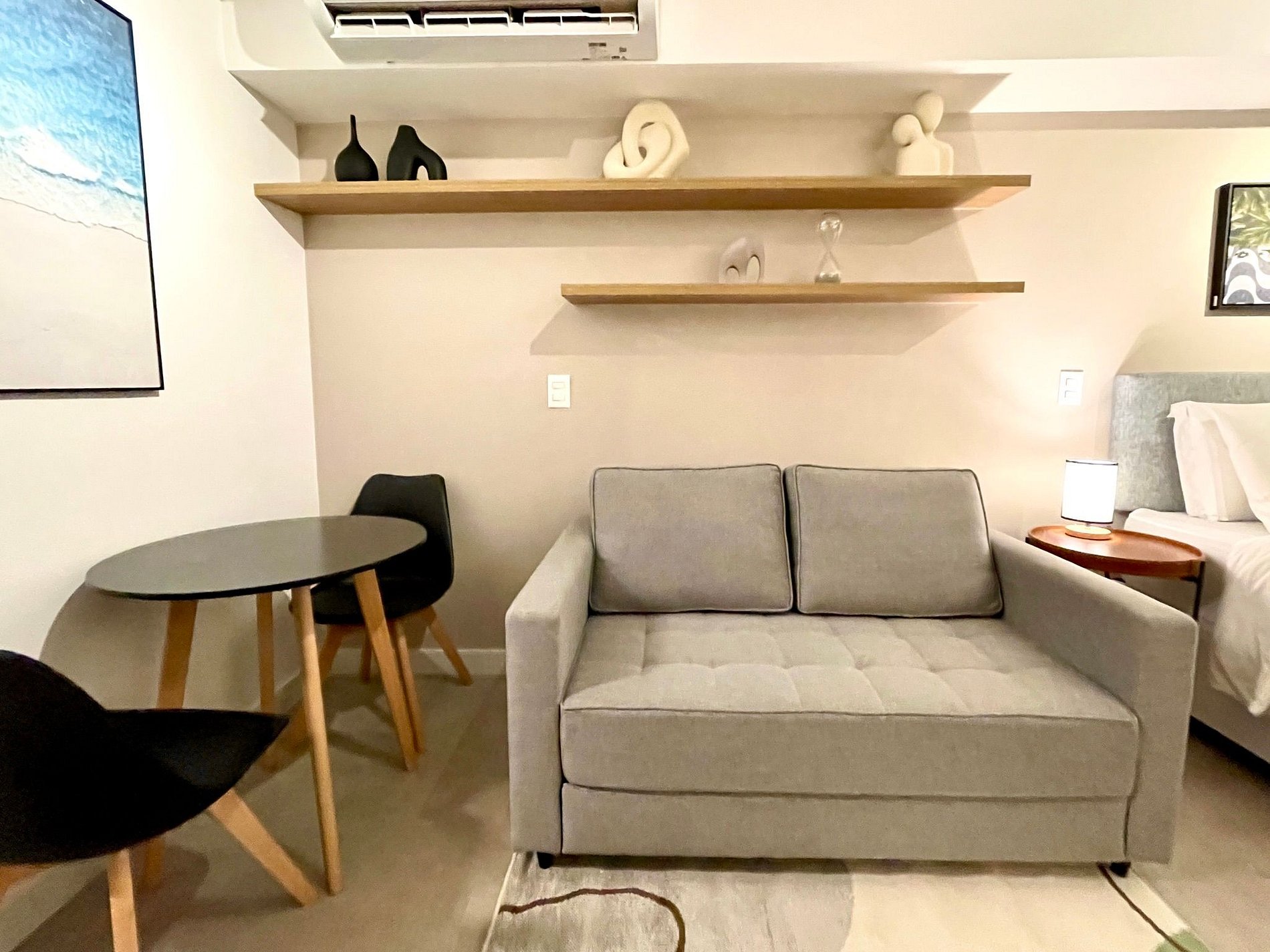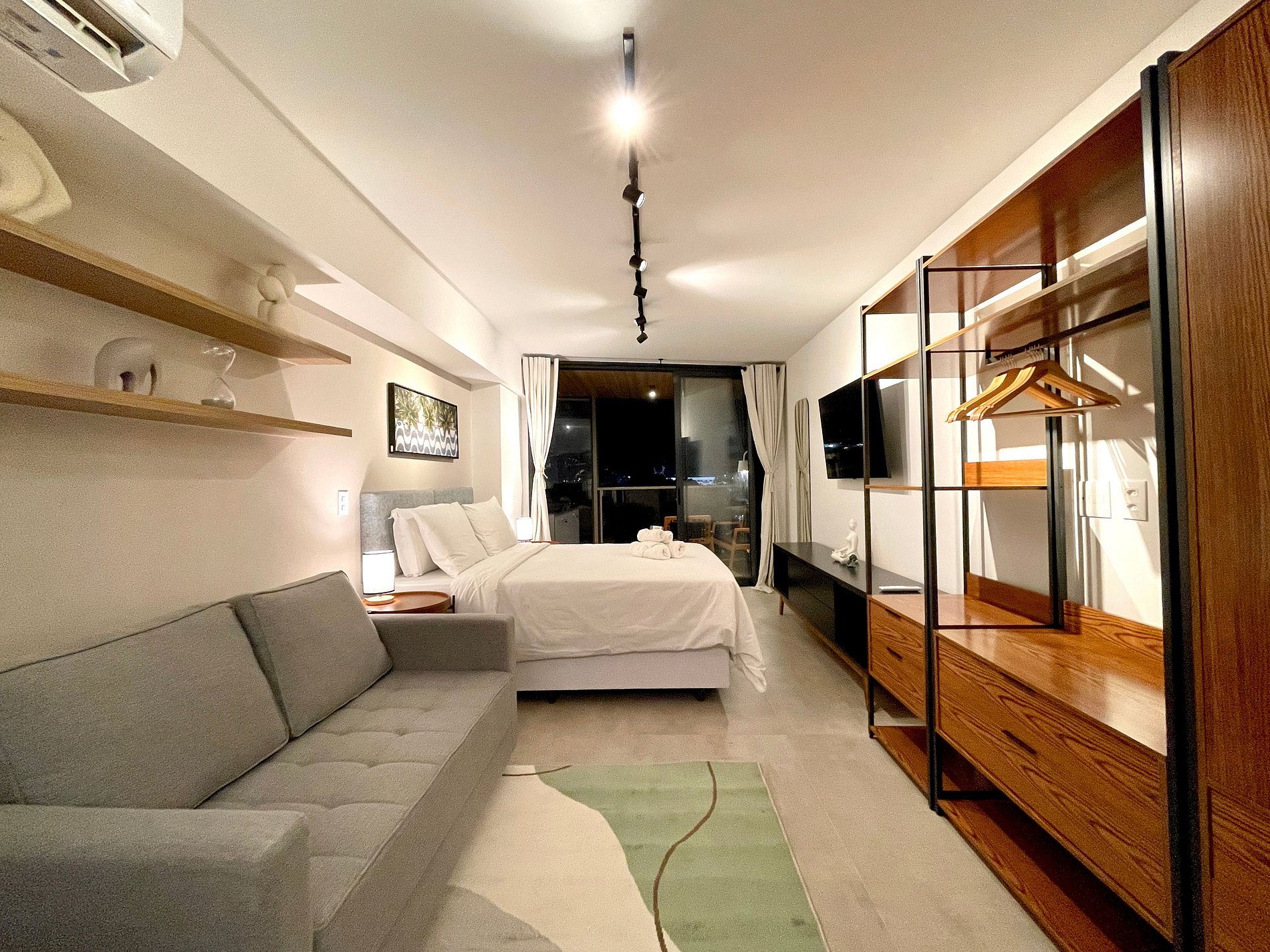 Super pleasant bedroom/living room with sofa bed, queen bed, closets, air conditioning, Smart TV, blackout curtains, dining table, several sockets, in addition to a super charming balcony. High speed internet. Complete bathroom with shower with good pressure. Kitchen equipped with refrigerator, cooktop, microwave, Nespresso machine, Airfryer, water filter and various utensils. It also offers other amenities, such as a portable crib, hairdryer, ironing board and iron and amenities kit (shampoo, conditioner and soap).