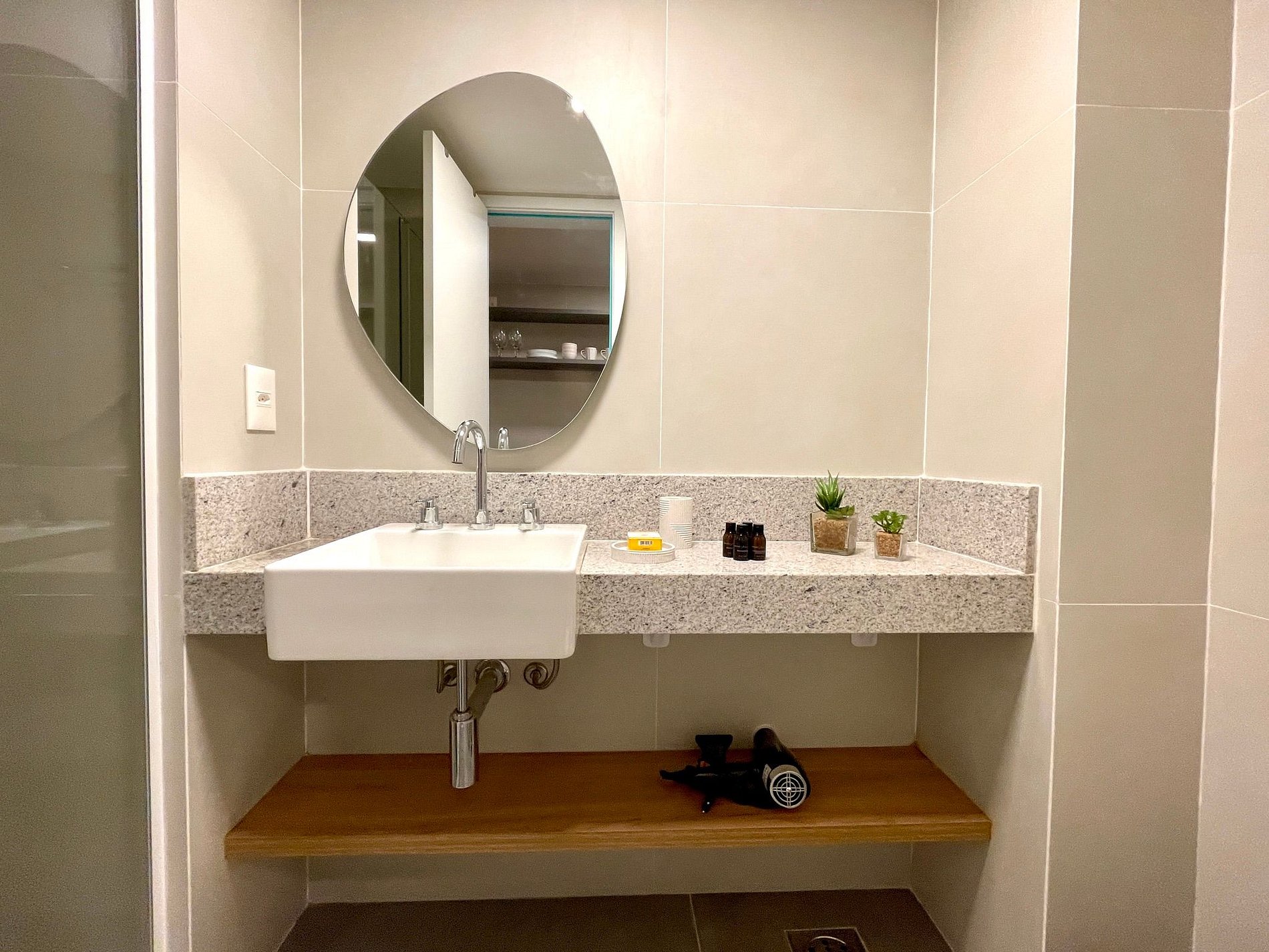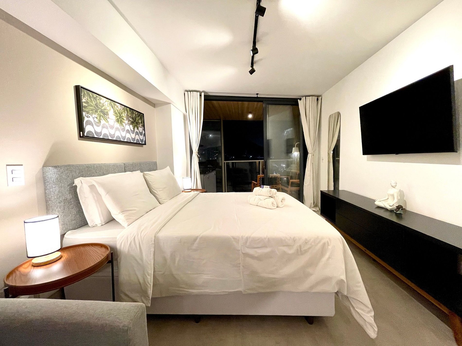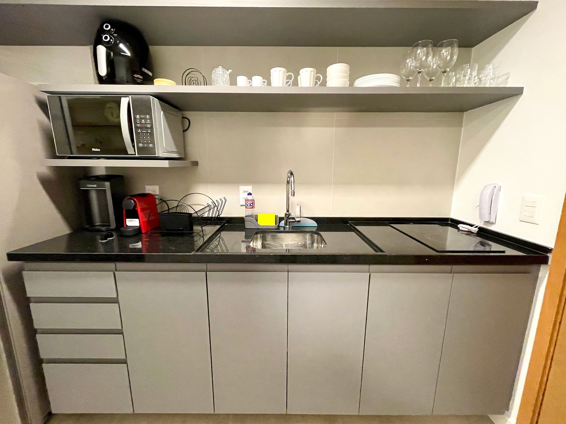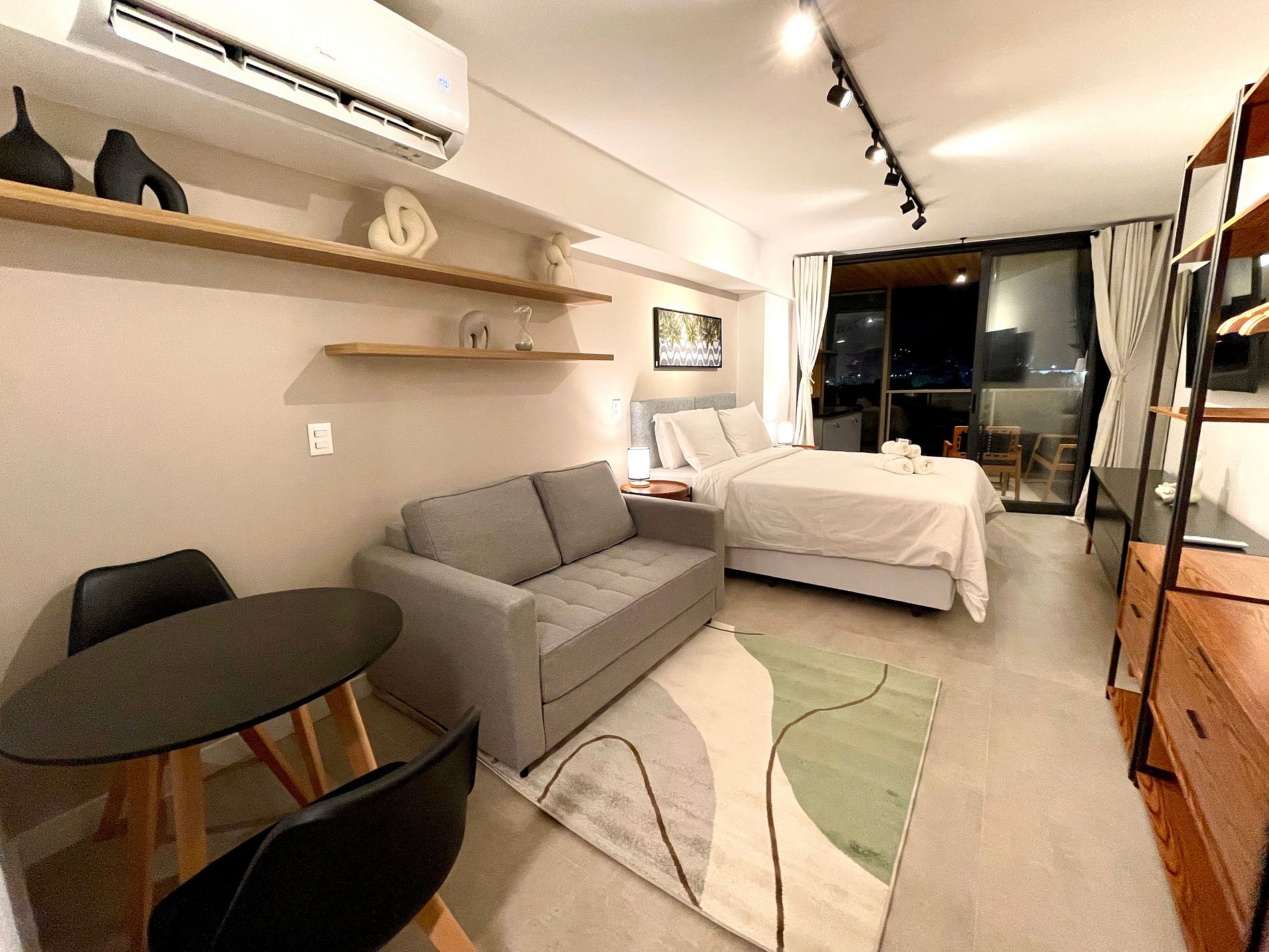 Super pleasant bedroom/living room with sofa bed, queen bed, closets, air conditioning, Smart TV, blackout curtains, dining table, several sockets, in addition to a super charming balcony. High speed internet. Complete bathroom with shower with good pressure. Kitchen equipped with refrigerator, cooktop, microwave, Nespresso machine, Airfryer, water filter and various utensils. It also offers other amenities, such as a portable crib, hairdryer, ironing board and iron and amenities kit (shampoo, conditioner and soap).