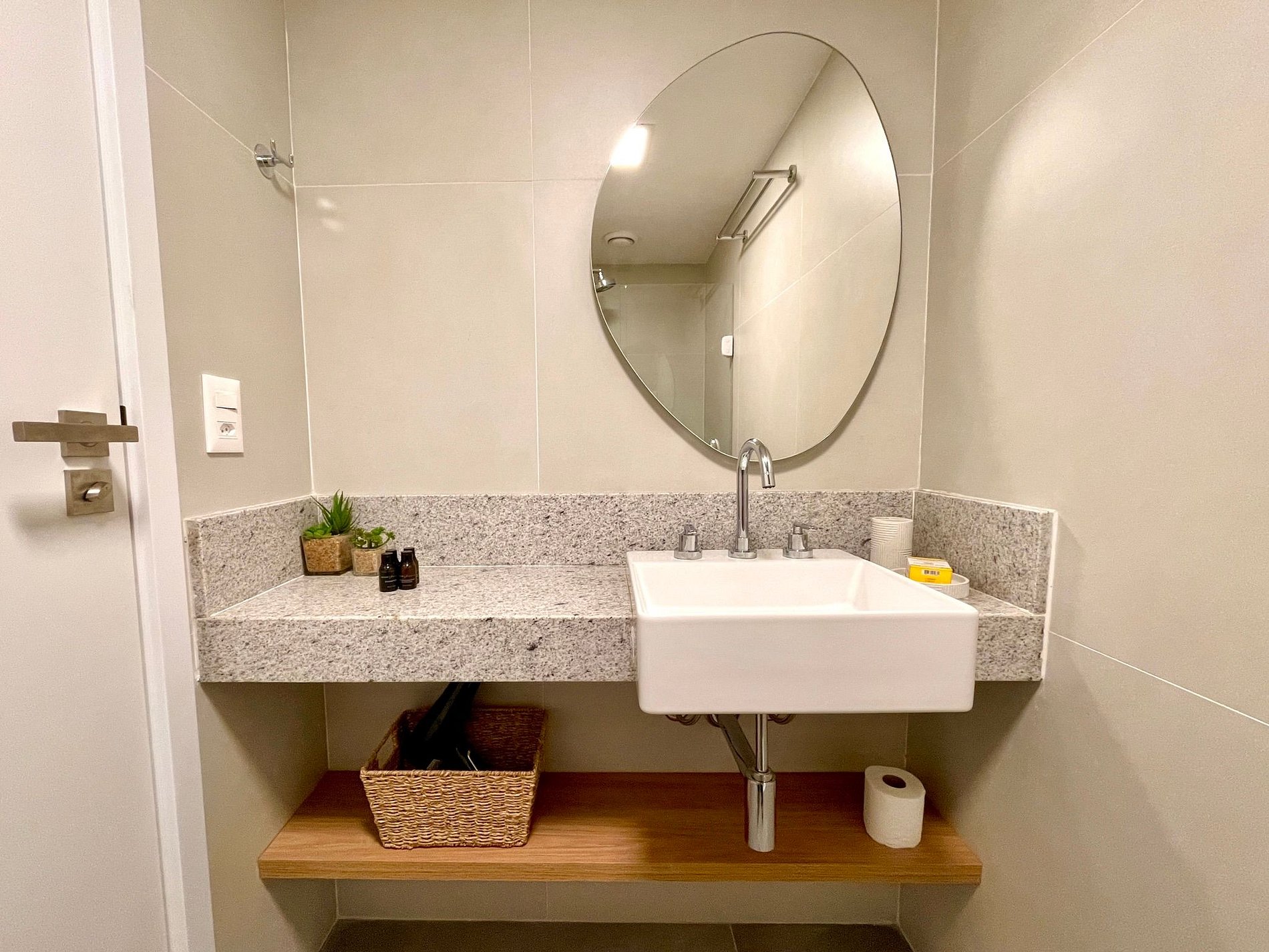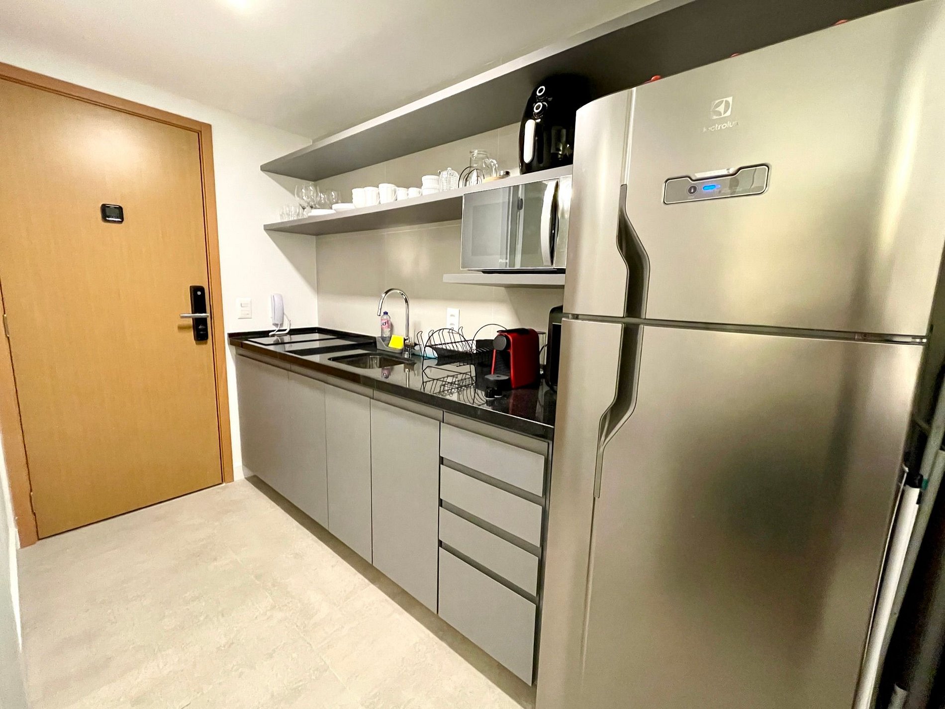 Super pleasant bedroom/living room with sofa bed, queen bed, closets, air conditioning, Smart TV, blackout curtains, dining table, several sockets, in addition to a super charming balcony. High speed internet. Complete bathroom with shower with good pressure. Kitchen equipped with refrigerator, cooktop, microwave, Nespresso machine, Airfryer, water filter and various utensils. It also offers other amenities, such as a portable crib, hairdryer, ironing board and iron and amenities kit (shampoo, conditioner and soap).