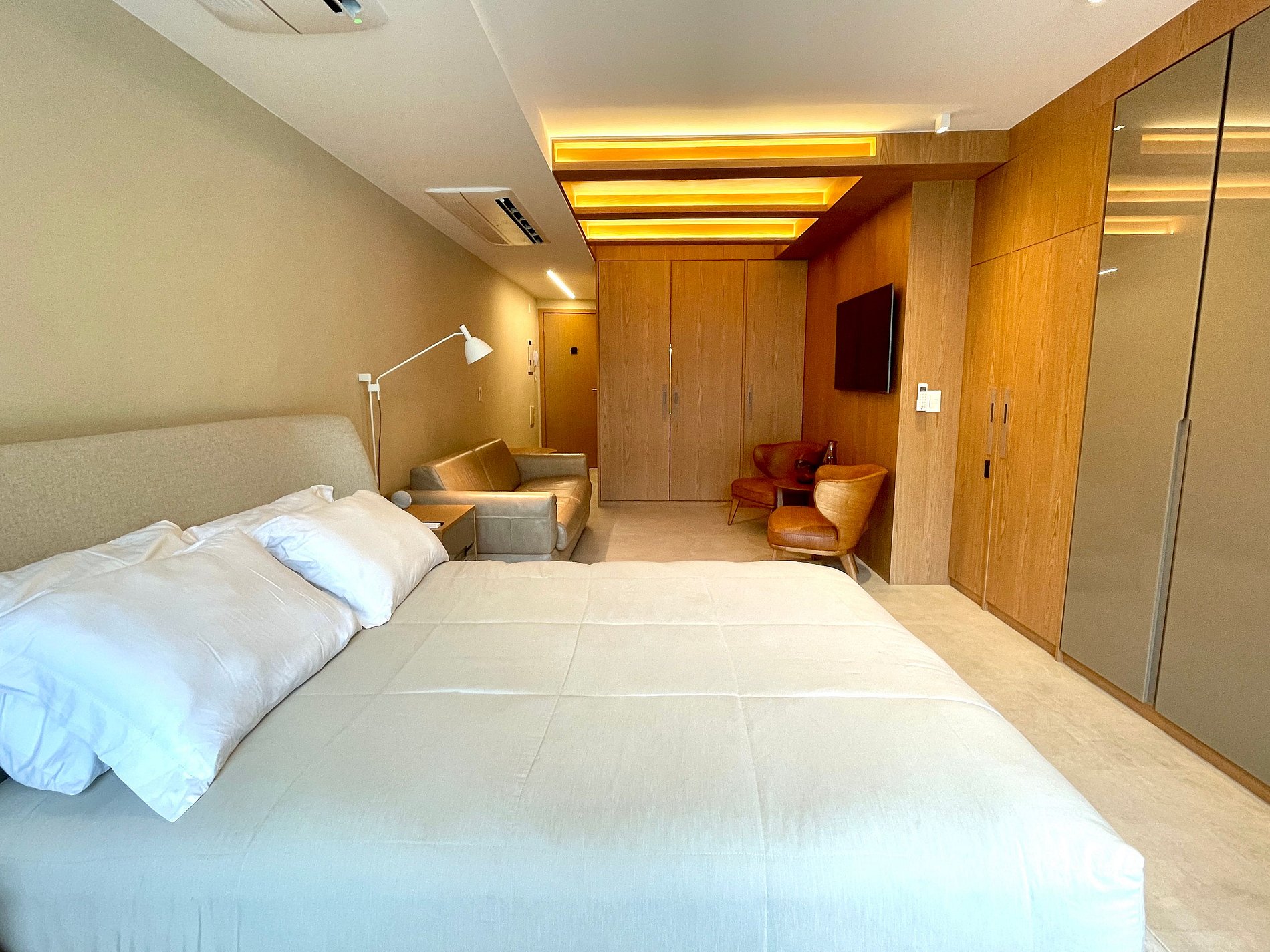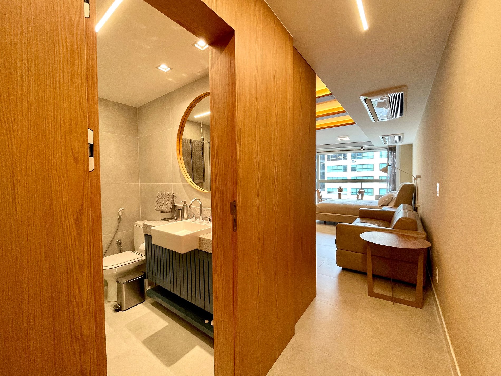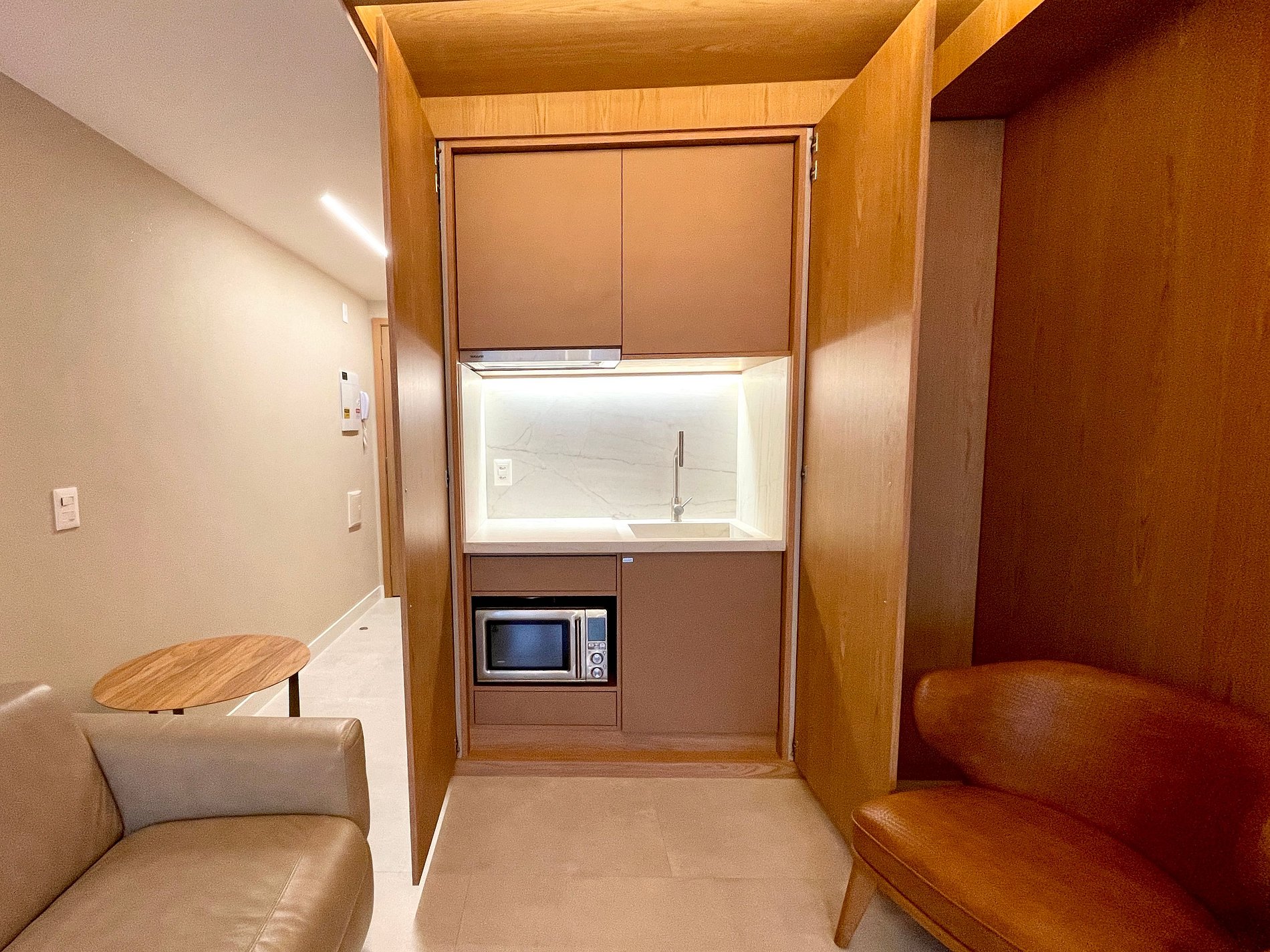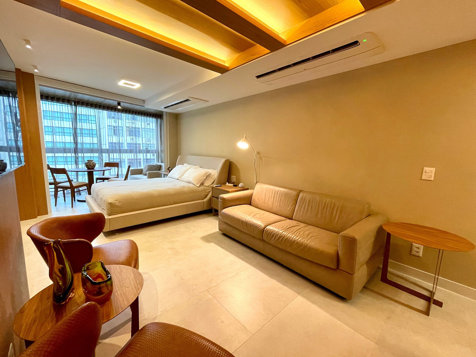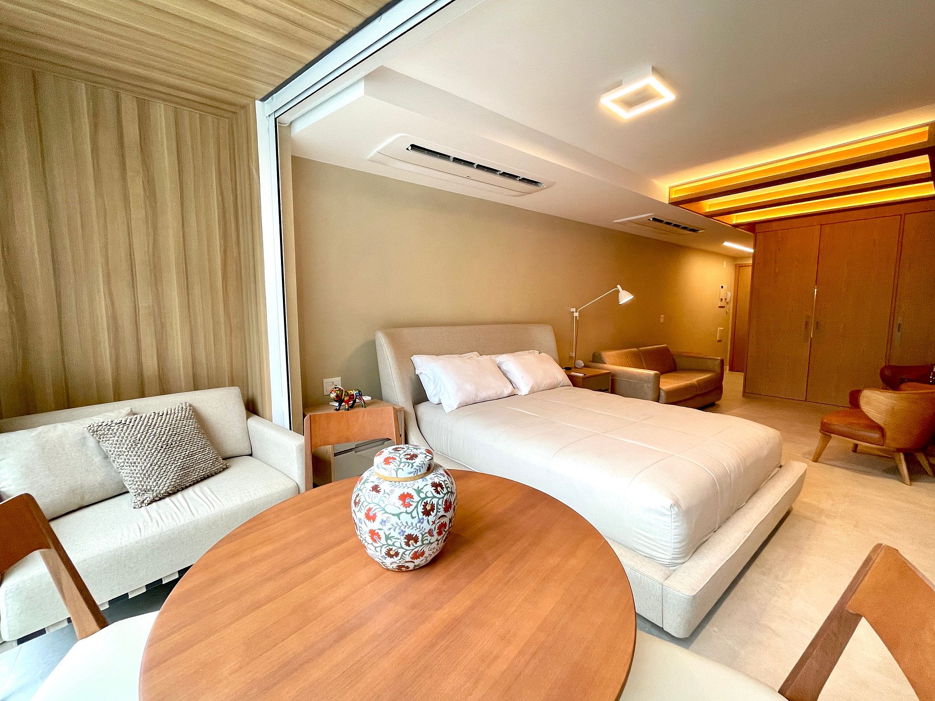 Quarto/sala super agradável com sofá-cama de couro, 2 poltronas, cama queen moderna e confortável, diversos armários, 2 aparelhos de ar condicionado potentes, Smart TV, cortina blackout automatizada, mesa de jantar, diversas tomadas, além de contar com uma varanda super charmosa. Internet de alta velocidade. Banheiro todo completo, com toalheiro térmico e com chuveiro com boa pressão. Cozinha equipada com geladeira, cooktop, microondas, máquina de Nespresso, forno com multifunções, máquina de lavar louças e diversos outros utensílios de primeira linha. Oferece também outras comodidades, como berço portátil*, secador de cabelo, tábua e ferro de passar roupa e kit de amenities (shampoo, condicionador e sabonete).