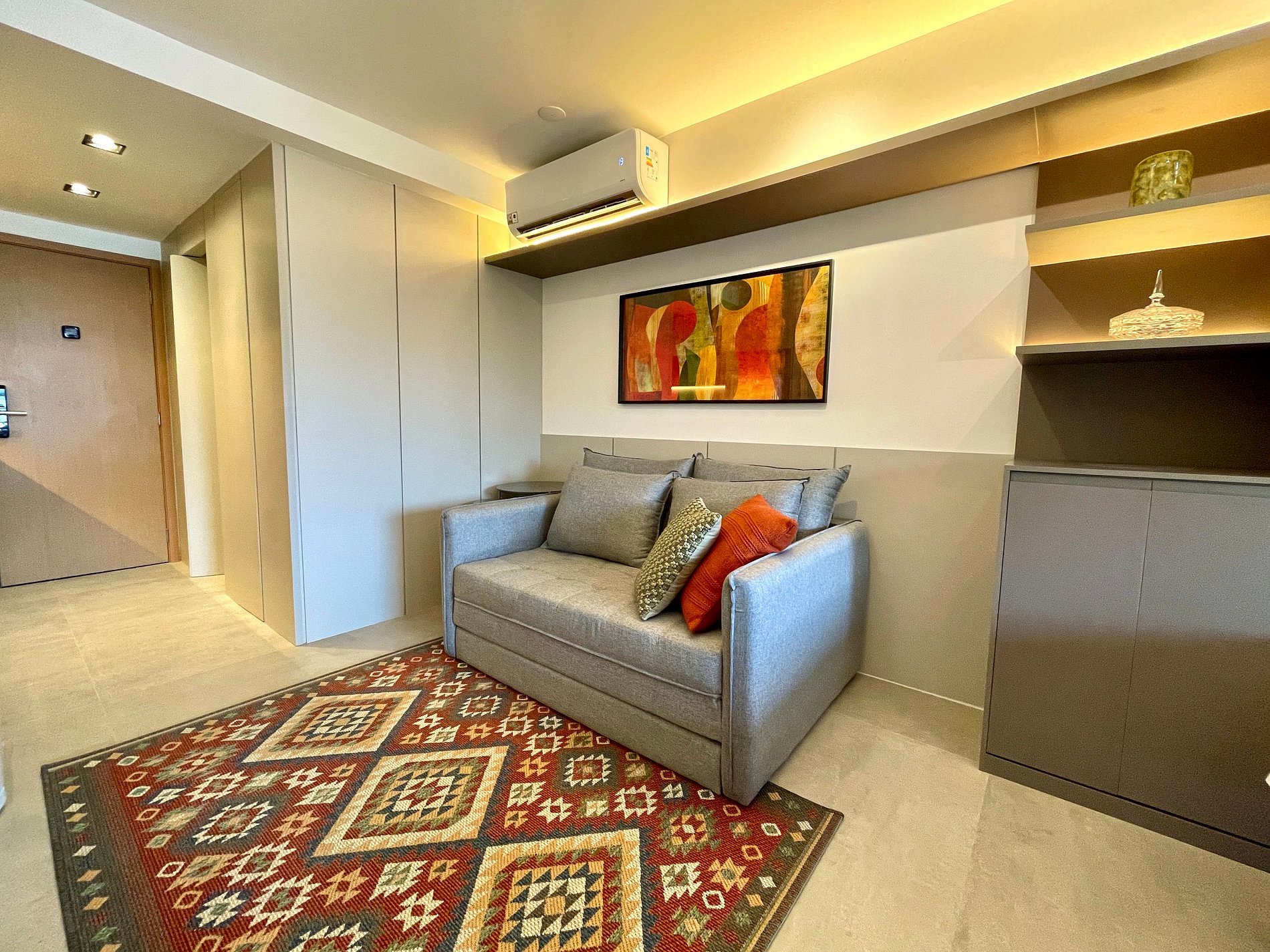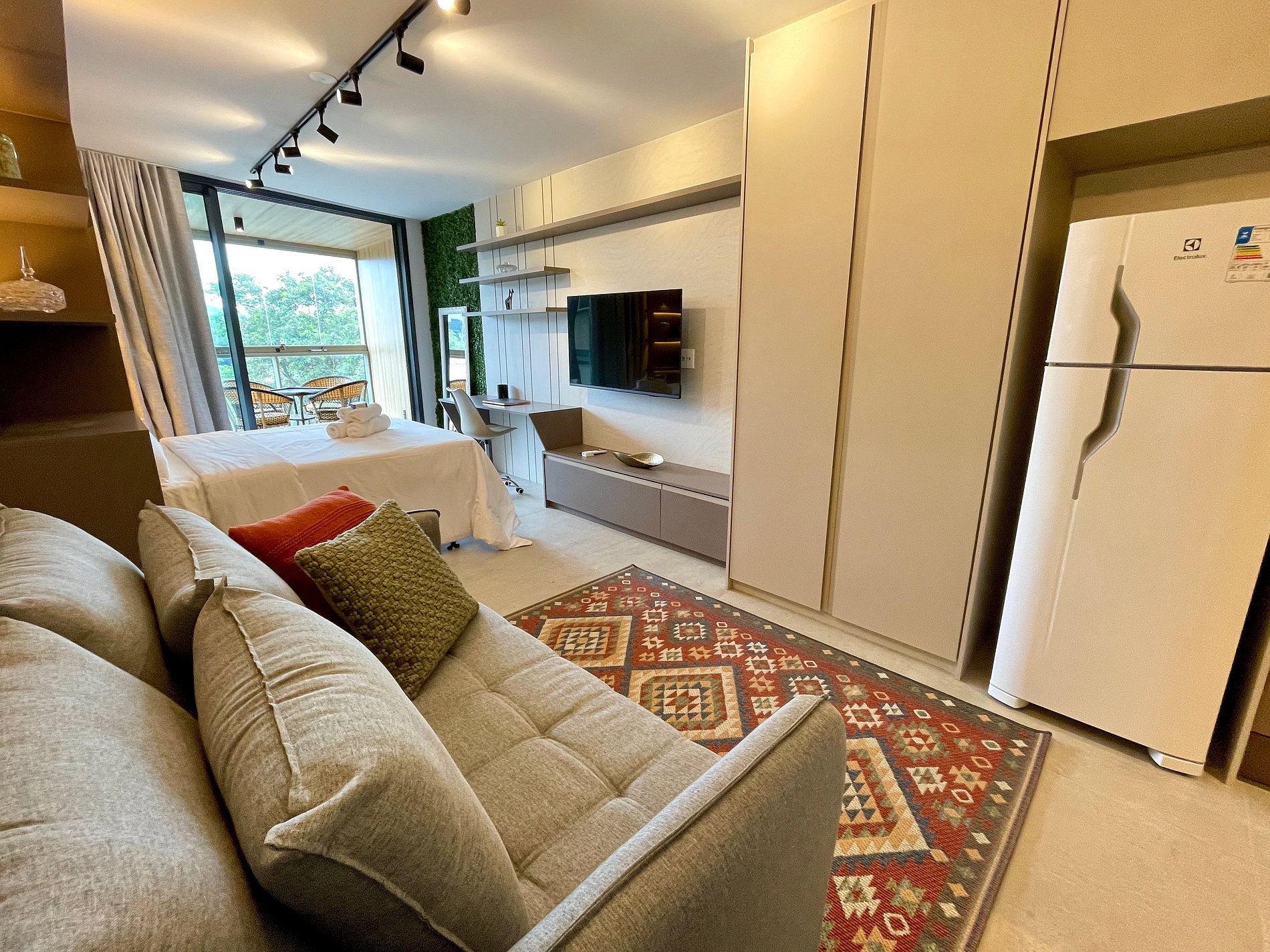 Super pleasant bedroom/living room with sofa bed, double bed, closets, air conditioning, Smart TV, blackout curtains, dining table, several sockets, in addition to a super charming balcony. High speed internet. Complete bathroom with shower with good pressure. Kitchen equipped with refrigerator, cooktop, microwave, Nespresso machine, Airfryer, water filter and various utensils. It also offers other amenities, such as a portable crib, hairdryer, ironing board and iron and amenities kit (shampoo, conditioner and soap).
