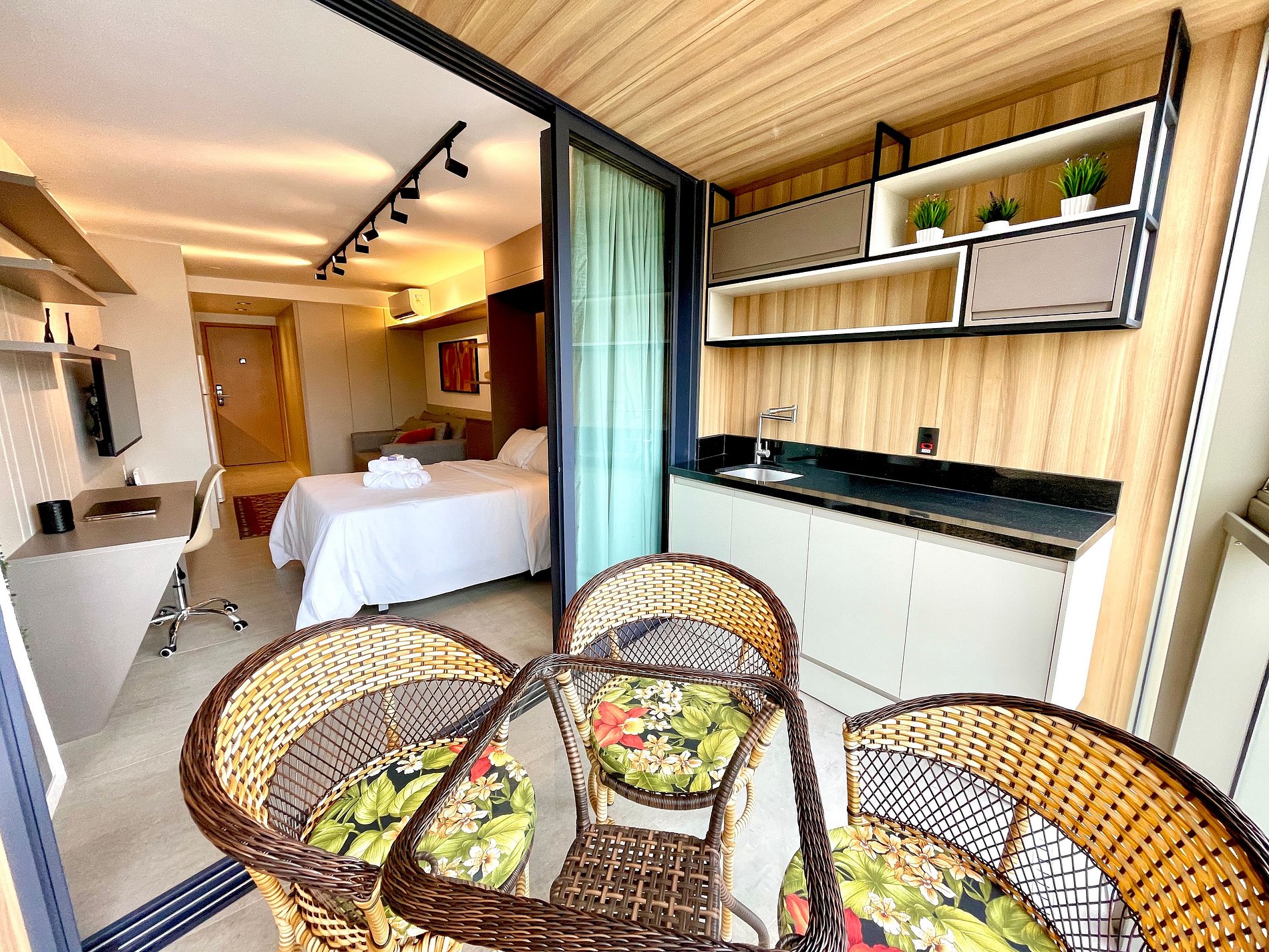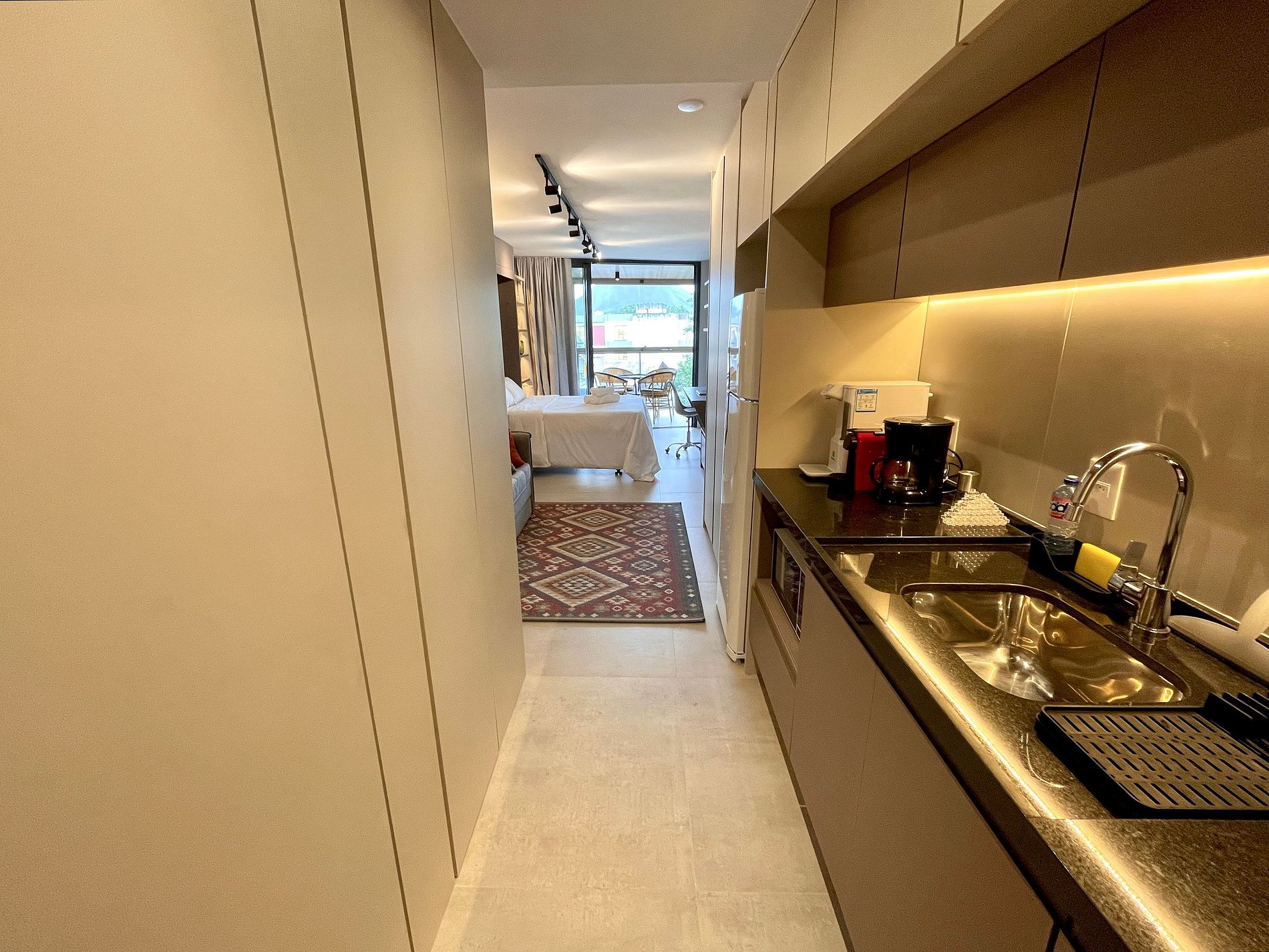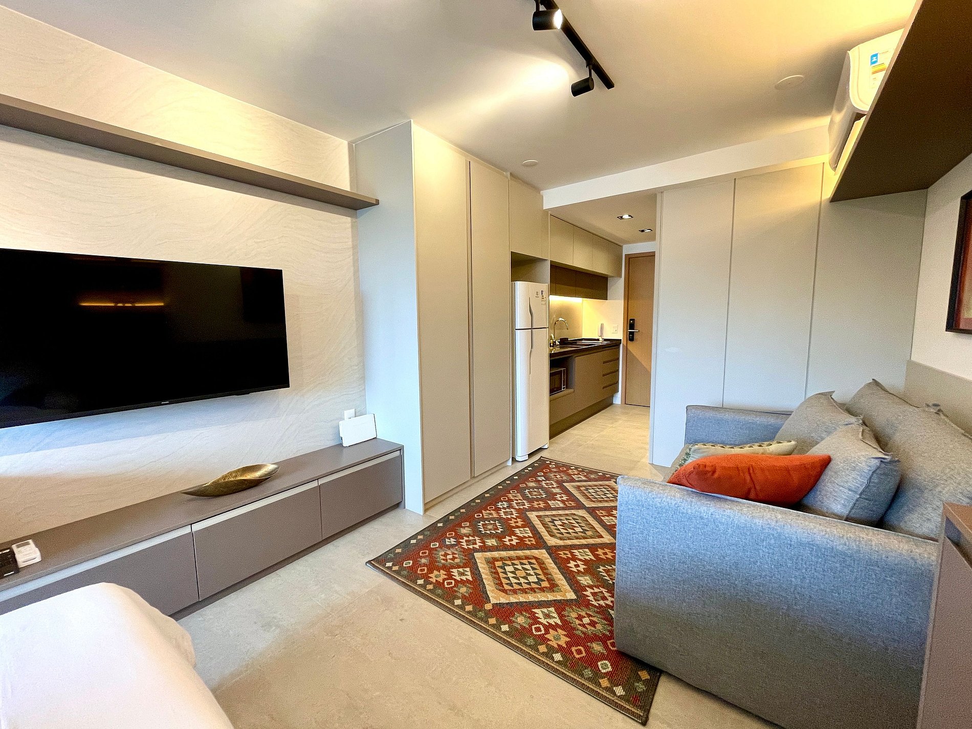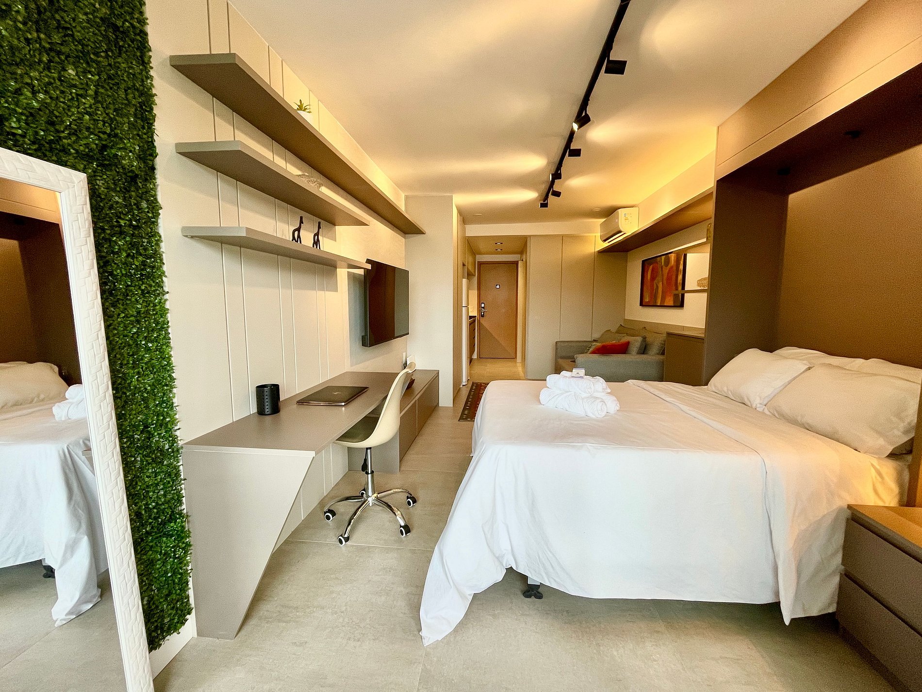 Super pleasant bedroom/living room with sofa bed, double bed, closets, air conditioning, Smart TV, blackout curtains, dining table, several sockets, in addition to a super charming balcony. High speed internet. Complete bathroom with shower with good pressure. Kitchen equipped with refrigerator, cooktop, microwave, Nespresso machine, Airfryer, water filter and various utensils. It also offers other amenities, such as a portable crib, hairdryer, ironing board and iron and amenities kit (shampoo, conditioner and soap).