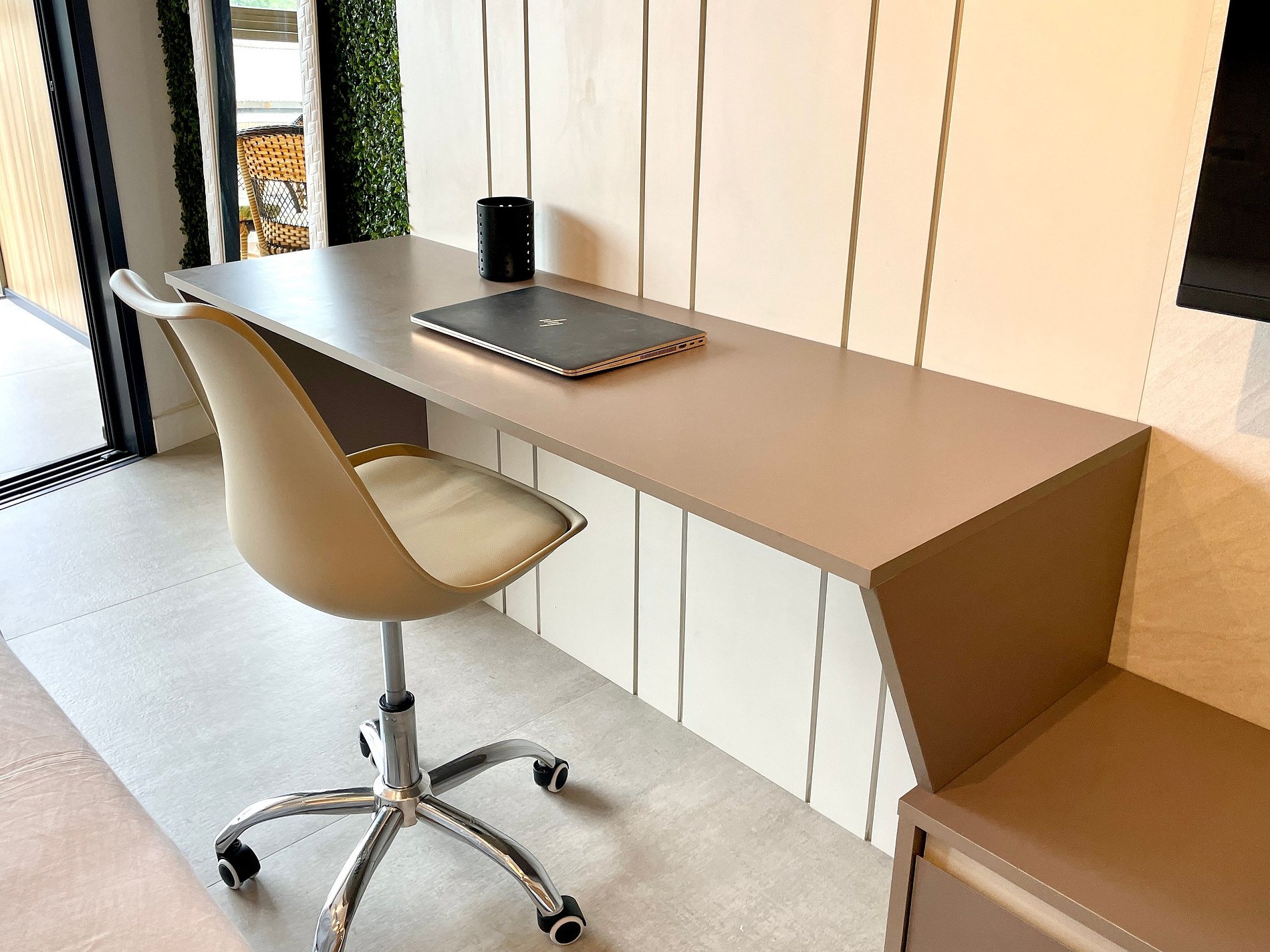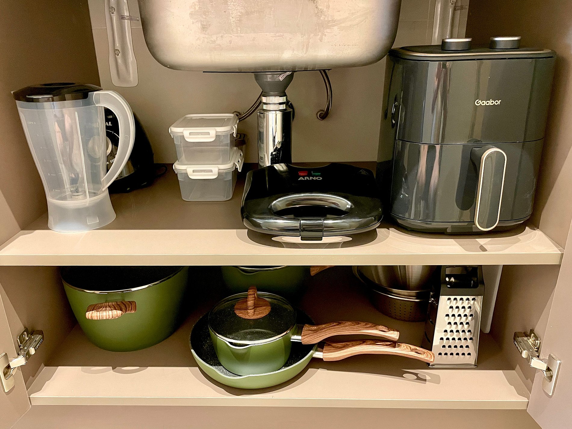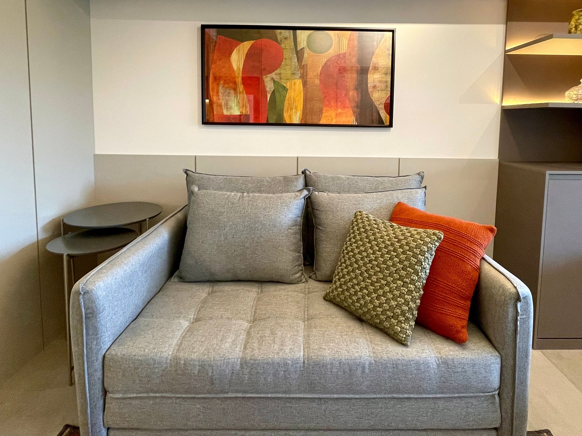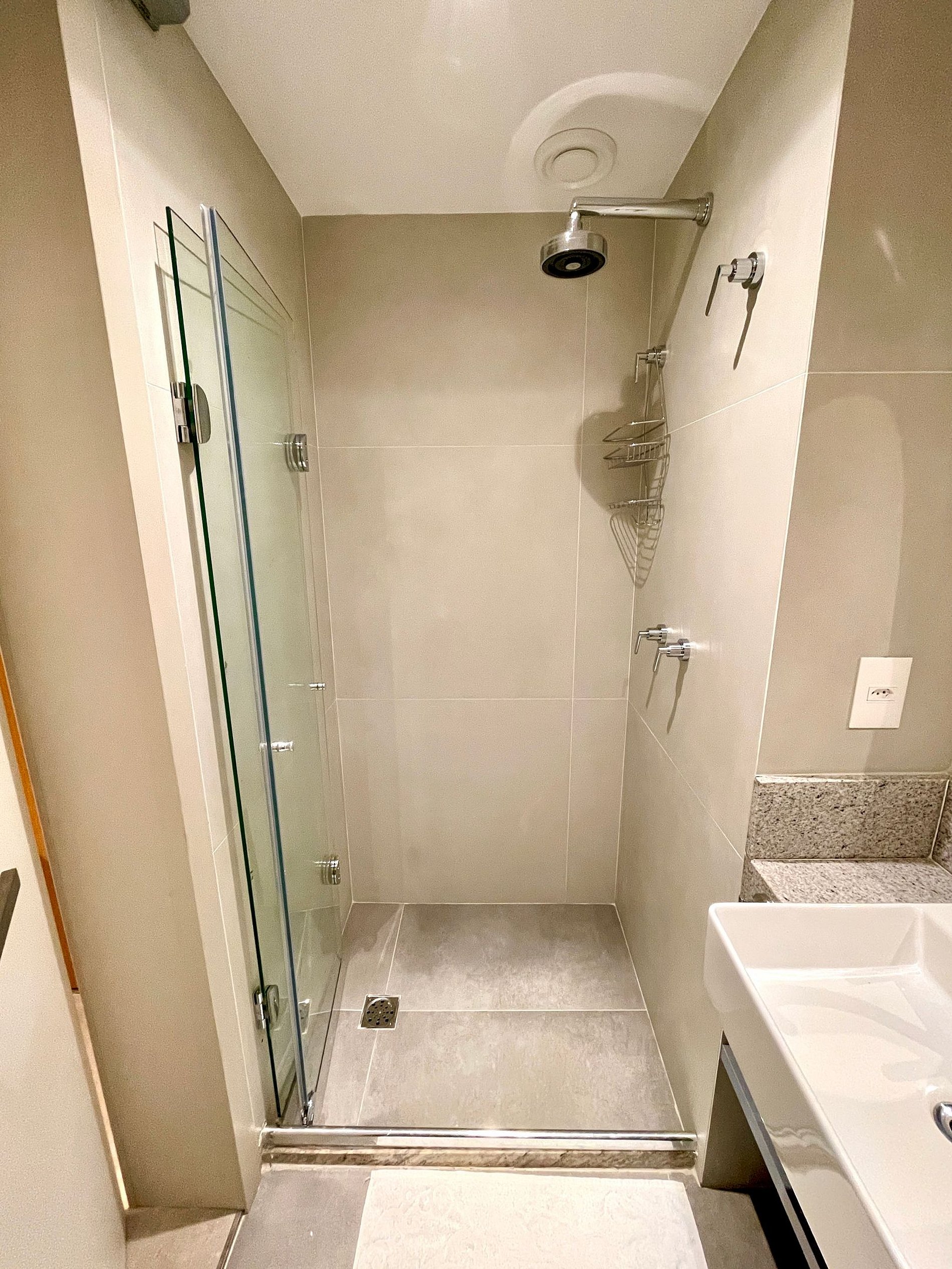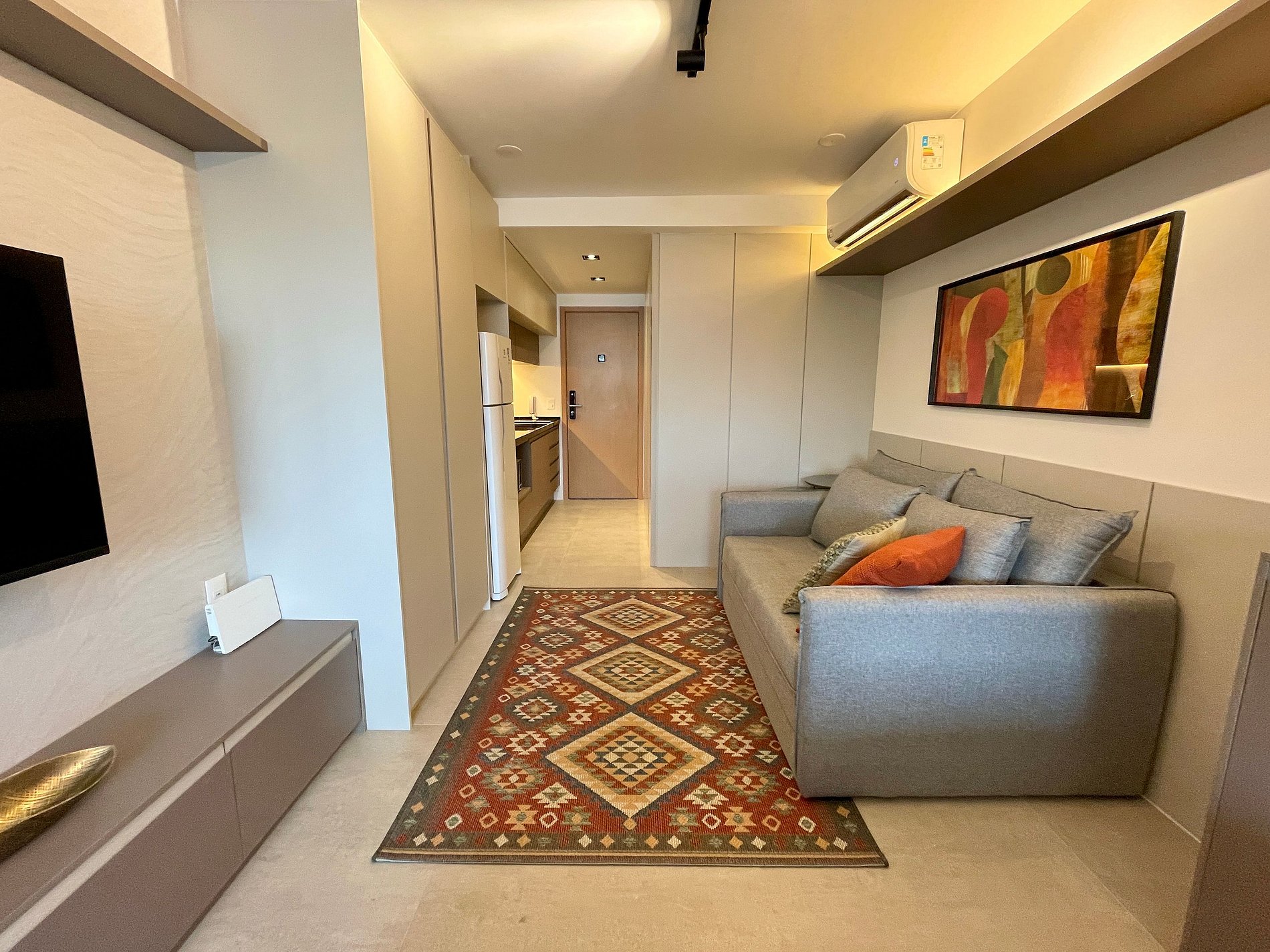 Super pleasant bedroom/living room with sofa bed, double bed, closets, air conditioning, Smart TV, blackout curtains, dining table, several sockets, in addition to a super charming balcony. High speed internet. Complete bathroom with shower with good pressure. Kitchen equipped with refrigerator, cooktop, microwave, Nespresso machine, Airfryer, water filter and various utensils. It also offers other amenities, such as a portable crib, hairdryer, ironing board and iron and amenities kit (shampoo, conditioner and soap).