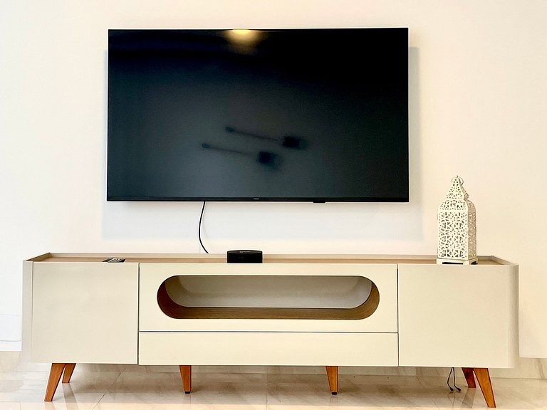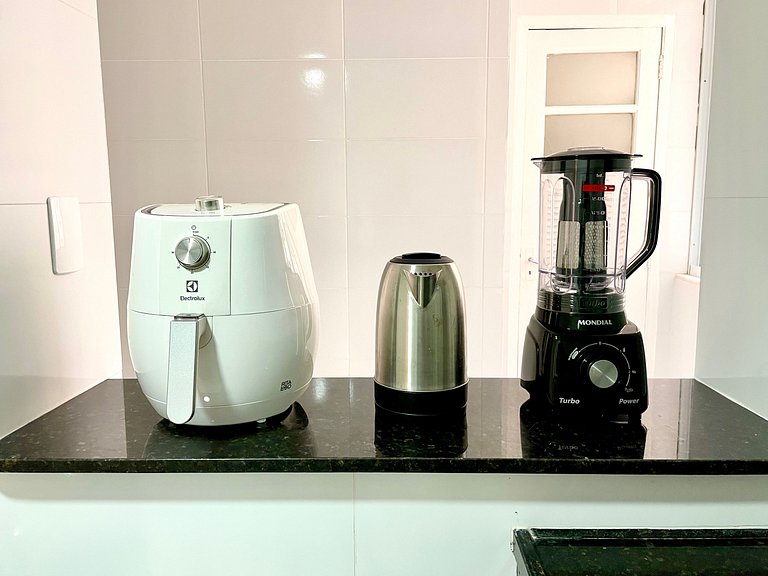 Sala ampla e agradável com vista para a Praia de Copacabana, ar condicionado e Smart TV de 65 polegadas, dividida em sala de estar e sala de jantar. Internet de alta velocidade. Uma suíte com cama queen e banheiro completo, além de um segundo quarto com cama de casal, que também tem vista para a Praia de Copacabana. Tem um segundo banheiro completo no corredor para atender o segundo quarto. Todos os quartos são muito espaçosos e possuem aparelhos de ar condicionado, armários, cabides, cortinas com blackout, mesas de cabeceira e luminárias. Cozinha toda equipada com geladeira, fogão, forno, microondas, cafeteira elétrica, Airfryer, filtro de água e diversos utensílios. Área de serviço com tanque e varal para secar roupas. O apartamento também oferece outras comodidades como berço portátil*, secador de cabelo, tábua e ferro de passar roupa e kit de amenities (shampoo, condicionador e sabonete).