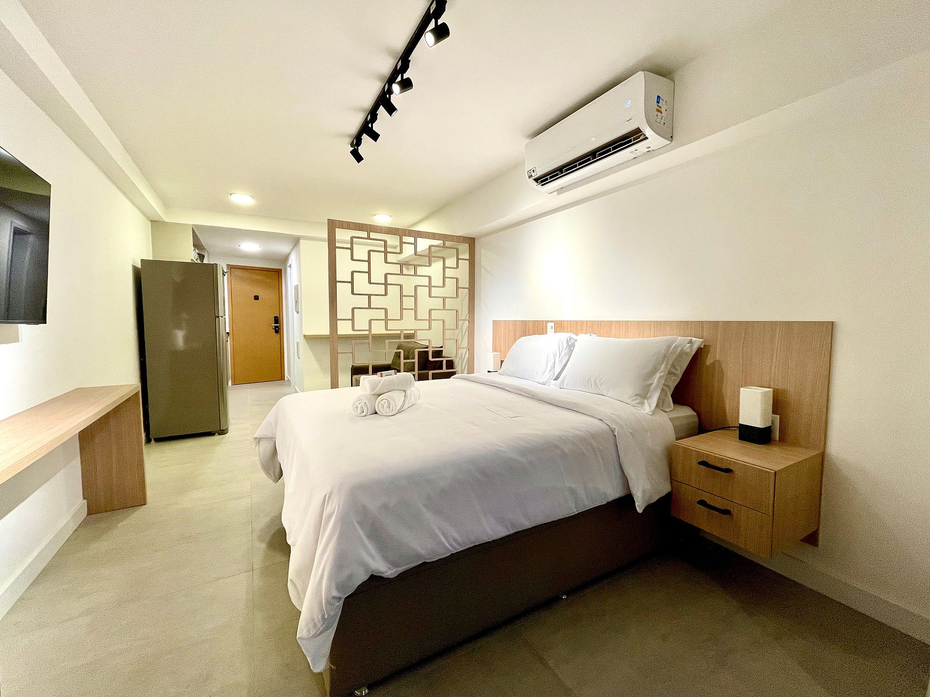 Super nice studio with a comfortable queen size bed, single sofa bed, closets, powerful air conditioning, a 50 inch Smart TV, blackout curtains, a dining table, and plenty of outlets. It also features a charming balcony with views of Christ the Redeemer, the mountains, and the street. High speed internet access is available. The bathroom is fully equipped with a shower with good pressure. The kitchen is equipped with a refrigerator, cooktop, hood, microwave, Nespresso machine, Airfryer and various utensils. Other amenities include a portable crib*, hairdryer, steamer and amenities kit (shampoo, conditioner and soap).