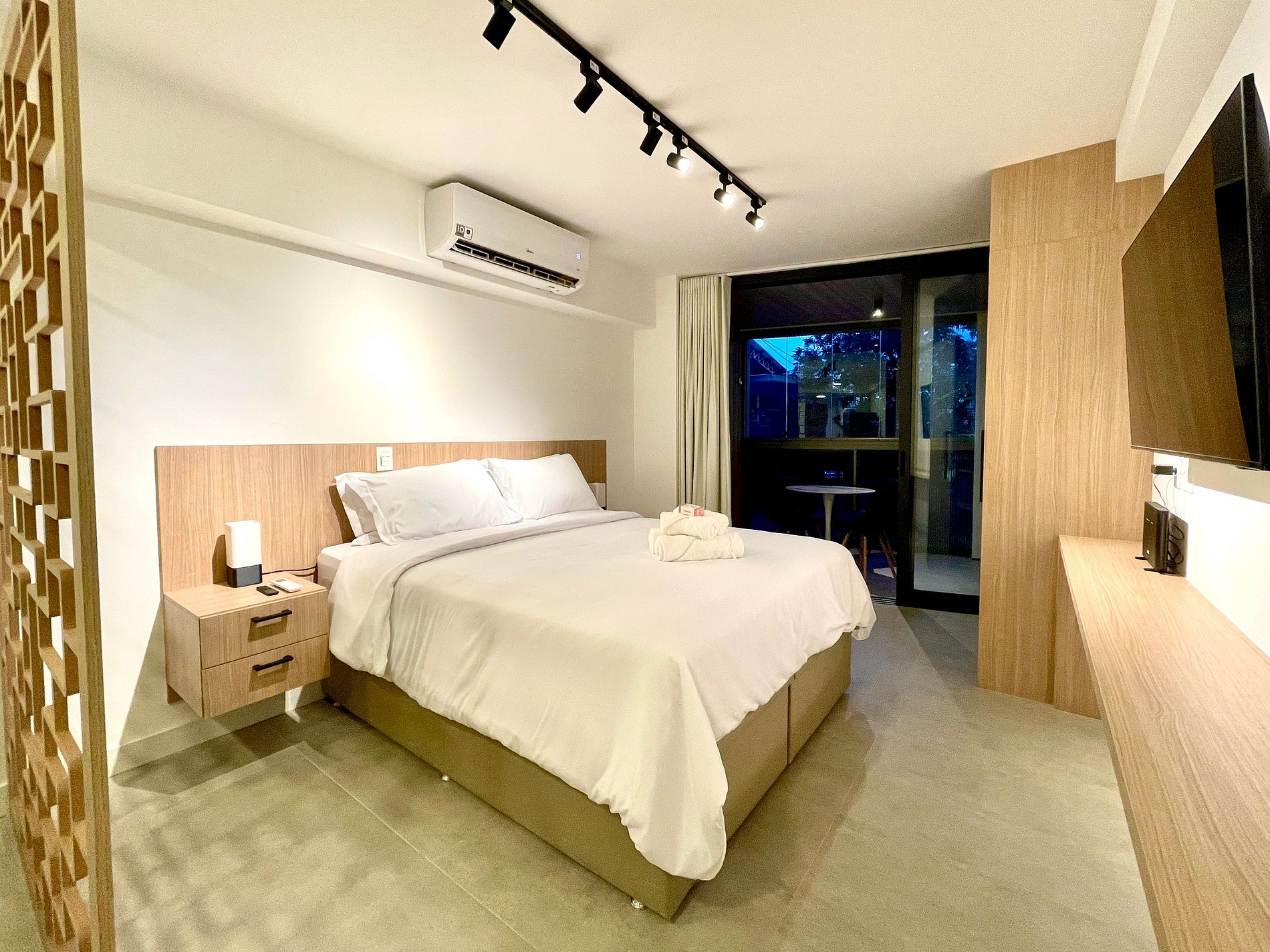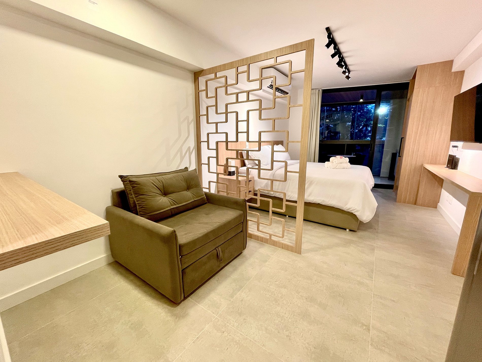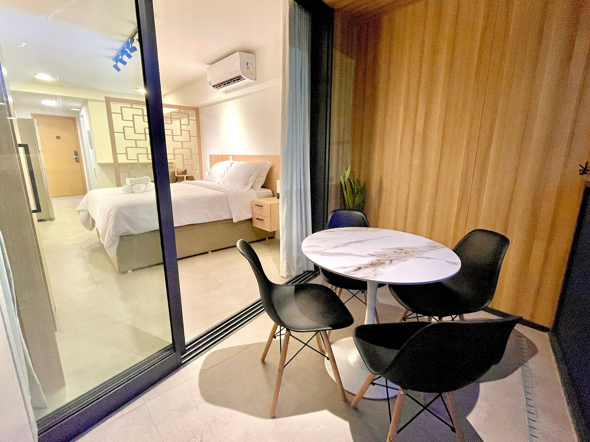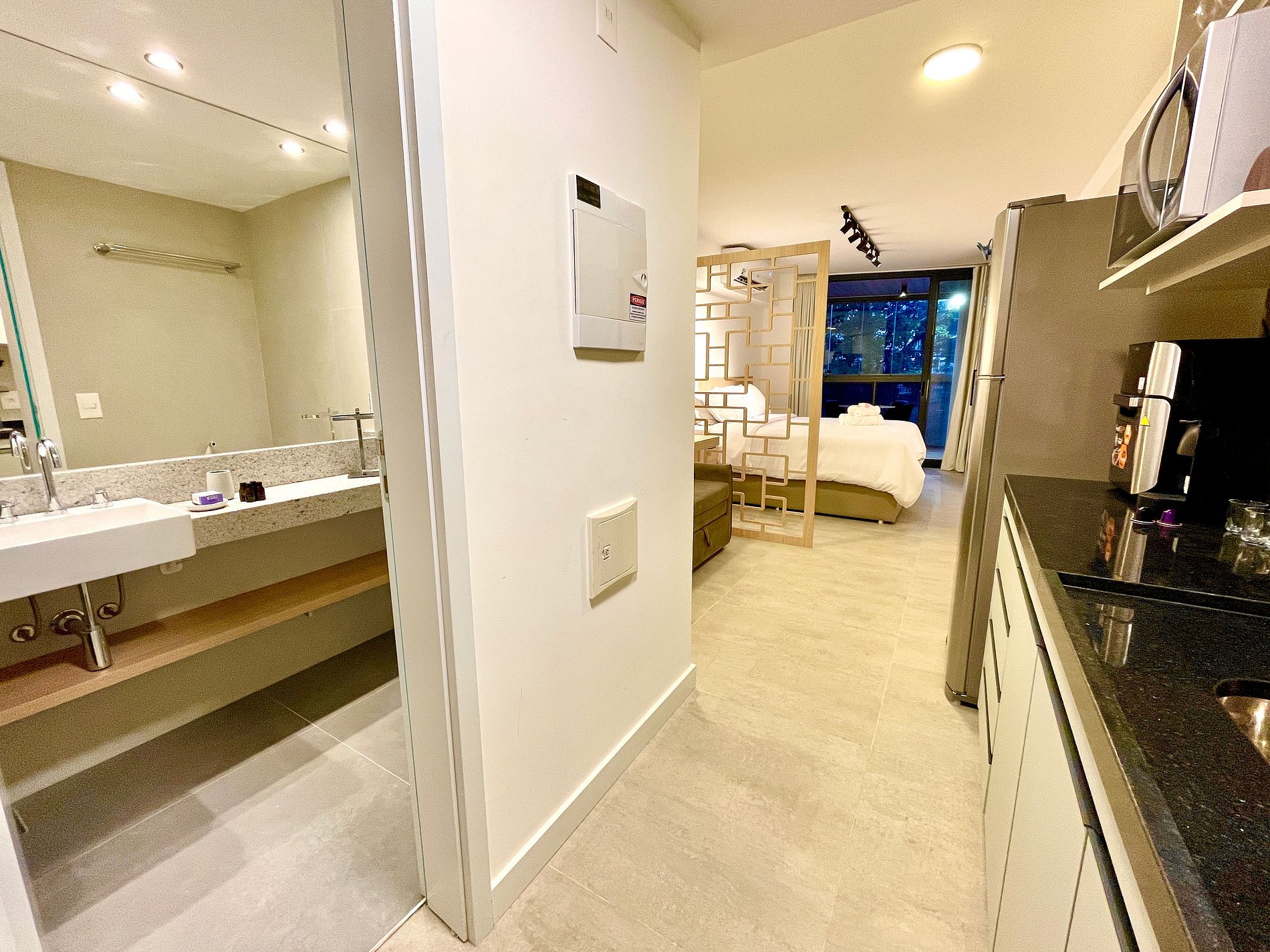 Super nice studio with a comfortable queen size bed, single sofa bed, closets, powerful air conditioning, a 50 inch Smart TV, blackout curtains, a dining table, and plenty of outlets. It also features a charming balcony with views of Christ the Redeemer, the mountains, and the street. High speed internet access is available. The bathroom is fully equipped with a shower with good pressure. The kitchen is equipped with a refrigerator, cooktop, hood, microwave, Nespresso machine, Airfryer and various utensils. Other amenities include a portable crib*, hairdryer, steamer and amenities kit (shampoo, conditioner and soap).