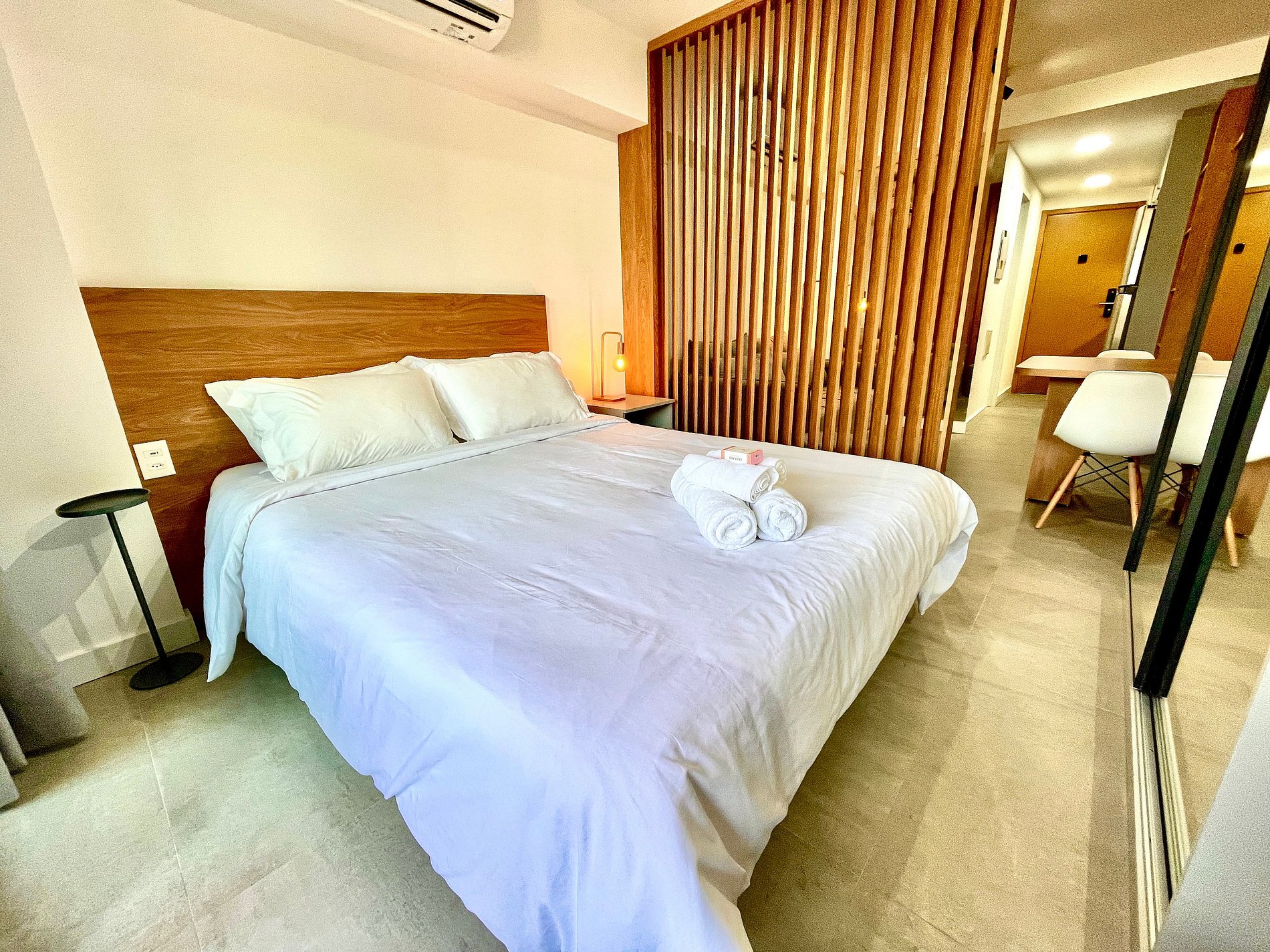 Super nice studio with a comfortable queen size bed, double sofa bed, closets, powerful air conditioning, a 50 inch Smart TV, blackout curtains, a dining table, and plenty of outlets. It also features a charming balcony with views of Christ the Redeemer, the mountains, and the street. High speed internet access is available. The bathroom is fully equipped with a shower with good pressure. The kitchen is equipped with a refrigerator, cooktop, hood, microwave, coffee machine, Airfryer, washing machine and dryer, and various utensils. Other amenities include a portable crib*, hairdryer, iron, and amenities kit (shampoo, conditioner, and soap).