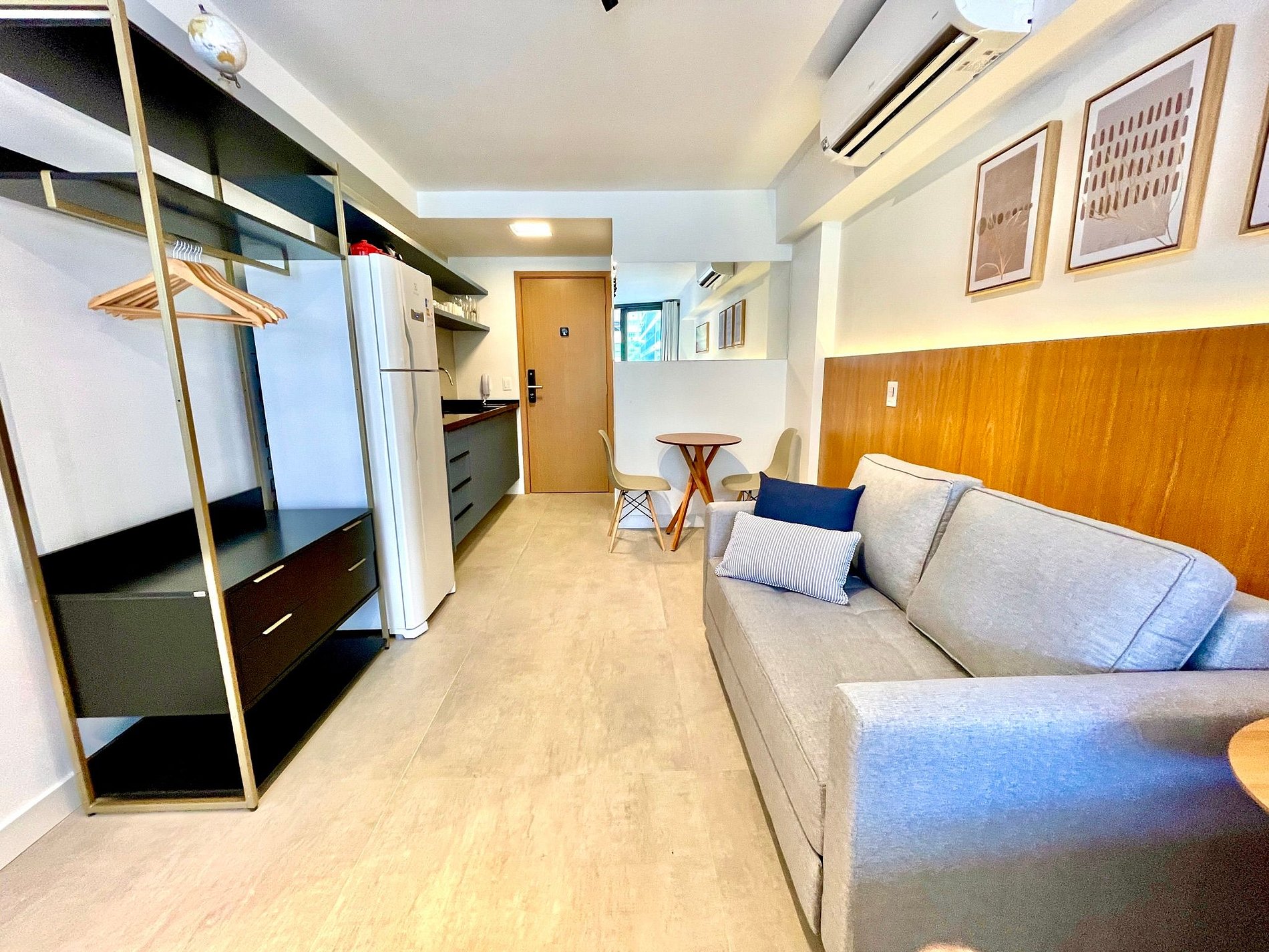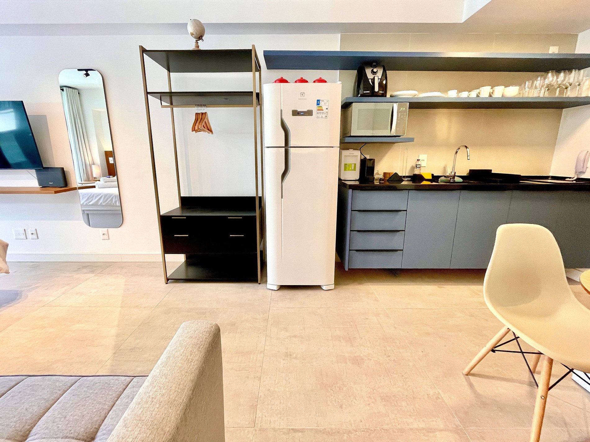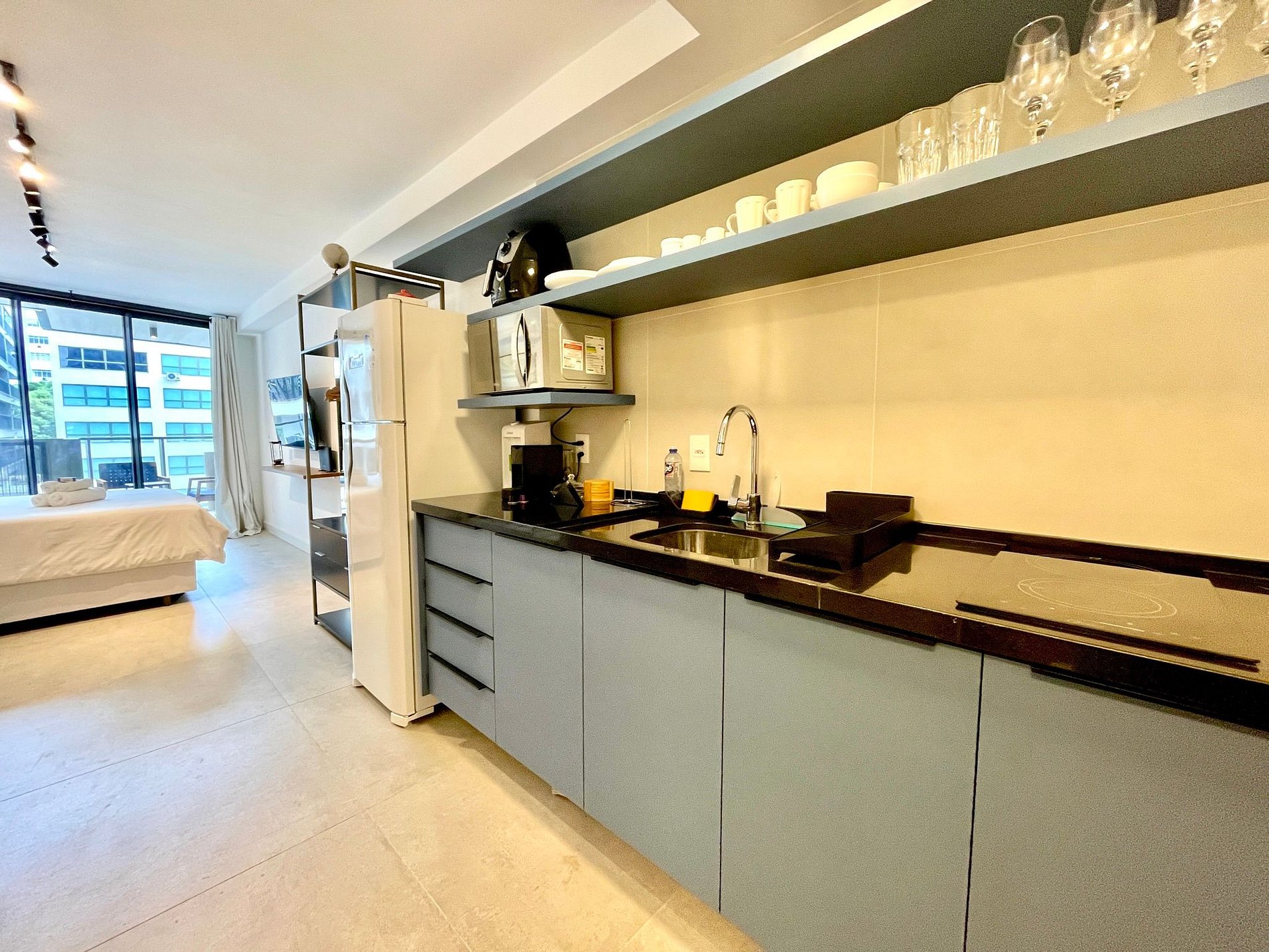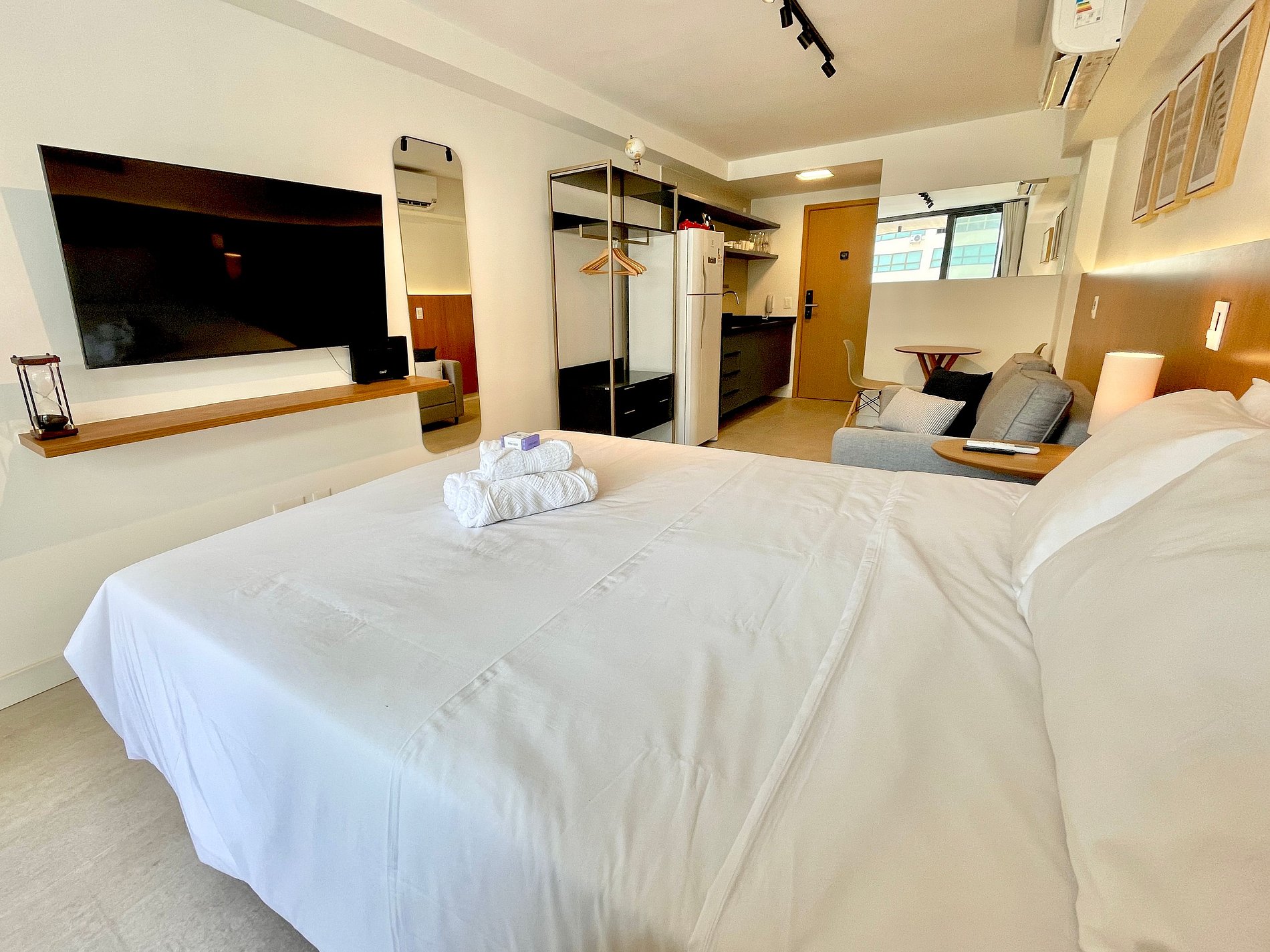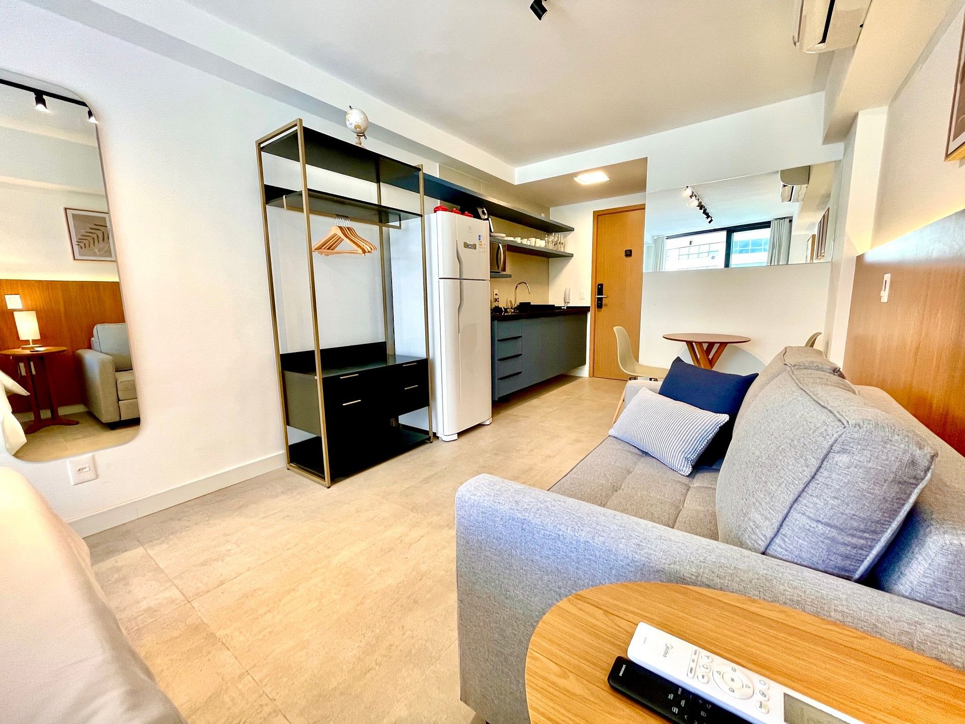 Super pleasant bedroom/living room with sofa bed, queen bed, closets, air conditioning, Smart TV, blackout curtains, dining table, several sockets, in addition to a super charming balcony. High speed internet. Complete bathroom with shower with good pressure. Kitchen equipped with refrigerator, cooktop, microwave, Nespresso machine, Airfryer, water filter and various utensils. It also offers other amenities, such as a portable crib, hairdryer, ironing board and iron and amenities kit (shampoo, conditioner and soap).