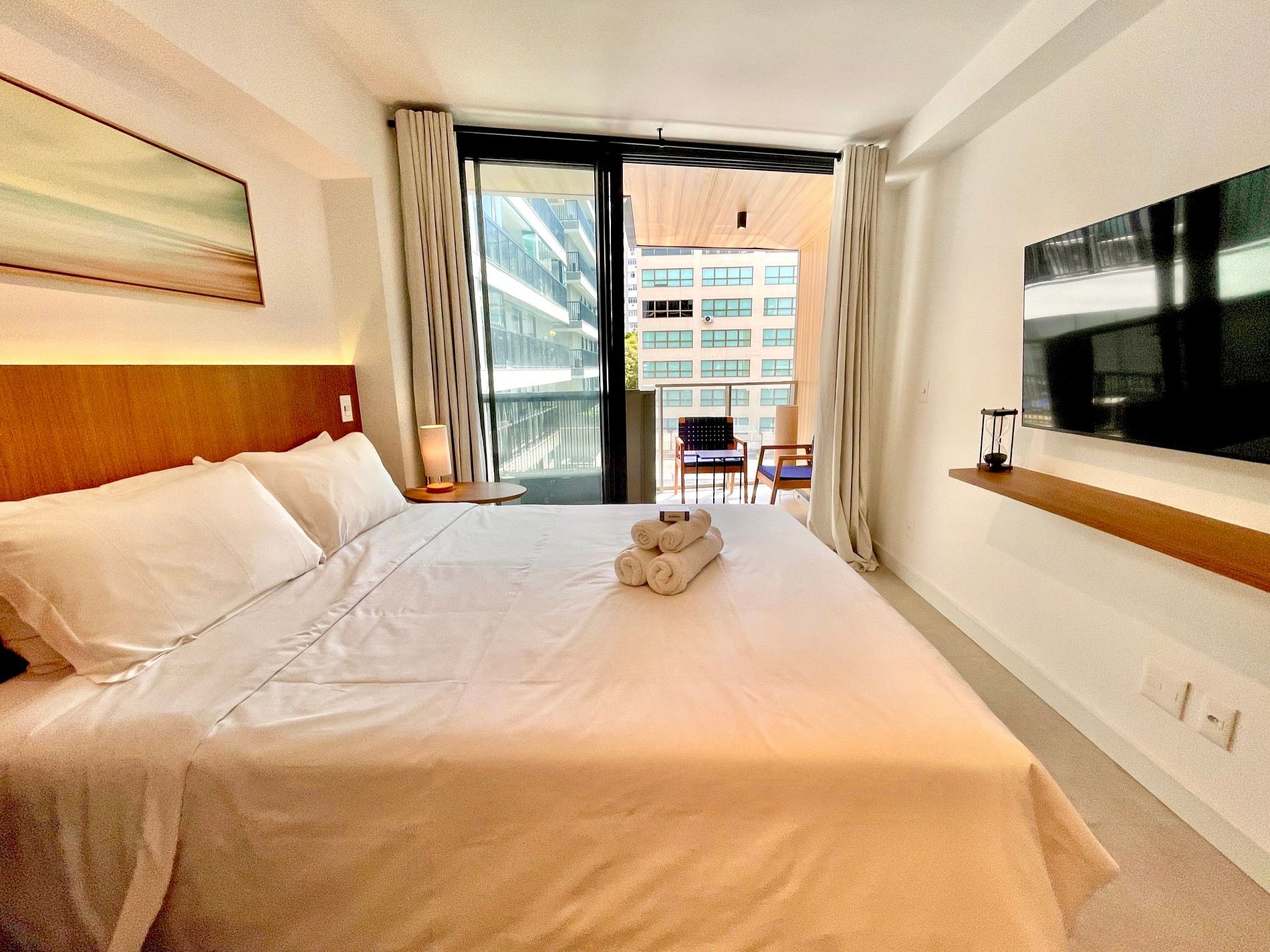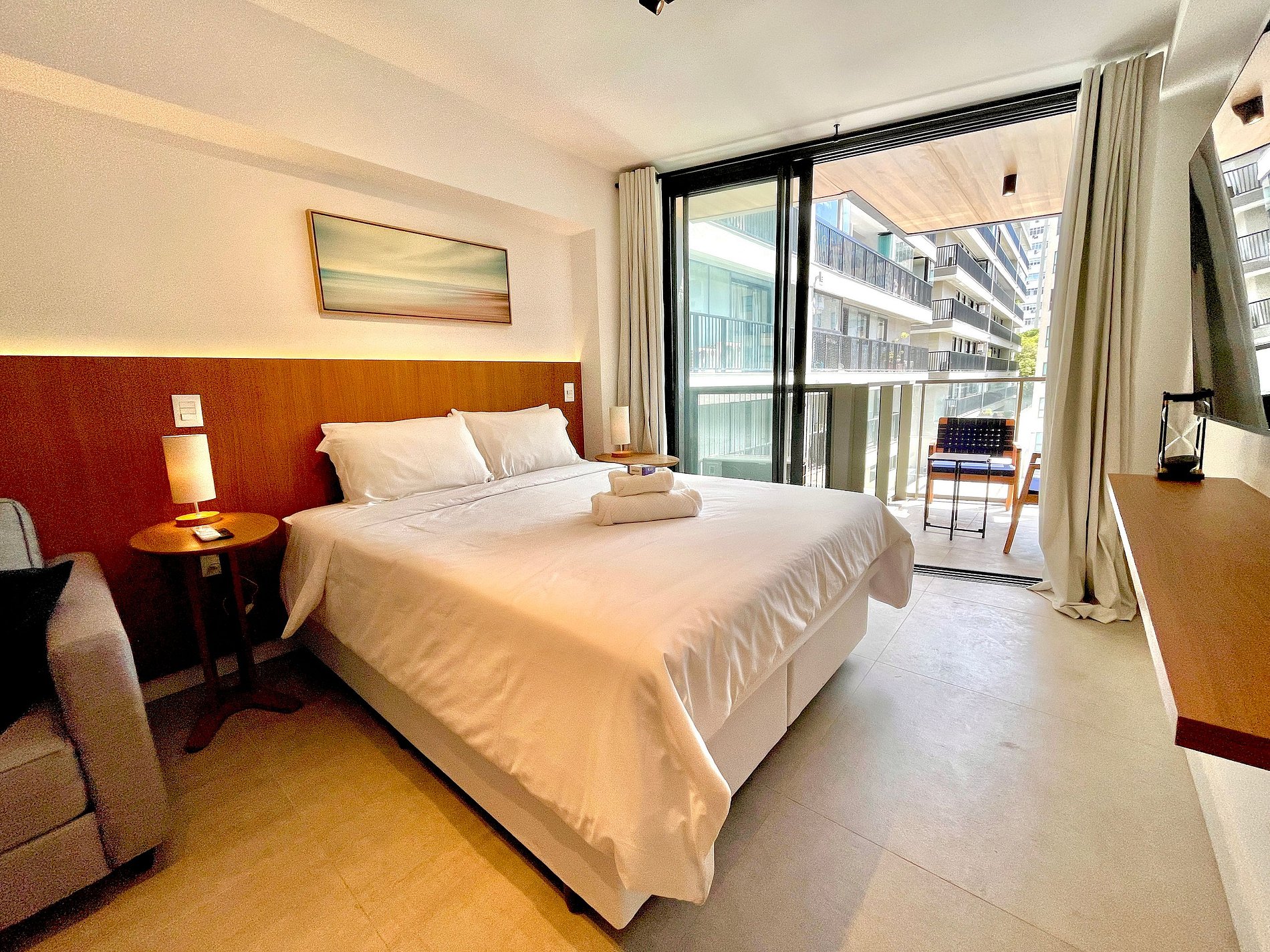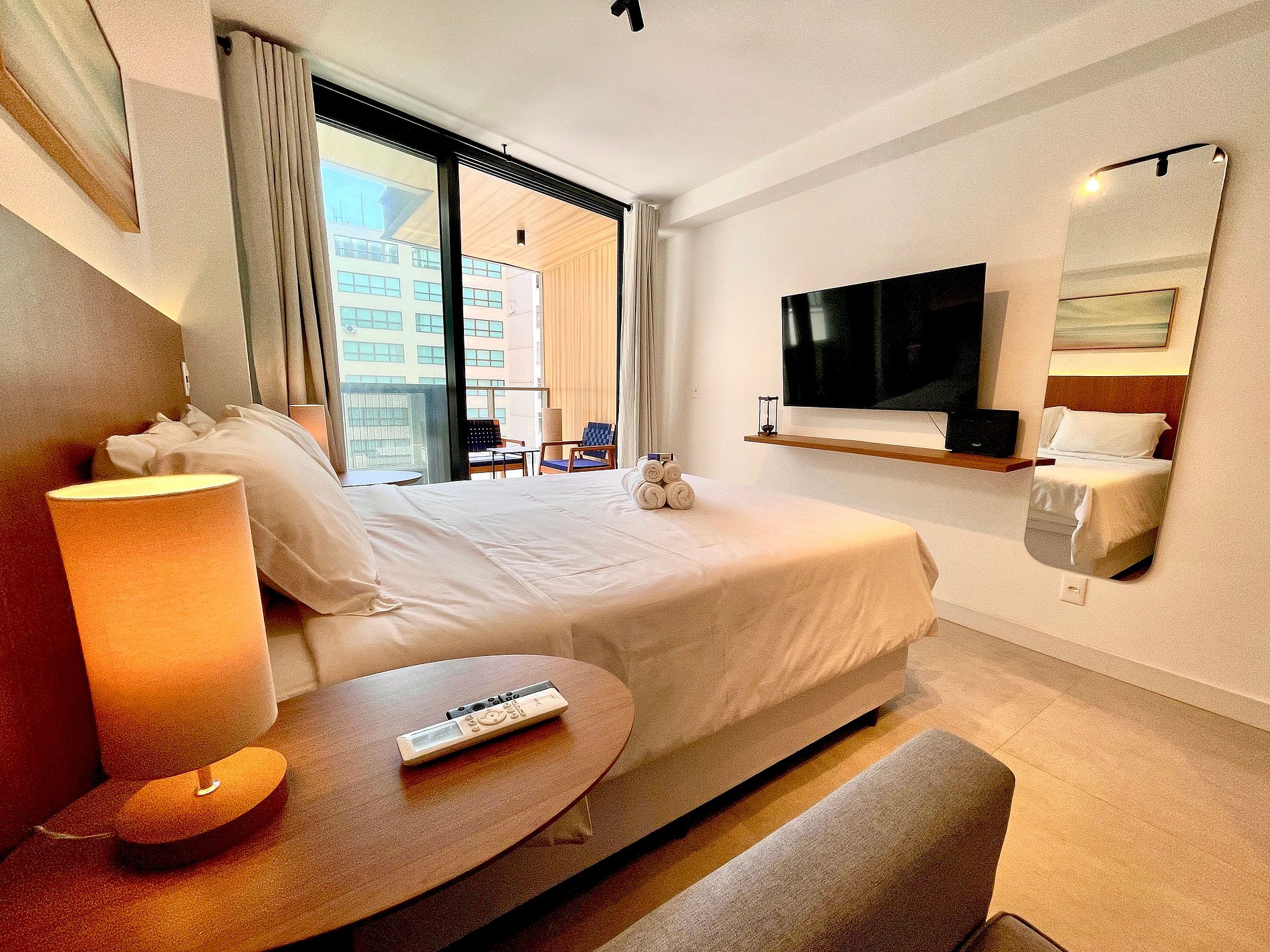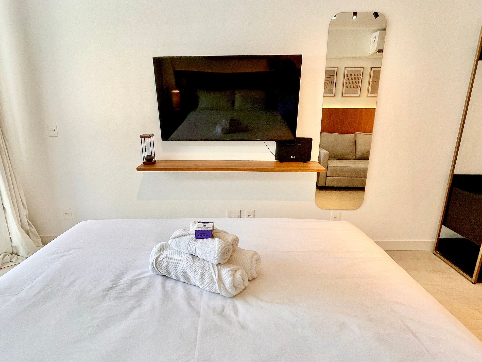 Super pleasant bedroom/living room with sofa bed, queen bed, closets, air conditioning, Smart TV, blackout curtains, dining table, several sockets, in addition to a super charming balcony. High speed internet. Complete bathroom with shower with good pressure. Kitchen equipped with refrigerator, cooktop, microwave, Nespresso machine, Airfryer, water filter and various utensils. It also offers other amenities, such as a portable crib, hairdryer, ironing board and iron and amenities kit (shampoo, conditioner and soap).