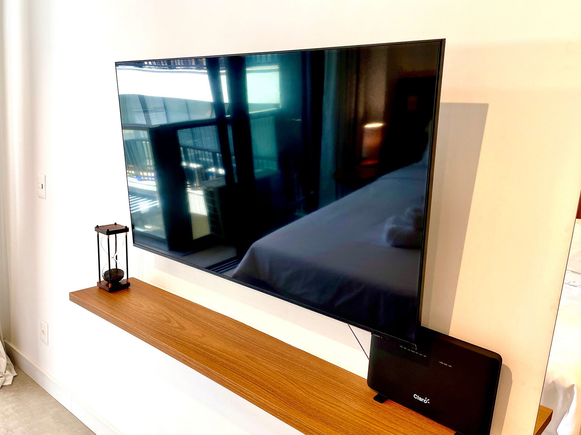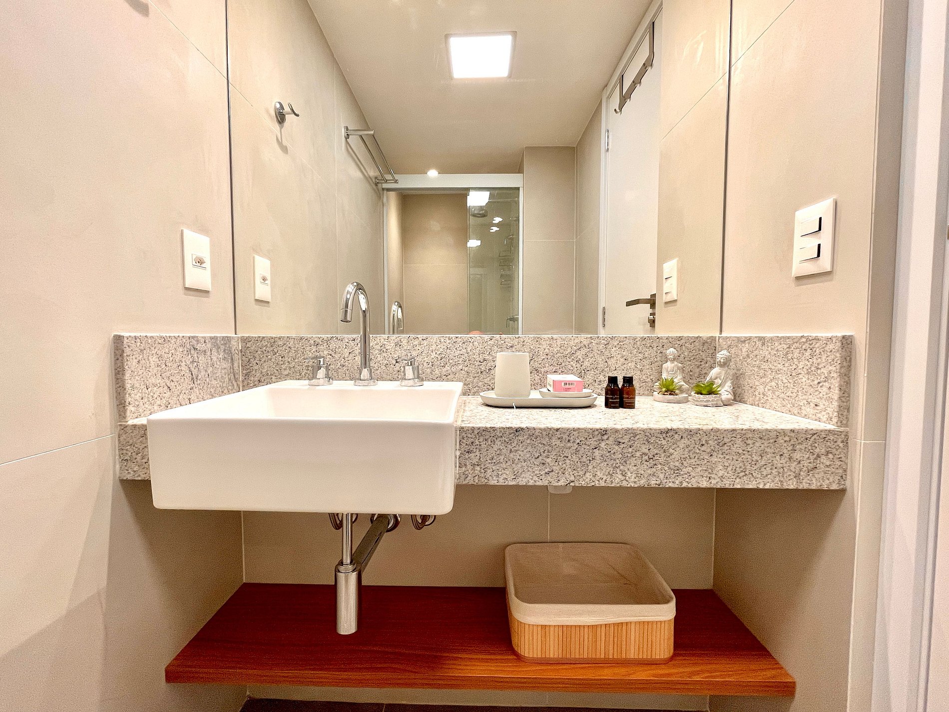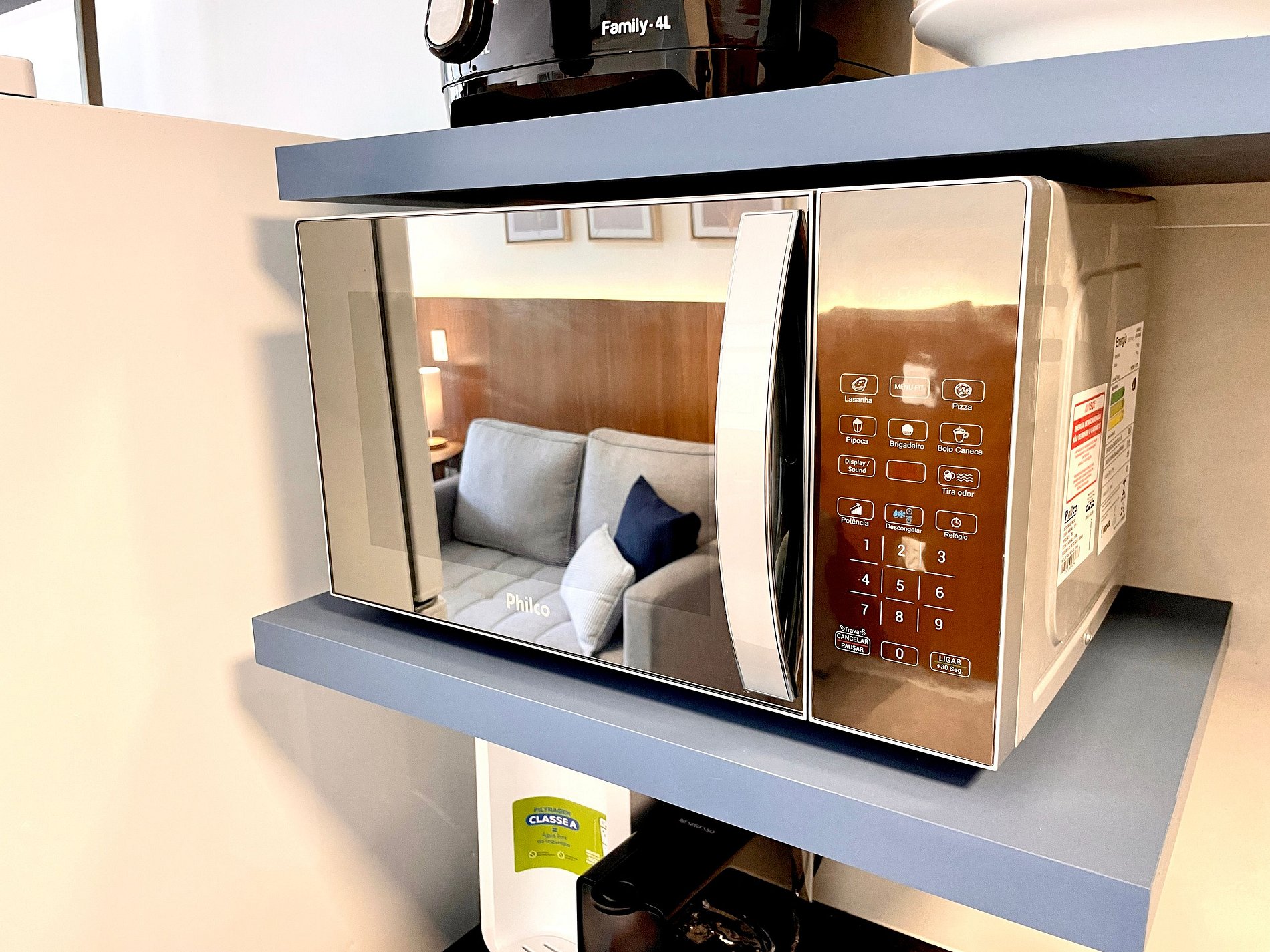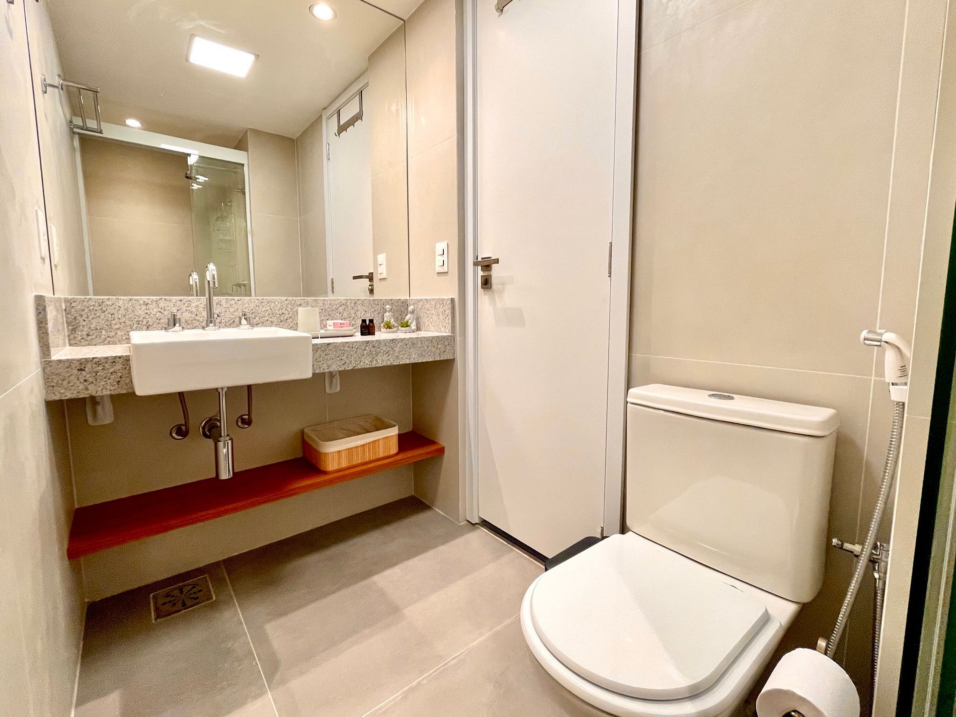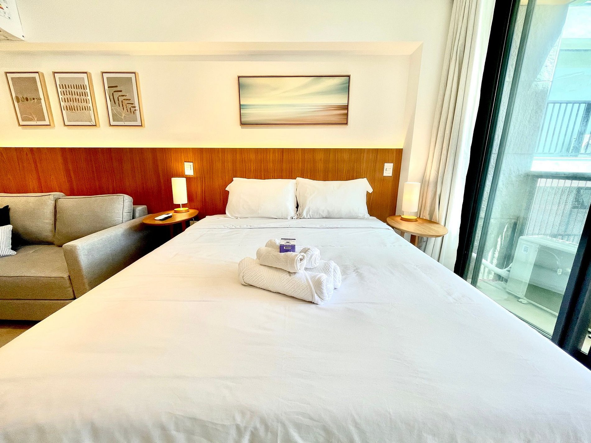 Super pleasant bedroom/living room with sofa bed, queen bed, closets, air conditioning, Smart TV, blackout curtains, dining table, several sockets, in addition to a super charming balcony. High speed internet. Complete bathroom with shower with good pressure. Kitchen equipped with refrigerator, cooktop, microwave, Nespresso machine, Airfryer, water filter and various utensils. It also offers other amenities, such as a portable crib, hairdryer, ironing board and iron and amenities kit (shampoo, conditioner and soap).