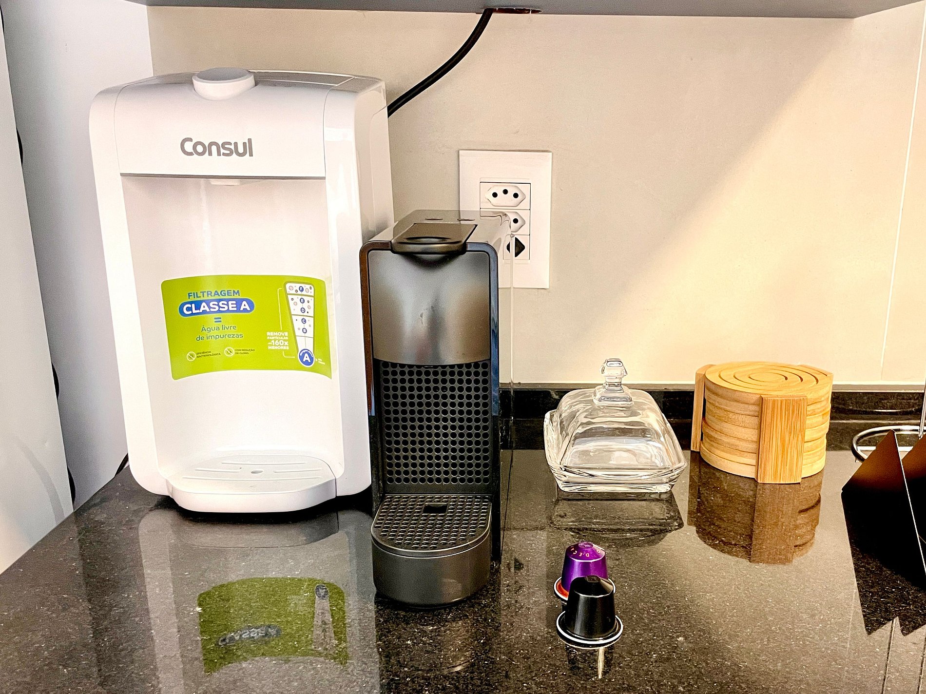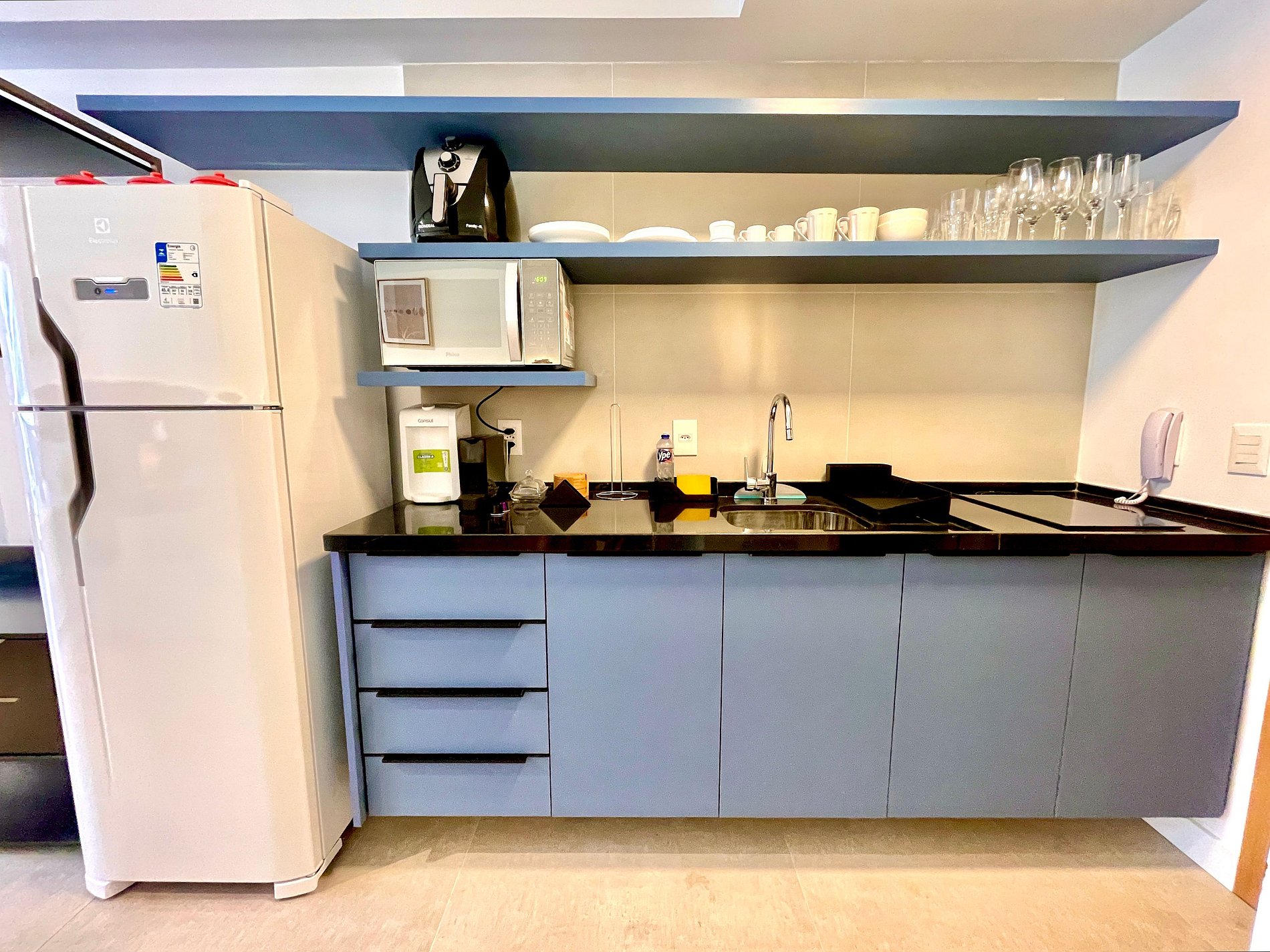 Super pleasant bedroom/living room with sofa bed, queen bed, closets, air conditioning, Smart TV, blackout curtains, dining table, several sockets, in addition to a super charming balcony. High speed internet. Complete bathroom with shower with good pressure. Kitchen equipped with refrigerator, cooktop, microwave, Nespresso machine, Airfryer, water filter and various utensils. It also offers other amenities, such as a portable crib, hairdryer, ironing board and iron and amenities kit (shampoo, conditioner and soap).