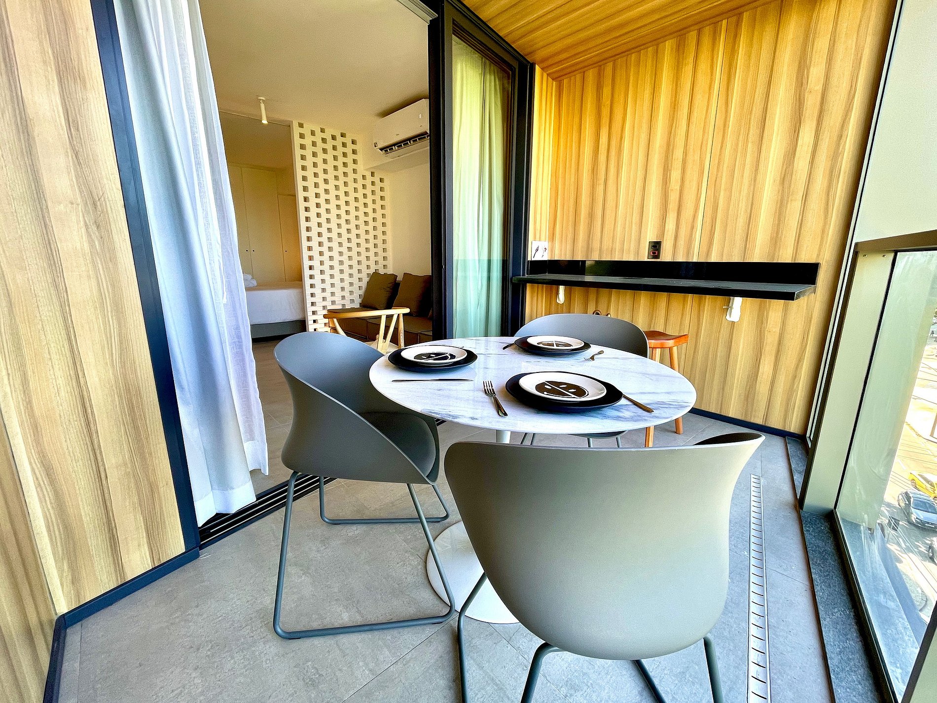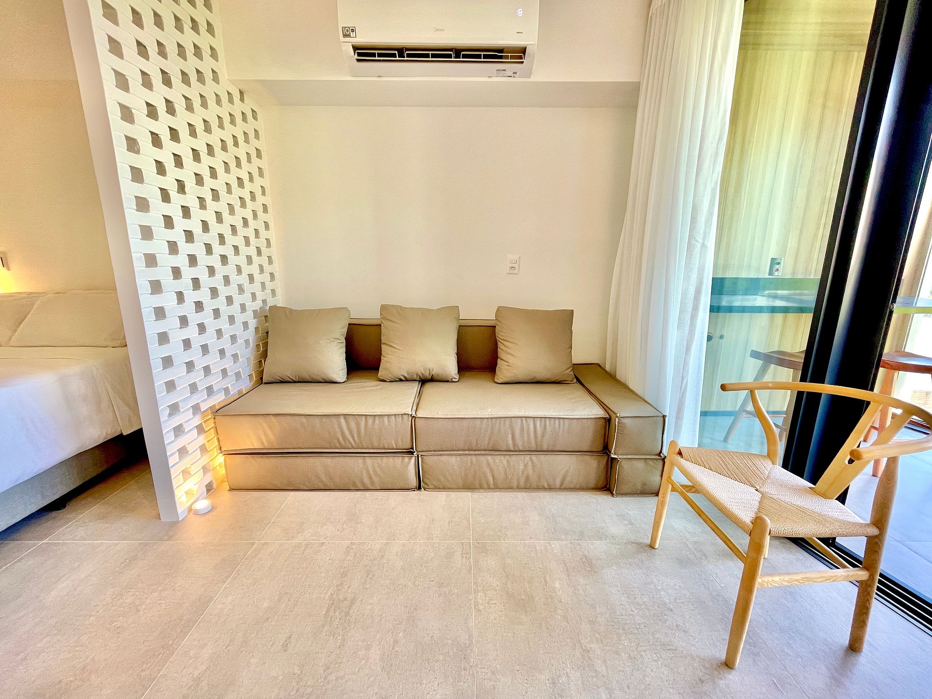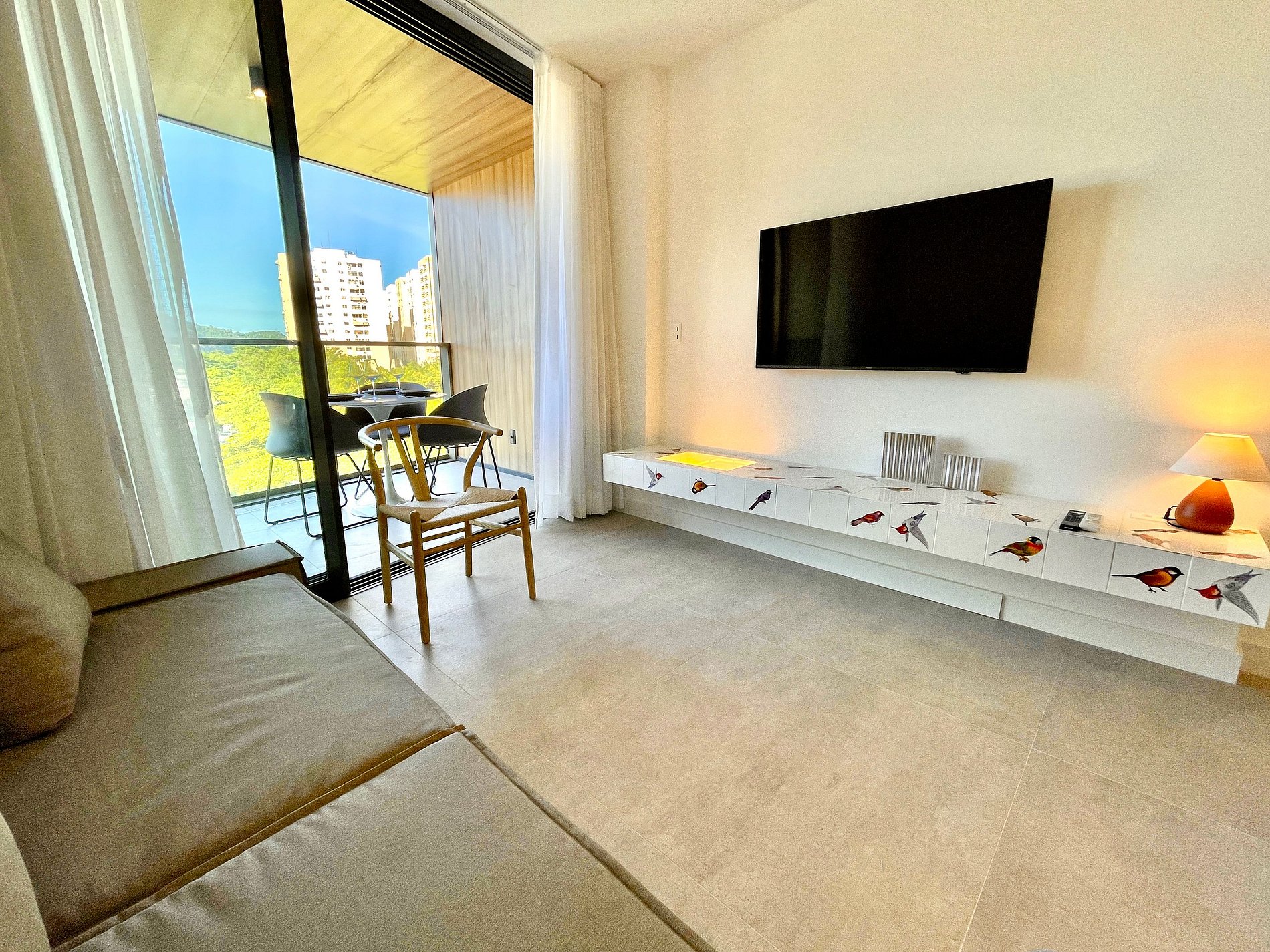 Super pleasant bedroom/living room with sofa bed, queen bed, closets, air conditioning, Smart TV, blackout curtains, dining table, several sockets, in addition to a super charming balcony. High speed internet. Complete bathroom with shower with good pressure. Kitchen equipped with refrigerator, cooktop, microwave, Nespresso machine, Airfryer and various utensils. It also offers other amenities, such as a portable crib, hairdryer, ironing board and iron and amenities kit (shampoo, conditioner and soap).