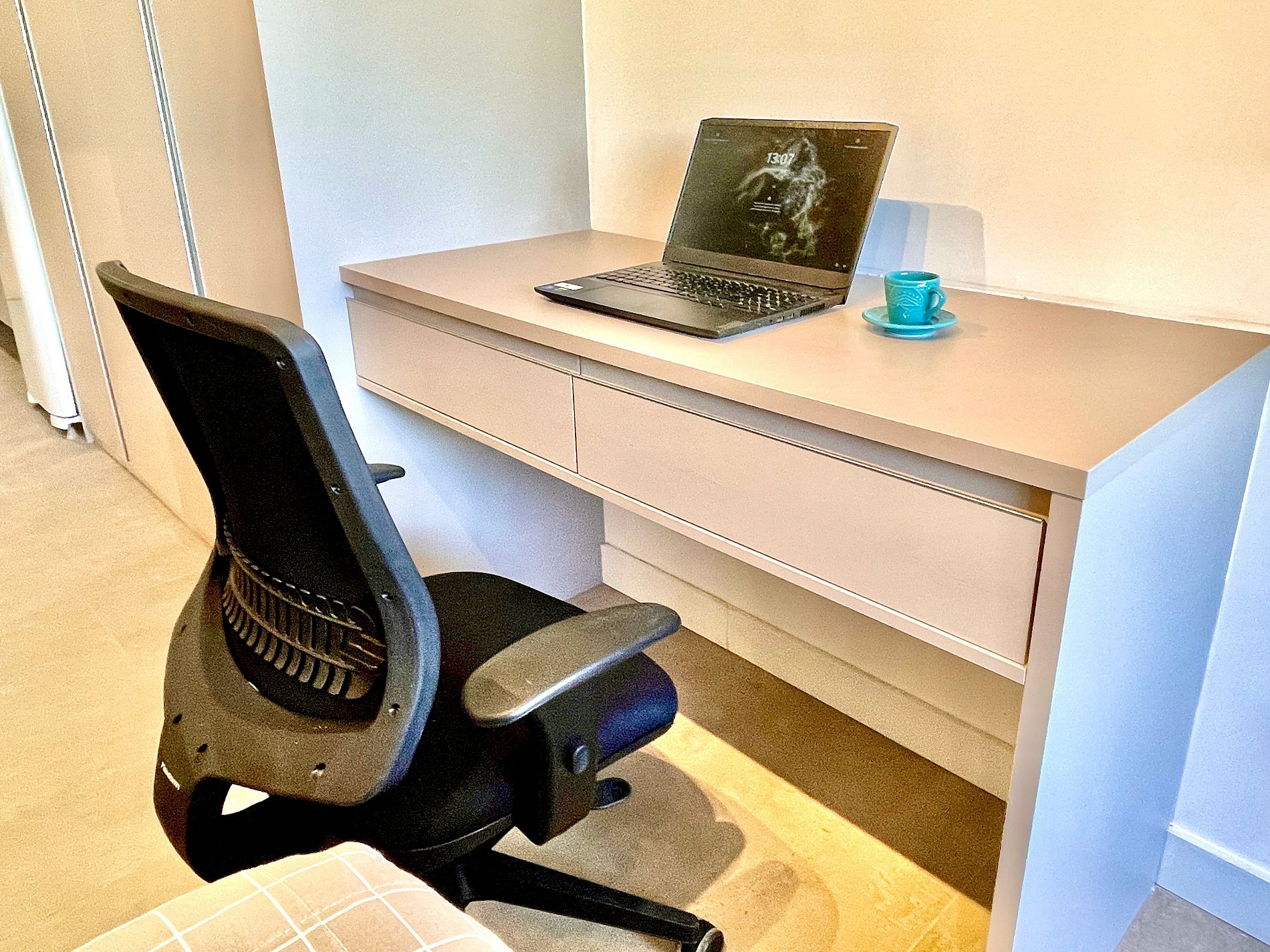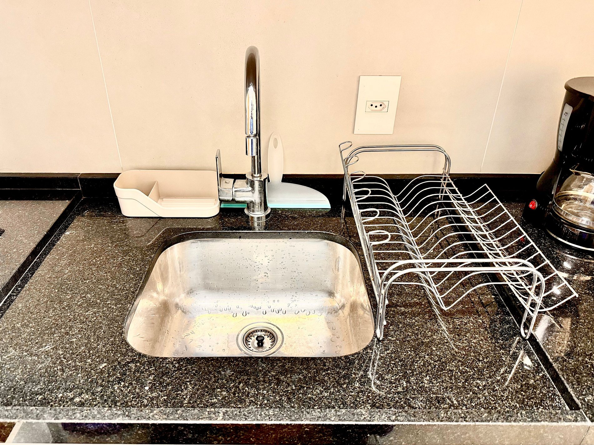 Quarto/sala super agradável com sofá, cama de casal, armários, ar condicionado, Smart TV, cortina blackout, mesa de jantar, diversas tomadas, além de contar com uma varanda super charmosa. Internet de alta velocidade. Banheiro todo completo e com chuveiro com boa pressão. Cozinha equipada com geladeira, cooktop, microondas, máquina de Nespresso, Airfryer, filtro de água e diversos utensílios. Oferece também outras comodidades, como berço portátil*, secador de cabelo, tábua e ferro de passar roupa e kit de amenities (shampoo, condicionador e sabonete).