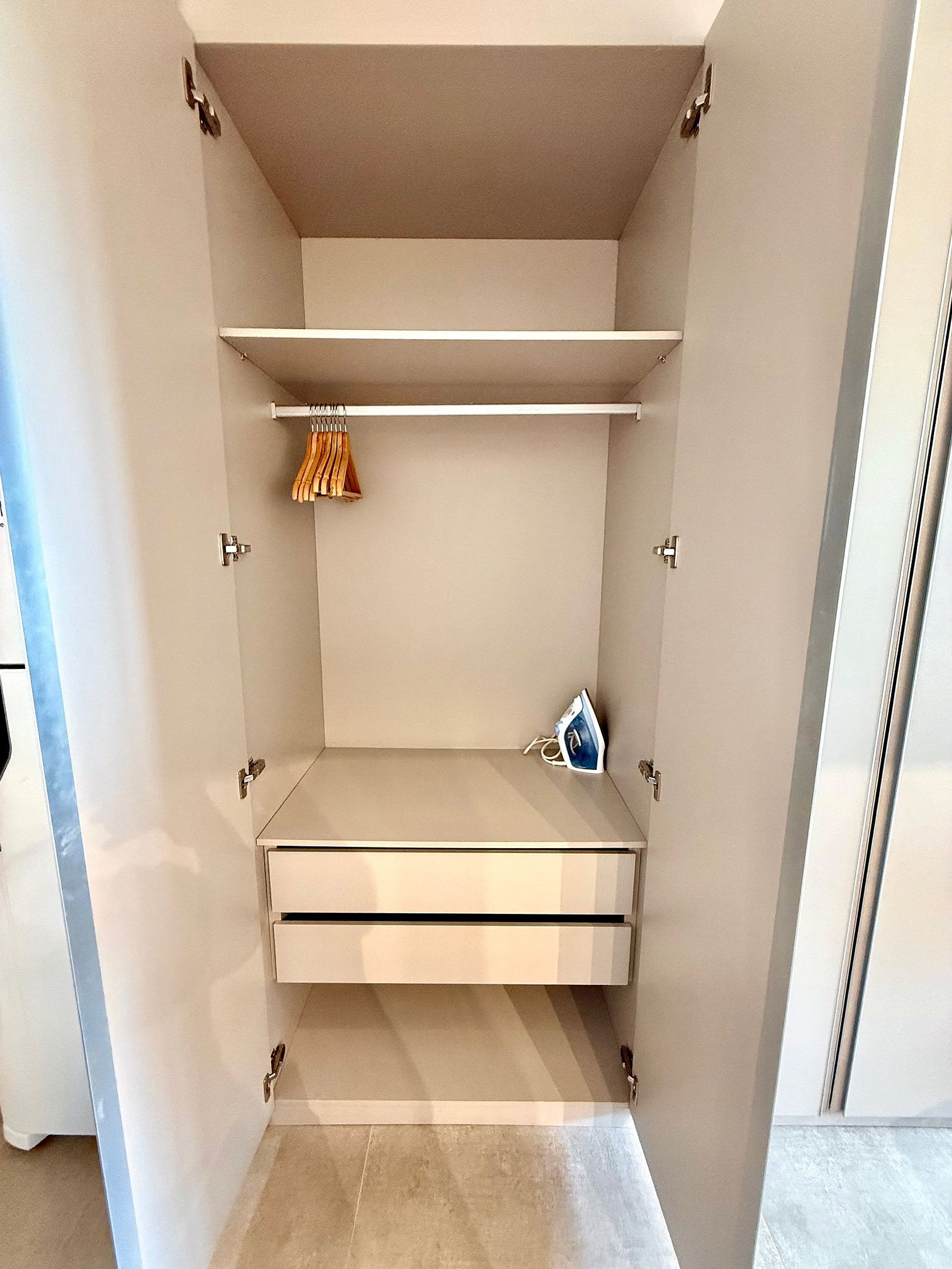 Quarto/sala super agradável com sofá, cama de casal, armários, ar condicionado, Smart TV, cortina blackout, mesa de jantar, diversas tomadas, além de contar com uma varanda super charmosa. Internet de alta velocidade. Banheiro todo completo e com chuveiro com boa pressão. Cozinha equipada com geladeira, cooktop, microondas, máquina de Nespresso, Airfryer, filtro de água e diversos utensílios. Oferece também outras comodidades, como berço portátil*, secador de cabelo, tábua e ferro de passar roupa e kit de amenities (shampoo, condicionador e sabonete).