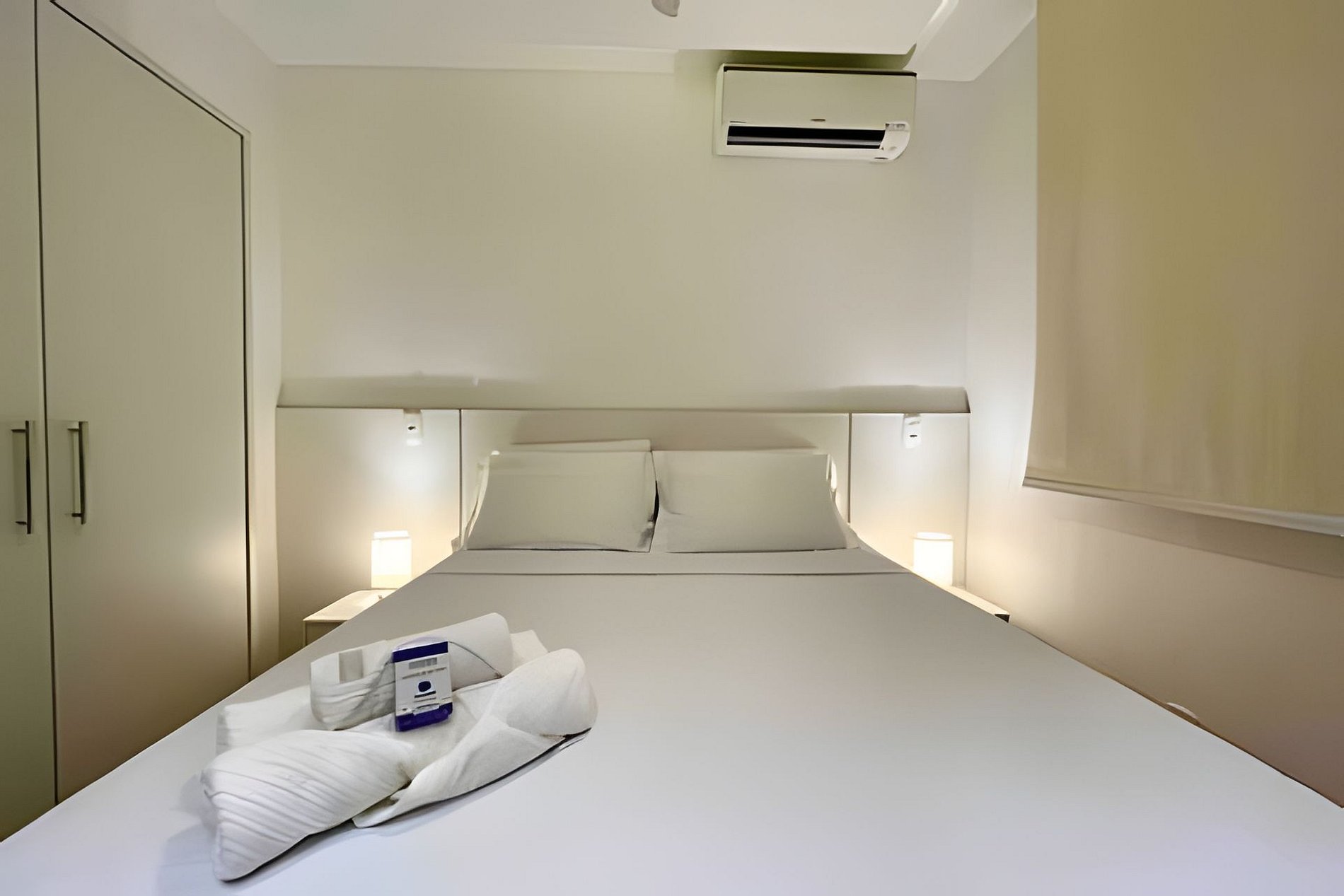 Sala acogedora con aire acondicionado, smart TV, un sofá cama, mesa de comedor, ventilador de techo y una estación de trabajo para "Home office". Internet de alta velocidad. La cocina está integrada en el salón y está totalmente equipada con nevera, cocina a gas, campana extractora, microondas, horno, cafetera Nespresso, lavavajillas y utensilios diversos. Hay 2 dormitorios, 1 es suite, ambos con camas tamaño queen, aire acondicionado, armarios y ventiladores de techo. Además del baño en la suite, hay otro baño completo para el segundo dormitorio. Hay una pequeña zona de lavandería con cisterna, lavadora y tendedero para secar la ropa. El piso es al fondo y no tiene vista y también ofrece otras comodidades como cuna portátil, secador de pelo, plancha y tabla de planchar y un kit de amenities (champú, acondicionador y jabón).