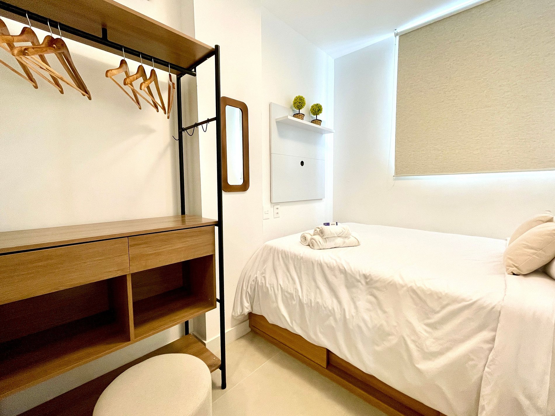 Acogedora habitación con aire acondicionado, smart TV, sofá, sillas, mesa de comedor y ventilador de techo. Internet de alta velocidad. La cocina está integrada en el salón y está totalmente equipada con nevera, fogones, campana extractora, microondas, horno, cafetera Nespresso y utensilios varios. Hay 2 dormitorios, 1 en suite con cama queen, TV inteligente y estación de trabajo, y 1 dormitorio con cama doble, ambos con aire acondicionado, cortinas opacas y armarios. Además del baño en suite, hay otro baño completo para el segundo dormitorio. Hay una pequeña zona con lavadora. El piso está al fondo y no tiene vista, también ofrece otras comodidades como cuna portátil, secador de pelo, plancha y tabla de planchar y un kit de amenities (champú, acondicionador y jabón).