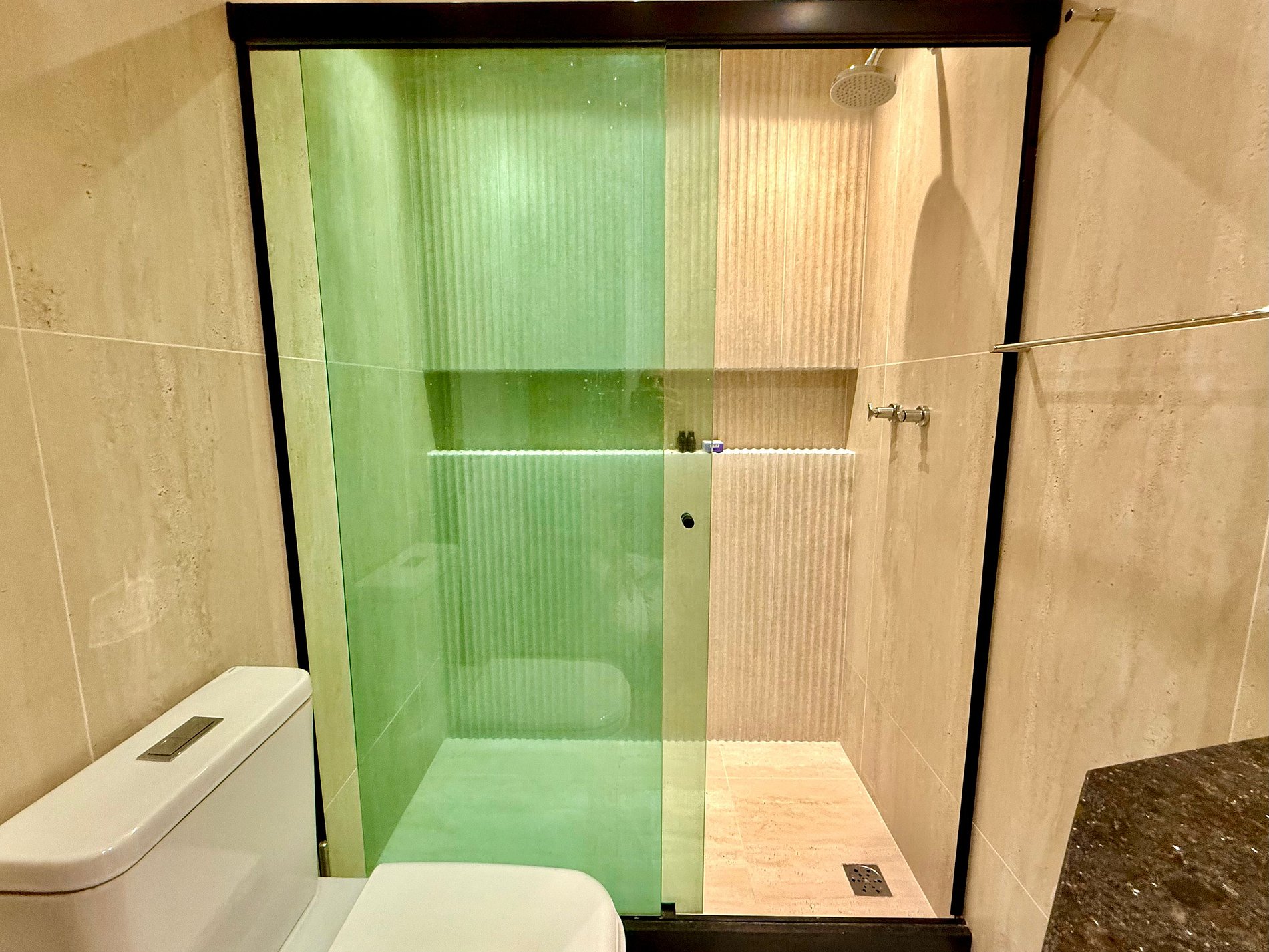 O chuveiro dos banheiros têm uma excelente pressão.