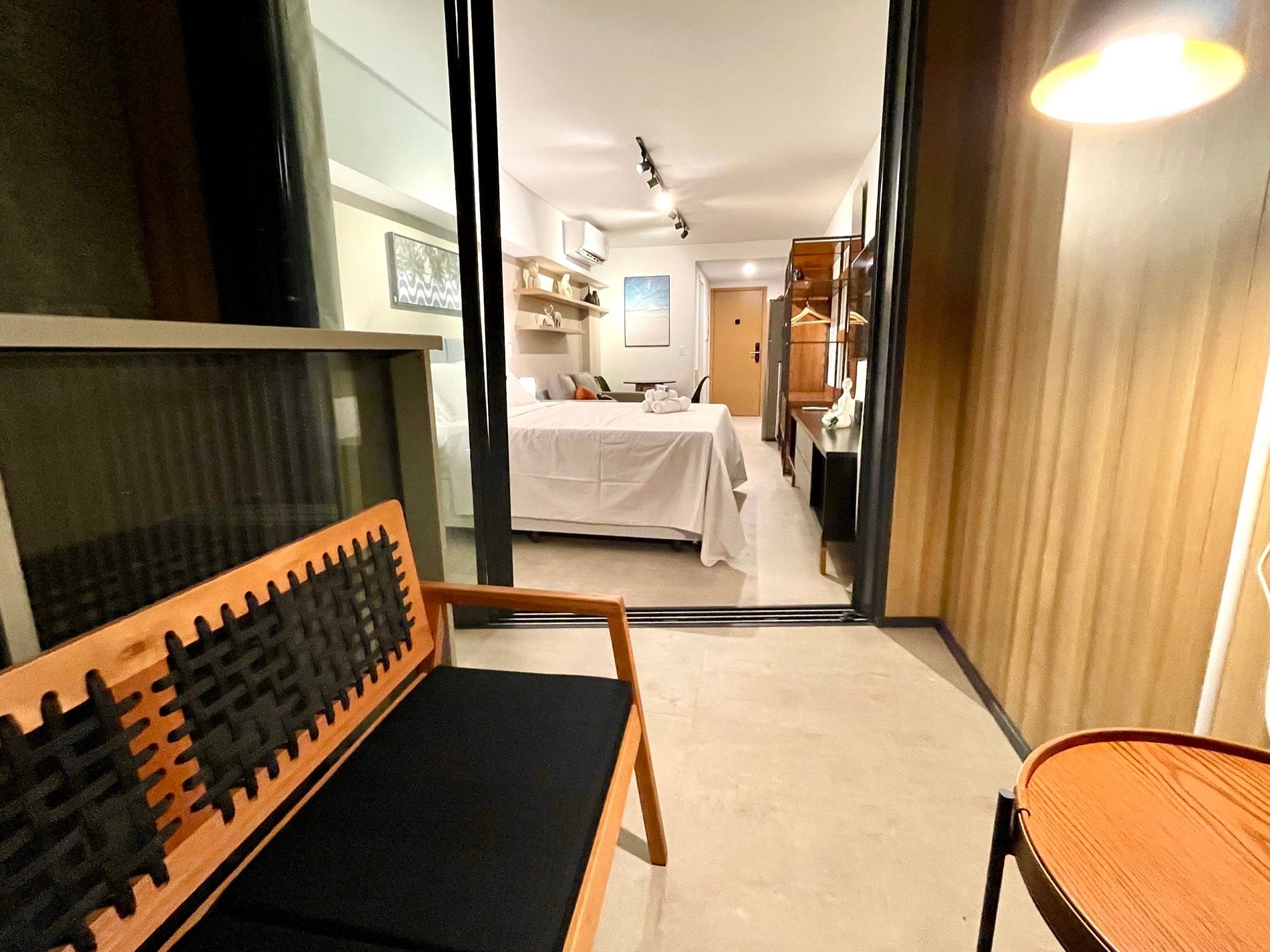 Dormitorio/sala de estar súper agradable con sofá cama, cama queen, closets, aire acondicionado, Smart TV, cortinas blackout, mesa de comedor, varios enchufes, además de un balcón súper encantador. Internet de alta velocidad. Baño completo con ducha con buena presión. Cocina equipada con frigorífico, vitrocerámica, microondas, cafetera Nespresso, Airfryer, filtro de agua y utensilios varios. También ofrece otras comodidades, como cuna portátil, secador de pelo, tabla de planchar y plancha y kit de amenidades (champú, acondicionador y jabón).