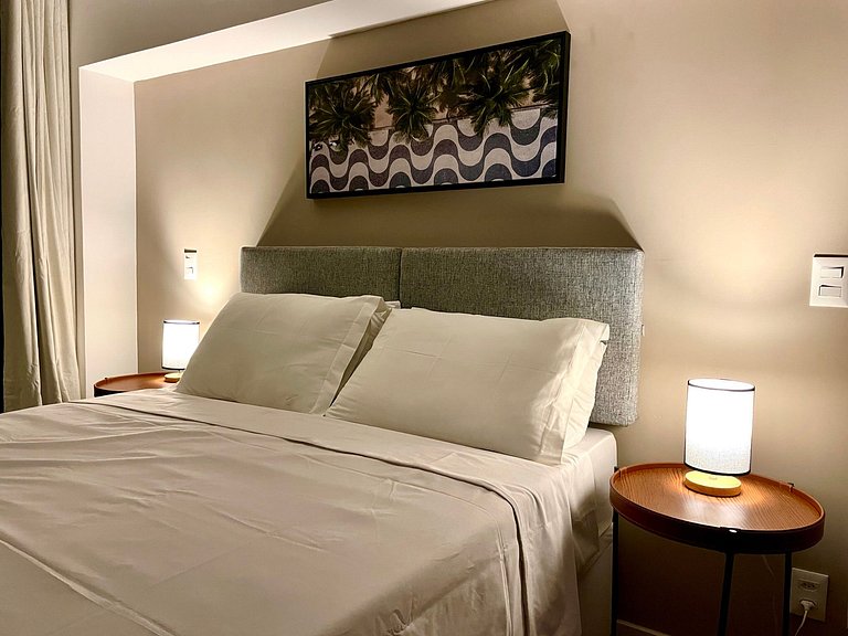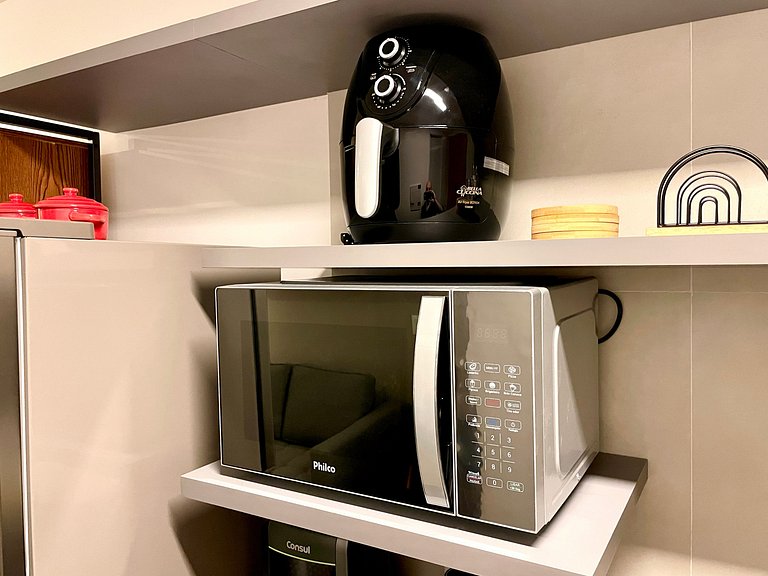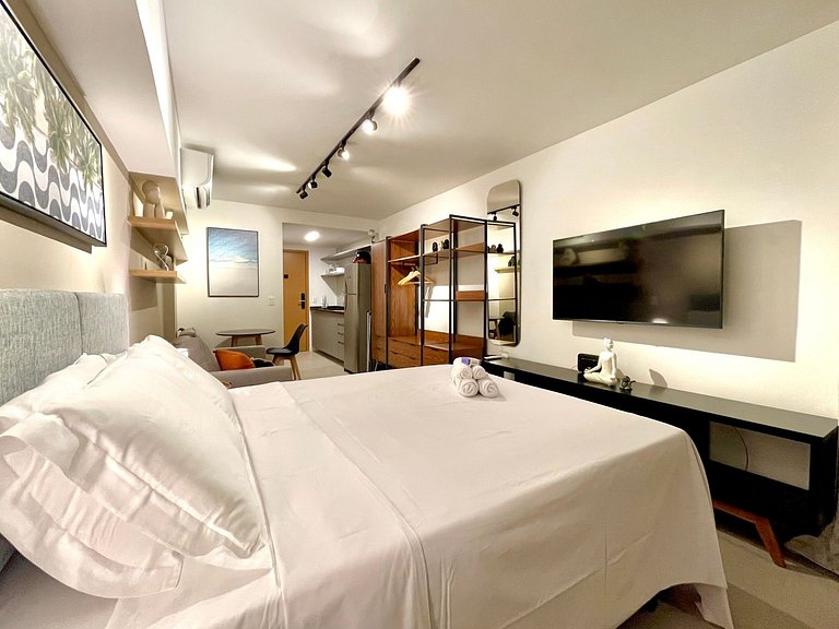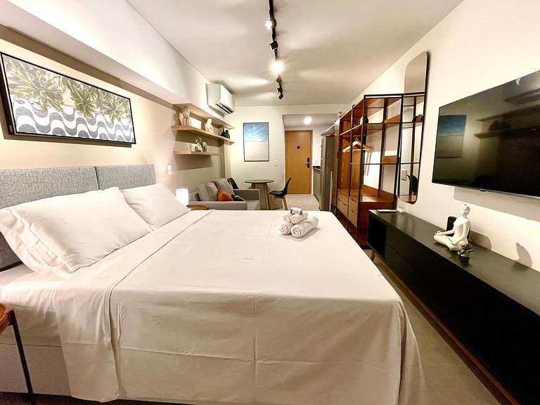 Dormitorio/sala de estar súper agradable con sofá cama, cama queen, closets, aire acondicionado, Smart TV, cortinas blackout, mesa de comedor, varios enchufes, además de un balcón súper encantador. Internet de alta velocidad. Baño completo con ducha con buena presión. Cocina equipada con frigorífico, vitrocerámica, microondas, cafetera Nespresso, Airfryer, filtro de agua y utensilios varios. También ofrece otras comodidades, como cuna portátil, secador de pelo, tabla de planchar y plancha y kit de amenidades (champú, acondicionador y jabón).