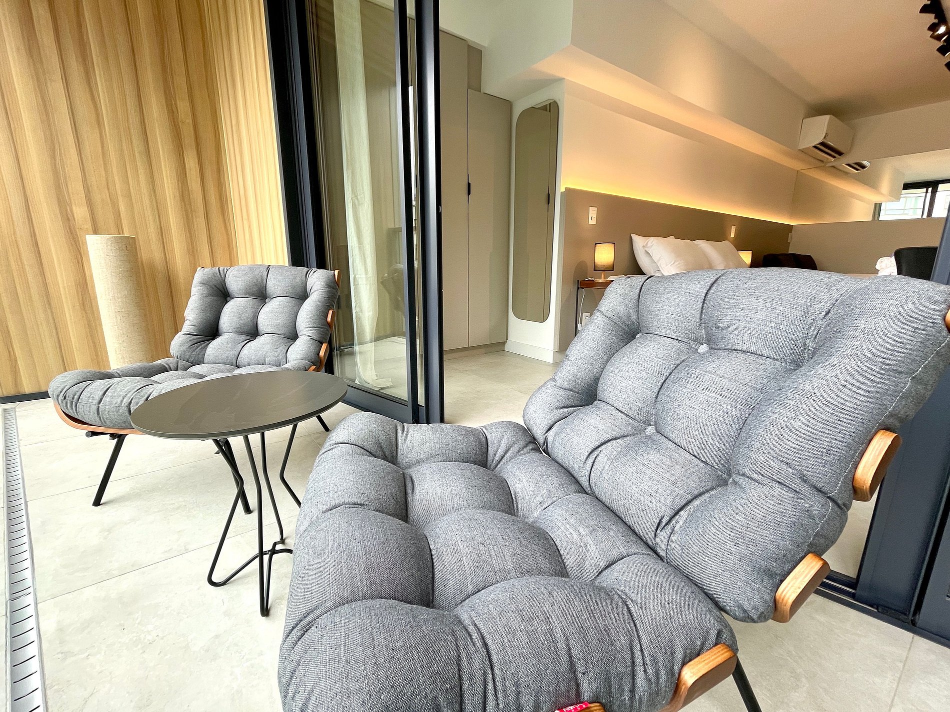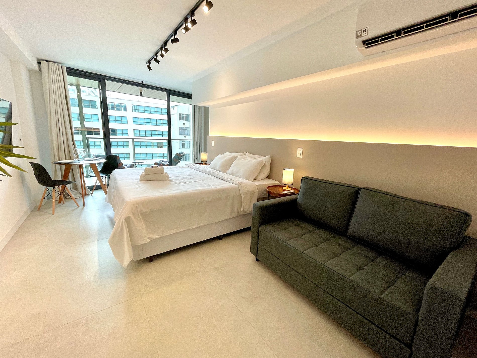 Dormitorio/sala de estar súper agradable con sofá cama, cama king, closets, aire acondicionado, Smart TV, cortinas blackout, mesa de comedor, varios enchufes, además de un balcón súper encantador. Internet de alta velocidad. Baño completo con ducha con buena presión. Cocina equipada con frigorífico, vitrocerámica, microondas, cafetera Nespresso, Airfryer, filtro de agua y utensilios varios. También ofrece otras comodidades, como cuna portátil, secador de pelo, tabla de planchar y plancha y kit de amenidades (champú, acondicionador y jabón).