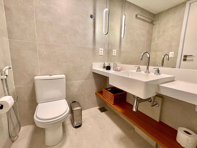 Dormitorio/sala de estar súper agradable con sofá cama, cama king, closets, aire acondicionado, Smart TV, cortinas blackout, mesa de comedor, varios enchufes, además de un balcón súper encantador. Internet de alta velocidad. Baño completo con ducha con buena presión. Cocina equipada con frigorífico, vitrocerámica, microondas, cafetera Nespresso, Airfryer, filtro de agua y utensilios varios. También ofrece otras comodidades, como cuna portátil, secador de pelo, tabla de planchar y plancha y kit de amenidades (champú, acondicionador y jabón).
