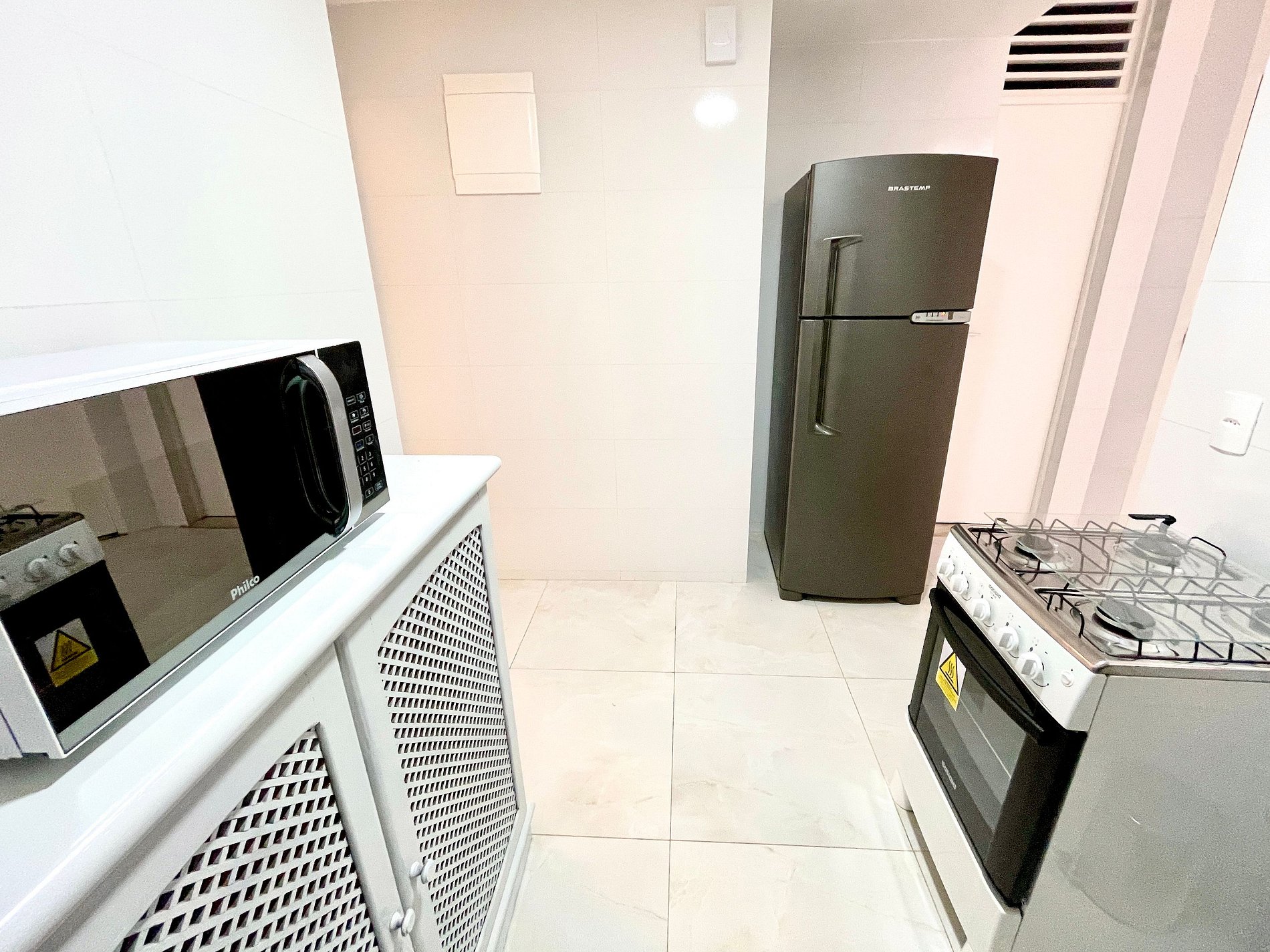 Sala ampla e agradável com vista para a Praia de Copacabana, ar condicionado e Smart TV de 65 polegadas, dividida em sala de estar e sala de jantar. Internet de alta velocidade. Uma suíte com cama queen e banheiro completo, além de um segundo quarto com cama de casal, que também tem vista para a Praia de Copacabana. Tem um segundo banheiro completo no corredor para atender o segundo quarto. Todos os quartos são muito espaçosos e possuem aparelhos de ar condicionado, armários, cabides, cortinas com blackout, mesas de cabeceira e luminárias. Cozinha toda equipada com geladeira, fogão, forno, microondas, cafeteira elétrica, Airfryer, filtro de água e diversos utensílios. Área de serviço com tanque e varal para secar roupas. O apartamento também oferece outras comodidades como berço portátil*, secador de cabelo, tábua e ferro de passar roupa e kit de amenities (shampoo, condicionador e sabonete).