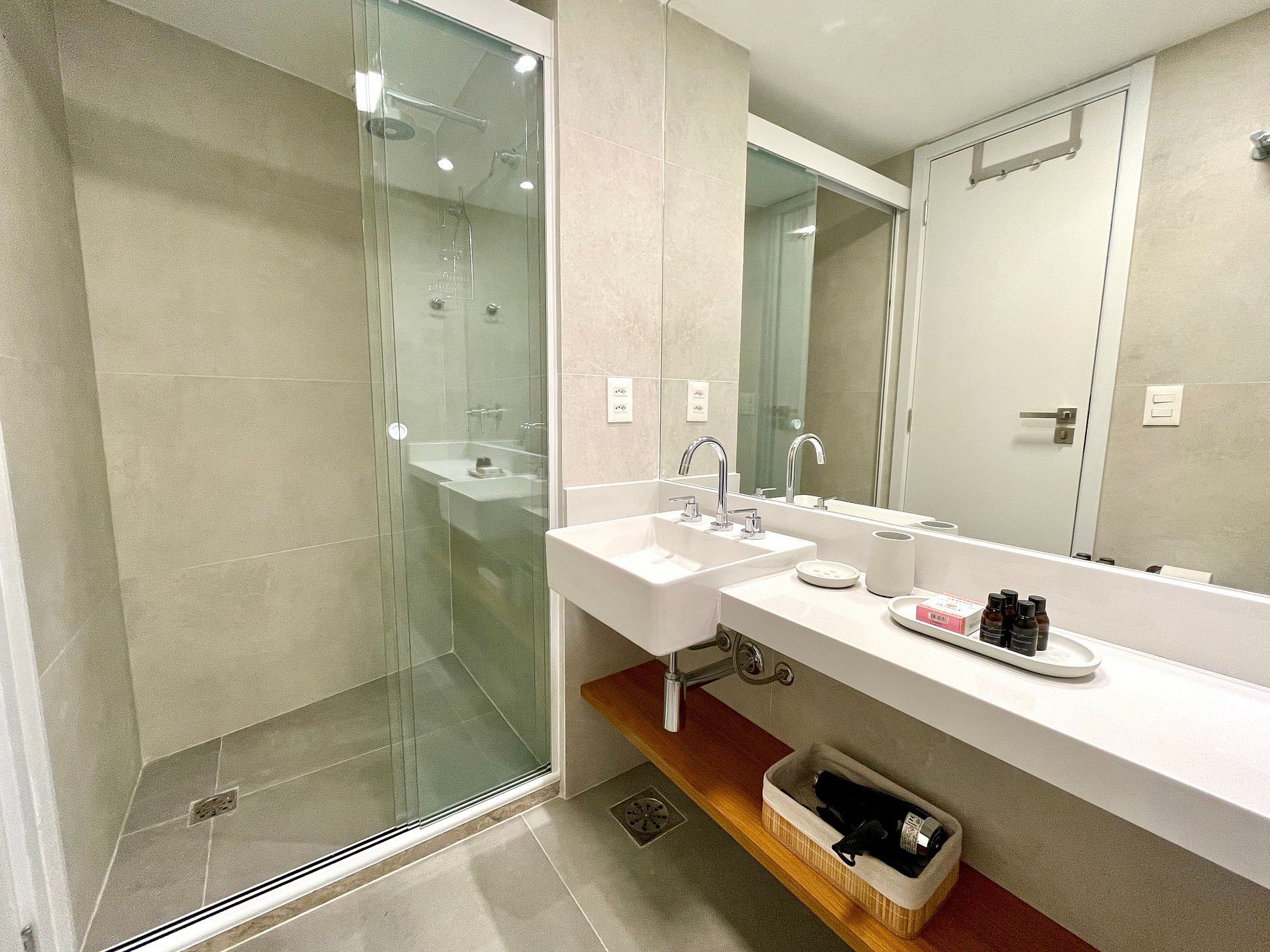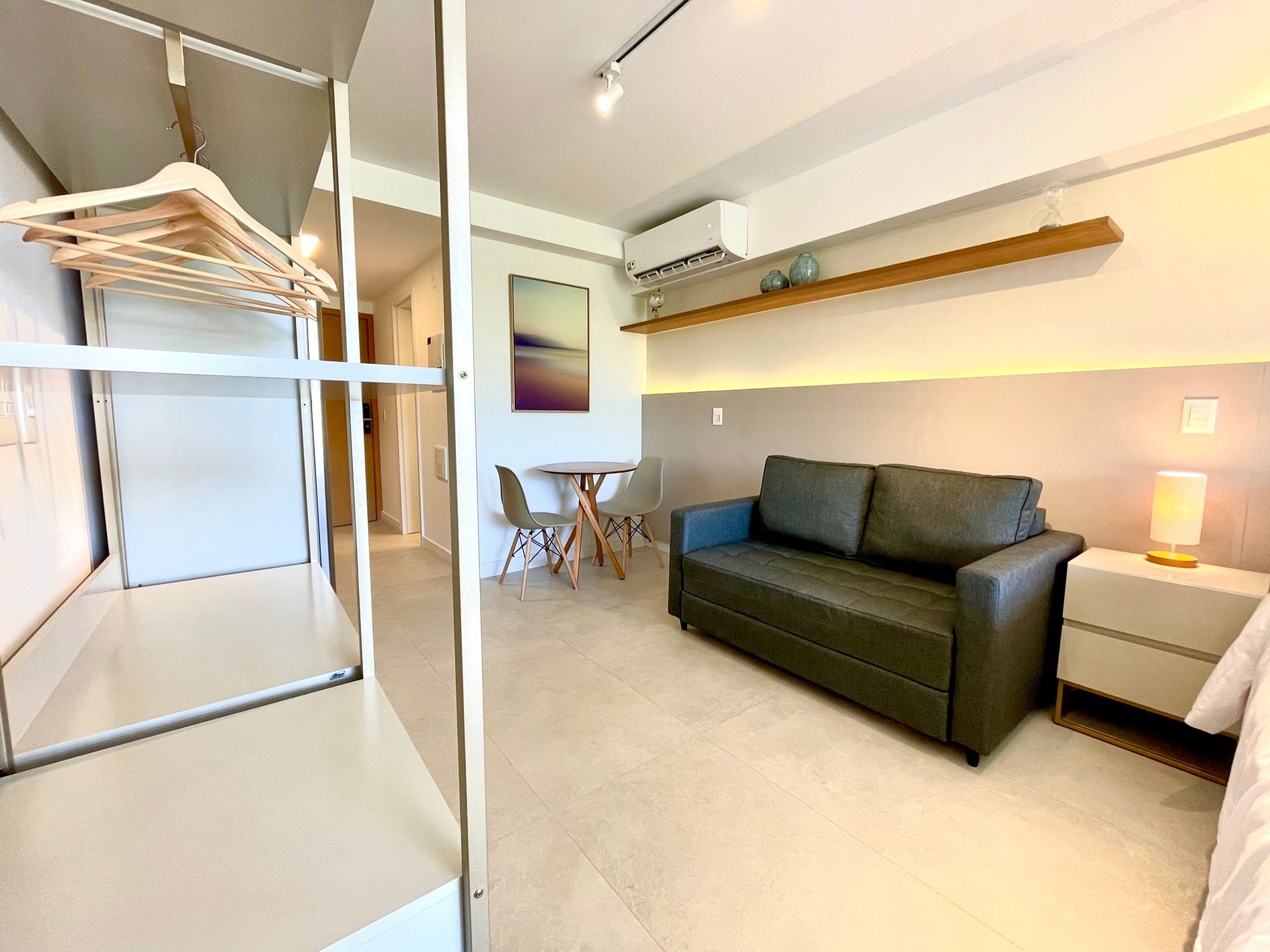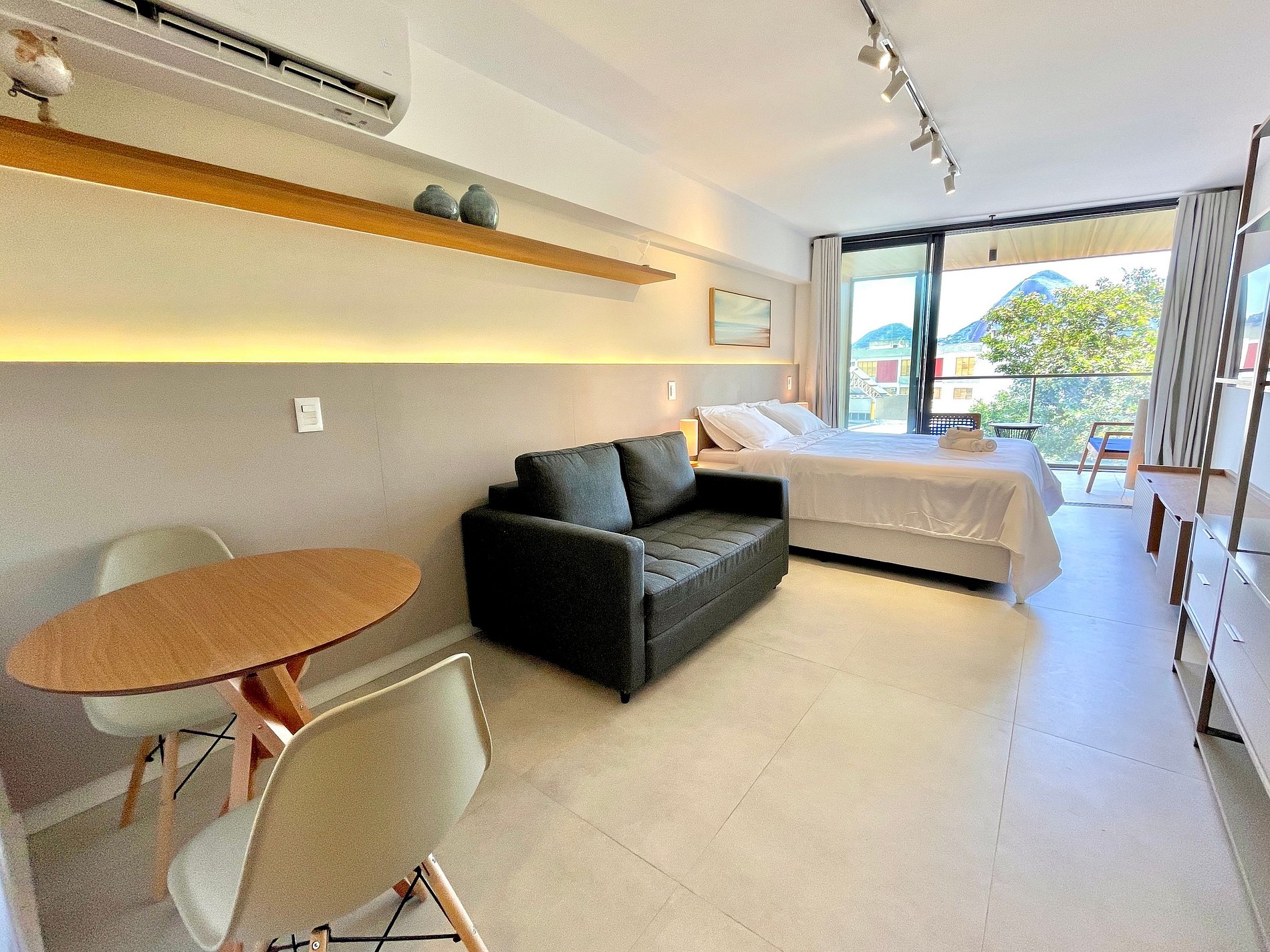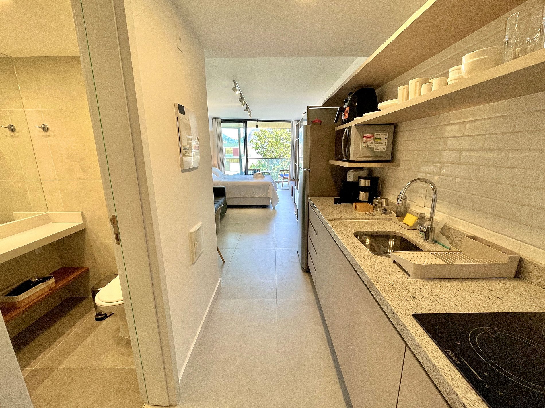 Dormitorio/sala de estar súper agradable con sofá cama, cama queen, closets, aire acondicionado, Smart TV, cortinas blackout, mesa de comedor, varios enchufes, además de un balcón súper encantador. Internet de alta velocidad. Baño completo con ducha con buena presión. Cocina equipada con frigorífico, vitrocerámica, microondas, cafetera Nespresso, Airfryer, filtro de agua y utensilios varios. También ofrece otras comodidades, como cuna portátil, secador de pelo, tabla de planchar y plancha y kit de amenidades (champú, acondicionador y jabón).