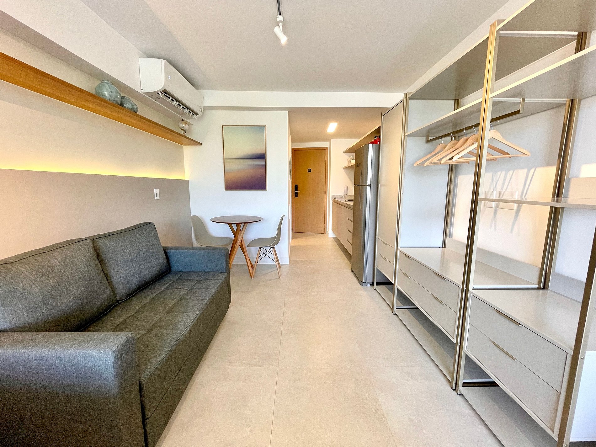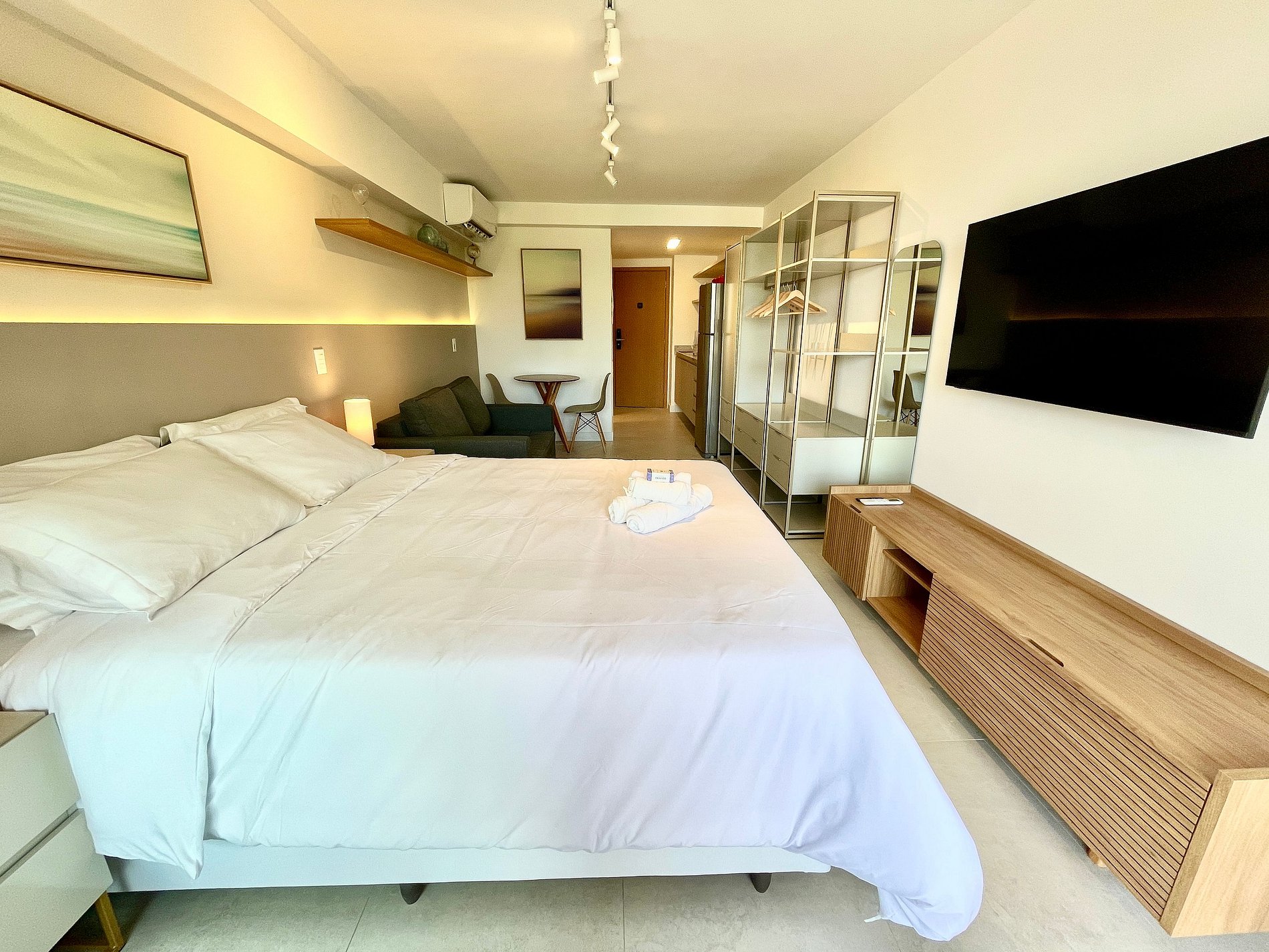 Dormitorio/sala de estar súper agradable con sofá cama, cama queen, closets, aire acondicionado, Smart TV, cortinas blackout, mesa de comedor, varios enchufes, además de un balcón súper encantador. Internet de alta velocidad. Baño completo con ducha con buena presión. Cocina equipada con frigorífico, vitrocerámica, microondas, cafetera Nespresso, Airfryer, filtro de agua y utensilios varios. También ofrece otras comodidades, como cuna portátil, secador de pelo, tabla de planchar y plancha y kit de amenidades (champú, acondicionador y jabón).