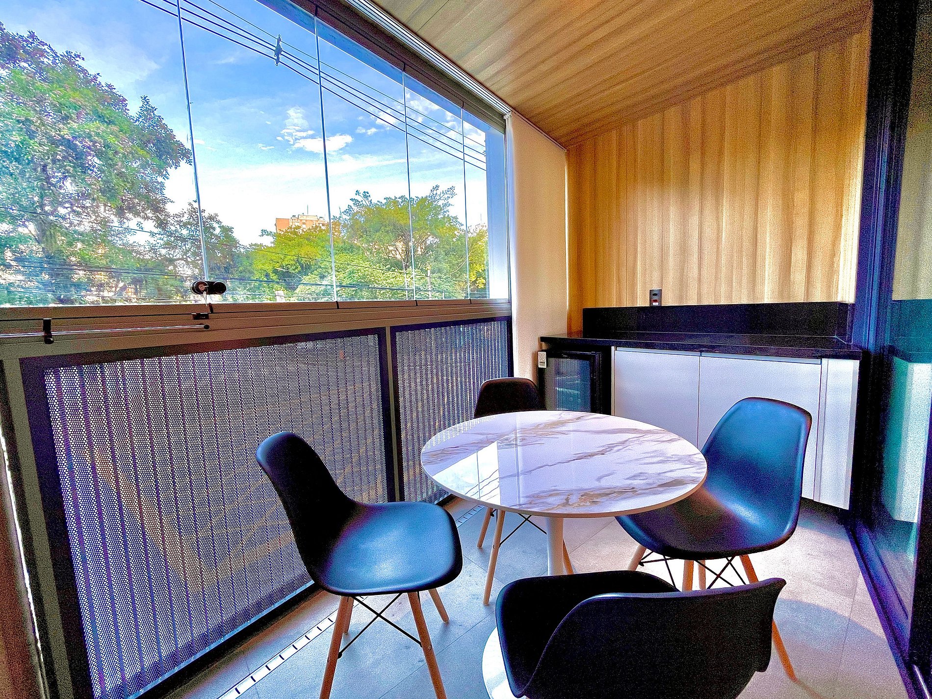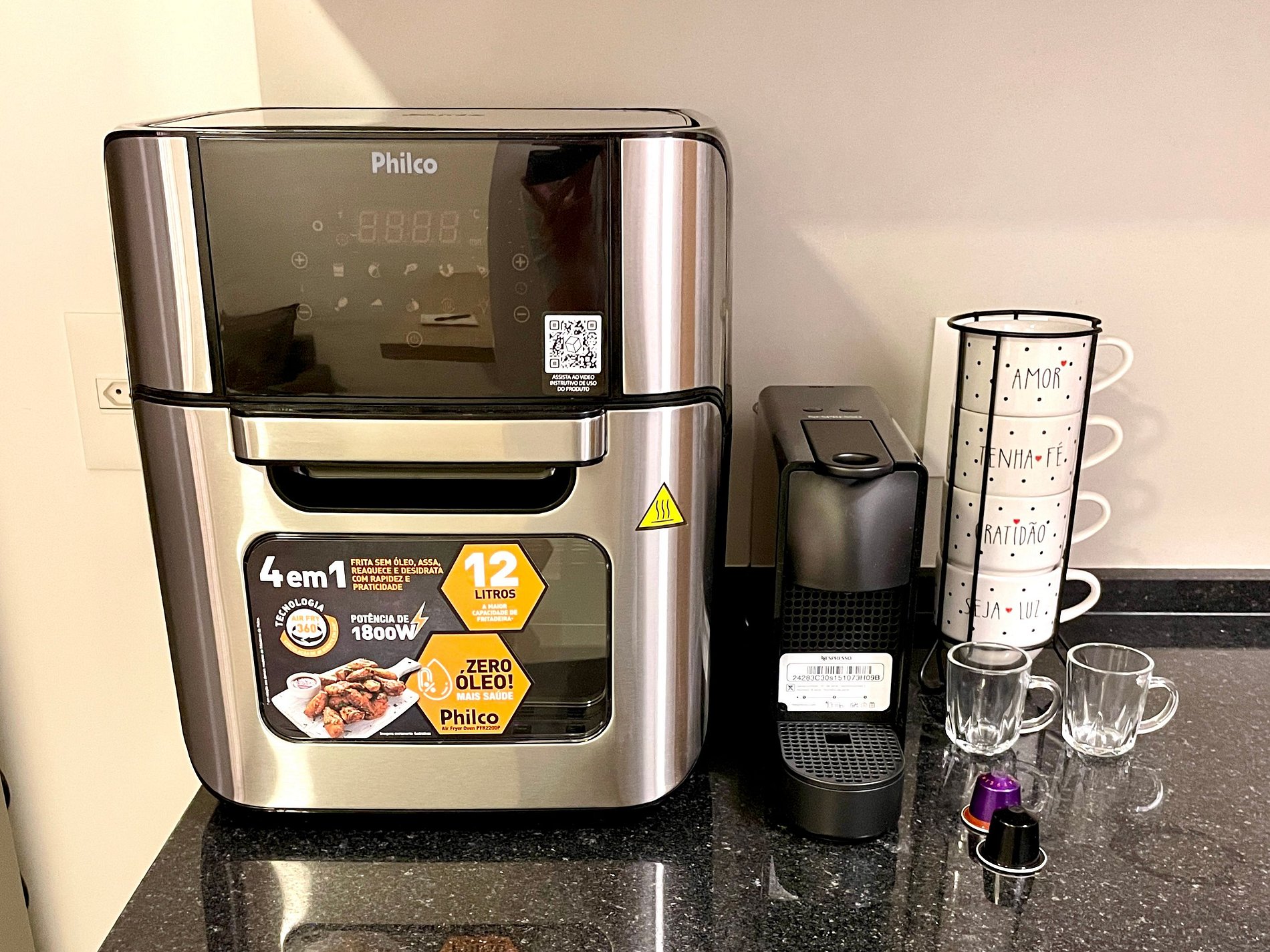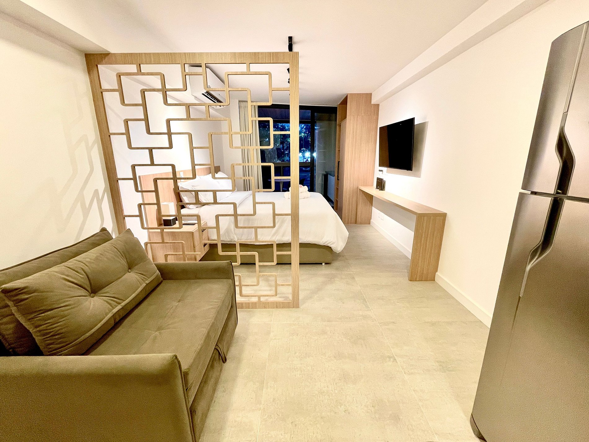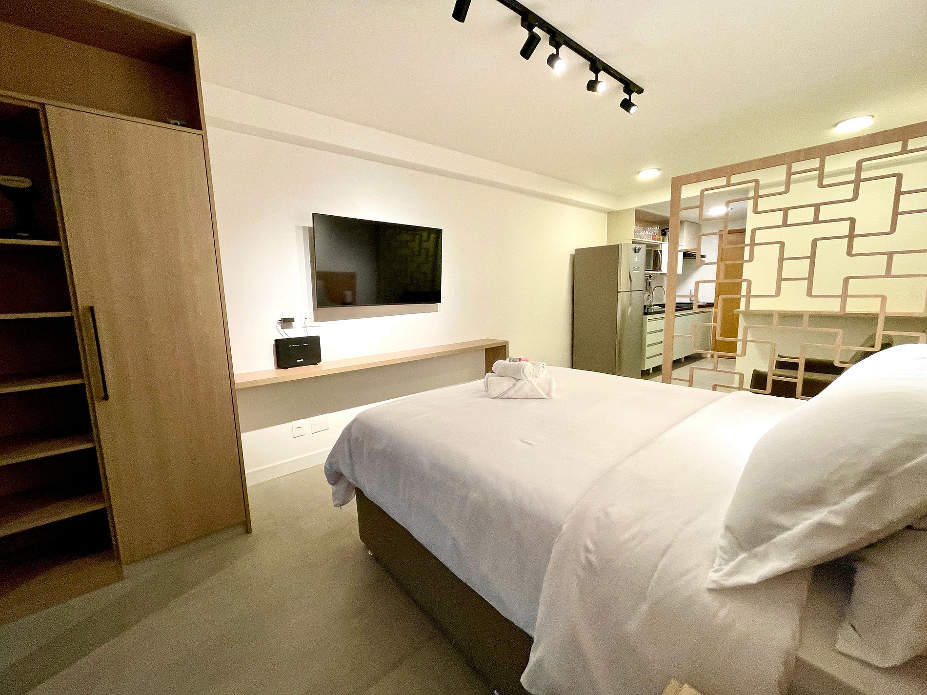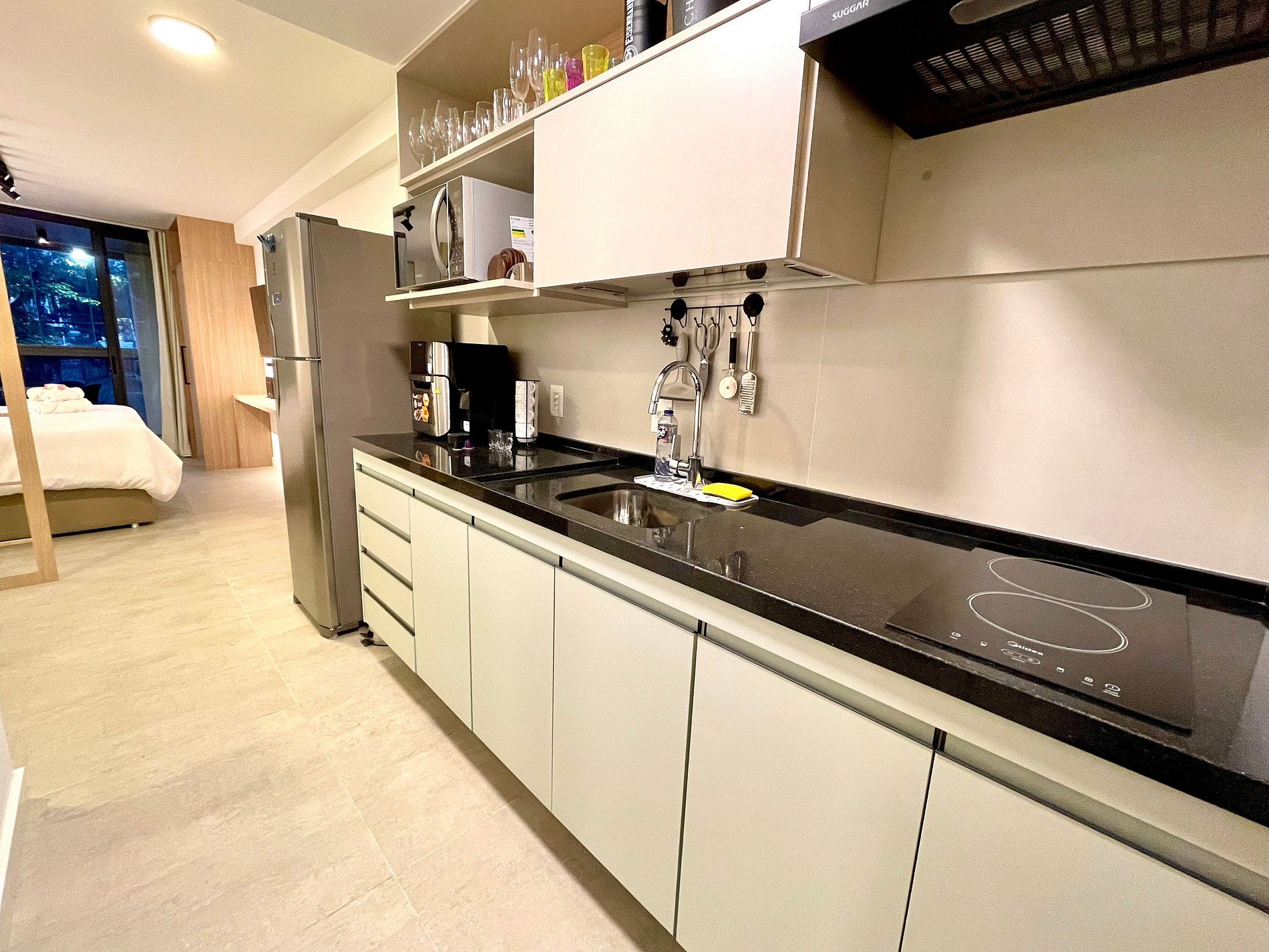 Studio súper agradable con una cómoda cama queen, sofá cama individual, armarios, aire acondicionado potente, Smart TV de 50 pulgadas, cortinas blackout, mesa de comedor y numerosos enchufes. También cuenta con un encantador balcón con vistas al Cristo Redentor, a las montañas y a la calle. Dispone de acceso a internet de alta velocidad. El baño está completamente equipado con ducha con buena presión. Cocina equipada con refrigerador, vitrocerámica, campana, microondas, cafetera Nespresso, Airfryer y varios utensilios. Otras comodidades incluyen una cuna portátil*, secador de pelo, steamer a vapor y kit de amenidades (champú, acondicionador y jabón).