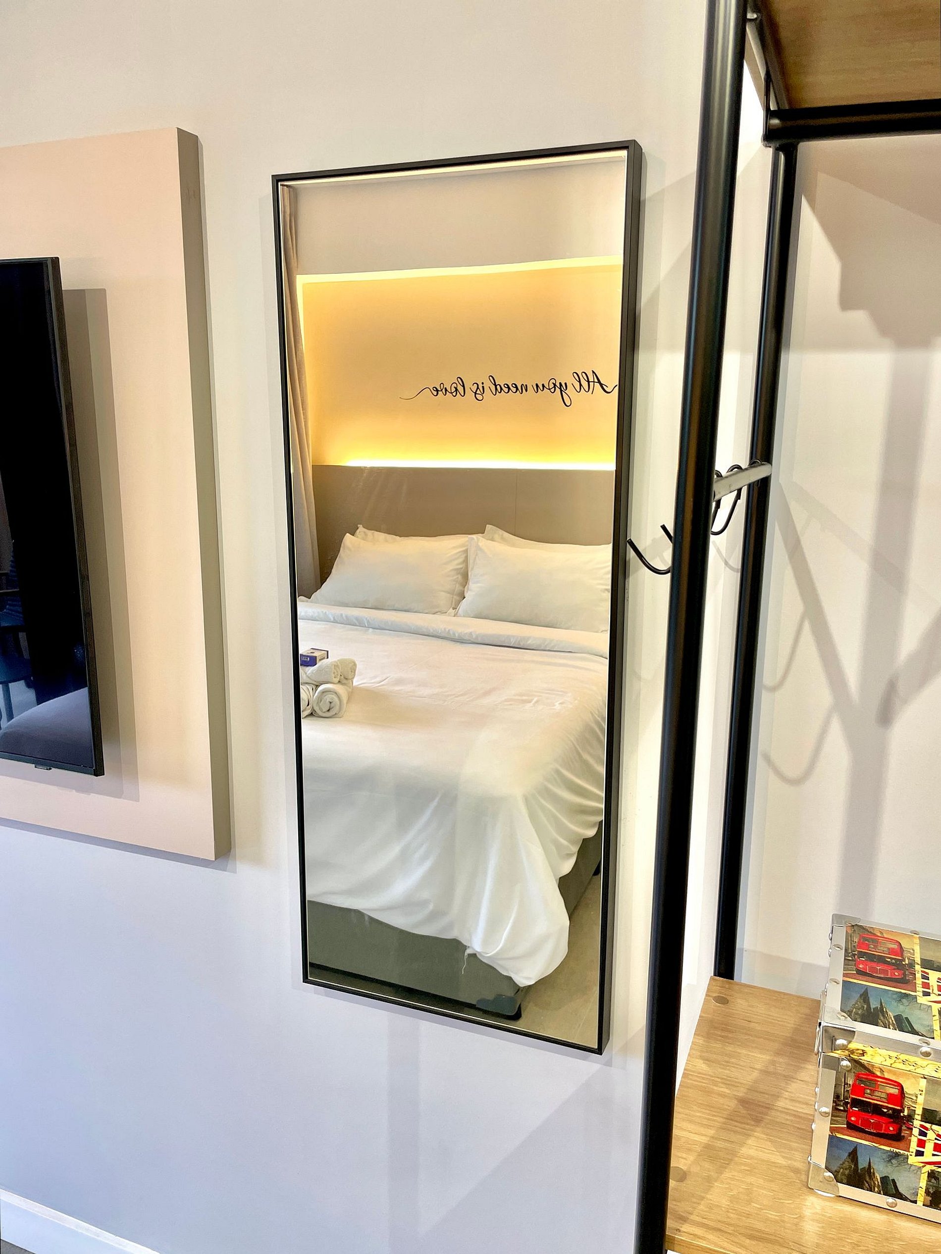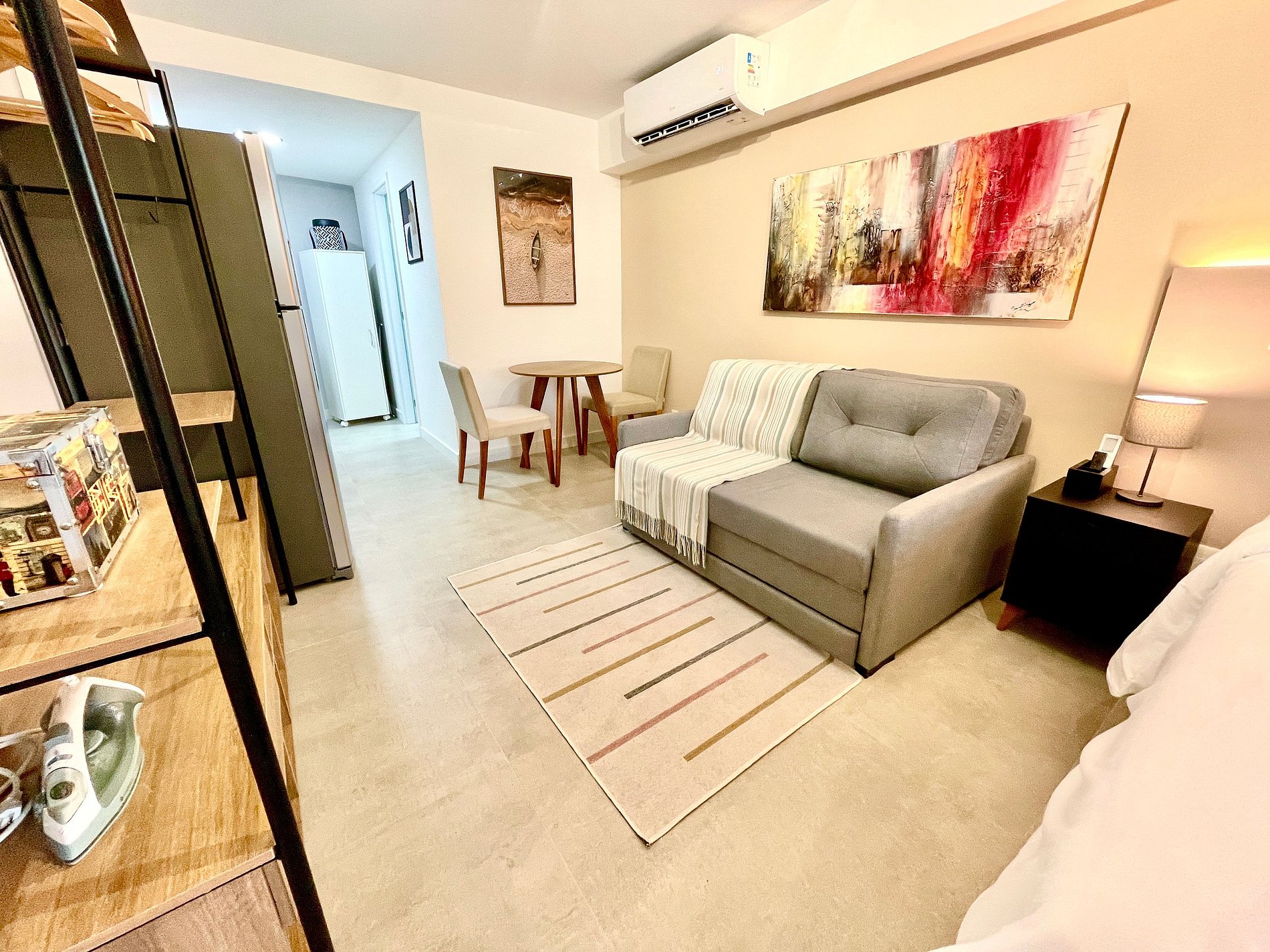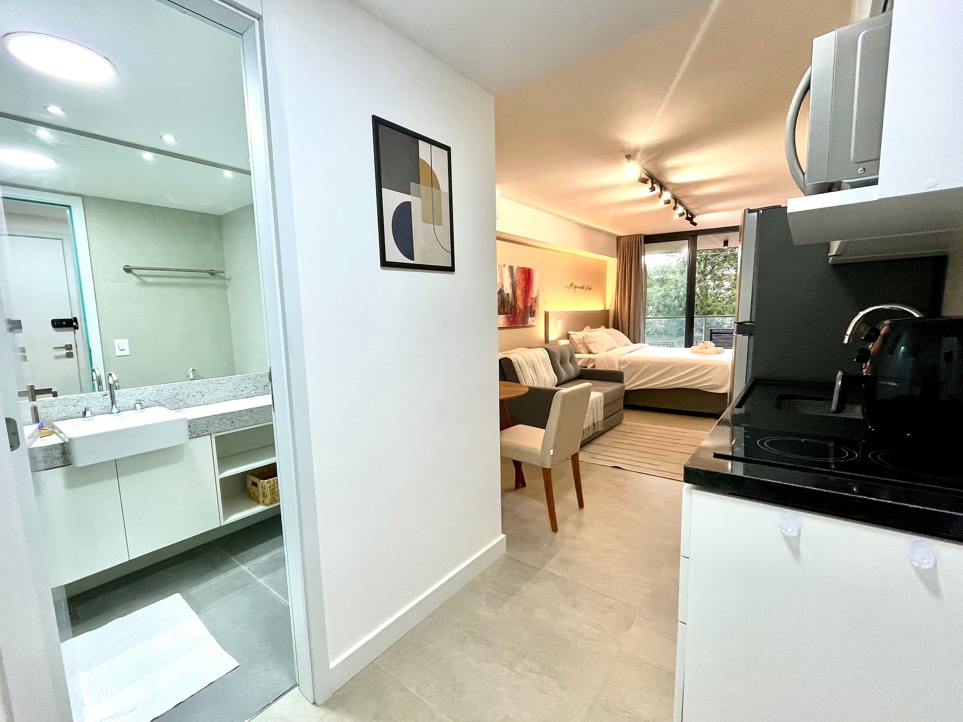 El espacio es completo y ofrece un dormitorio/sala súper agradable con excelente decoración, sofá cama premium (cama matrimonial), cama queen, closets, aire acondicionado, Smart TV, cortina blackout, mesa de comedor, lavadora, internet de alta velocidad, en ¡Además de tener un balcón súper encantador con VISTAS AL CRISTO! Baño completo y ducha con buena presión. Cocina equipada con frigorífico, vitrocerámica, microondas, cafetera Nespresso, Sandwichera Grill, Airfryer y utensilios varios. También ofrece otras comodidades, como cuna portátil, secador de pelo, tabla de planchar y plancha y kit de amenidades (champú, acondicionador y jabón).
