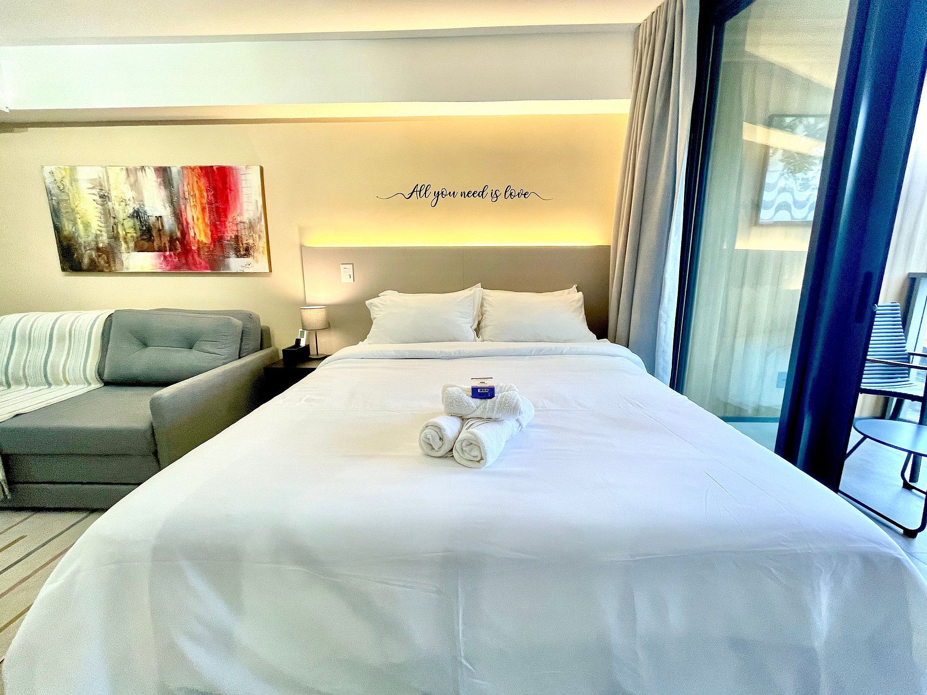 El espacio es completo y ofrece un dormitorio/sala súper agradable con excelente decoración, sofá cama premium (cama matrimonial), cama queen, closets, aire acondicionado, Smart TV, cortina blackout, mesa de comedor, lavadora, internet de alta velocidad, en ¡Además de tener un balcón súper encantador con VISTAS AL CRISTO! Baño completo y ducha con buena presión. Cocina equipada con frigorífico, vitrocerámica, microondas, cafetera Nespresso, Sandwichera Grill, Airfryer y utensilios varios. También ofrece otras comodidades, como cuna portátil, secador de pelo, tabla de planchar y plancha y kit de amenidades (champú, acondicionador y jabón).