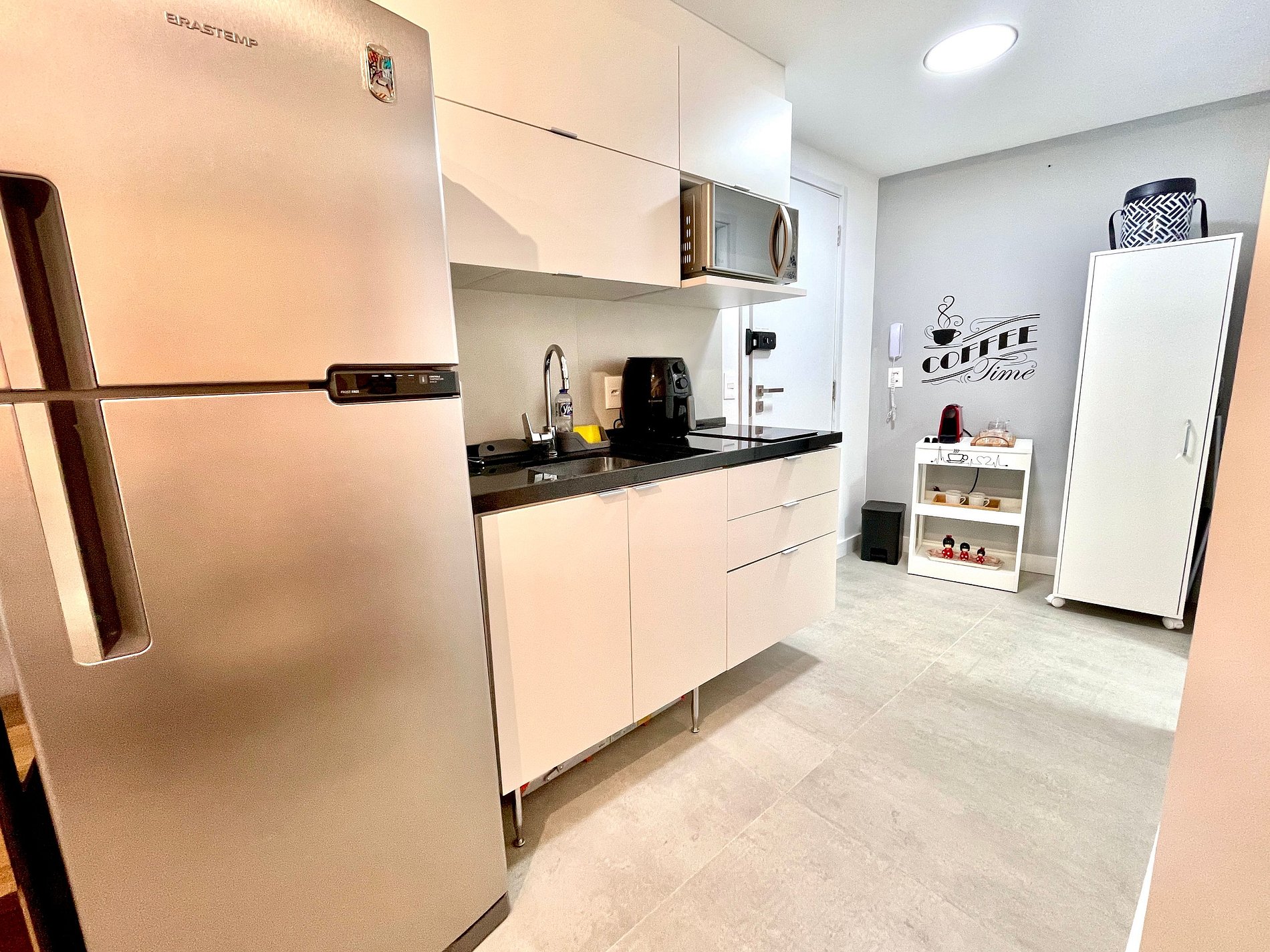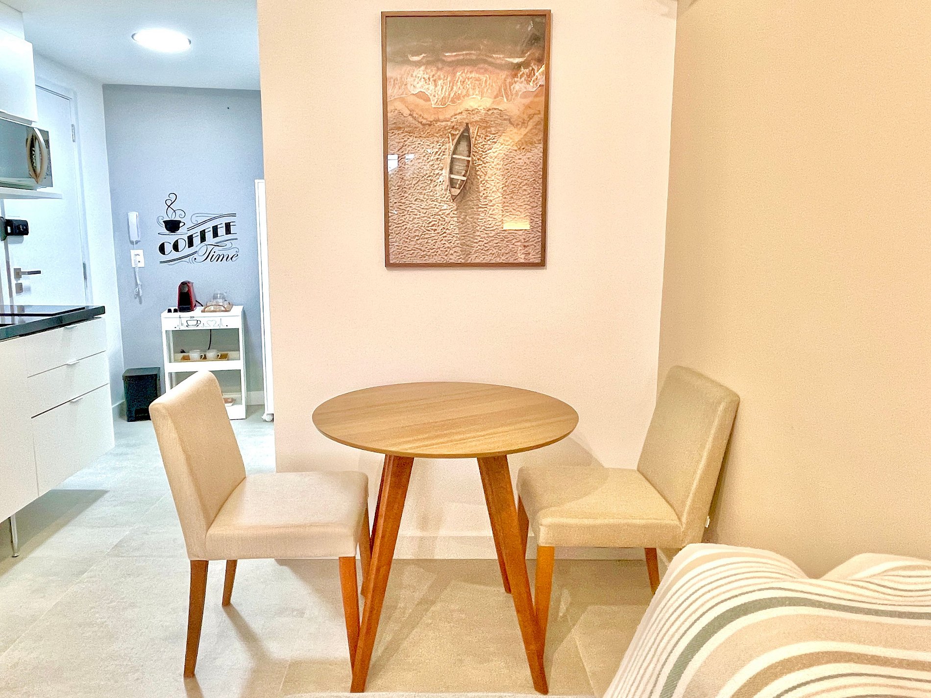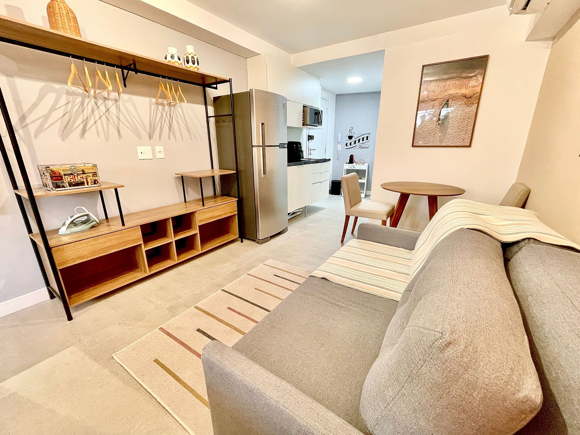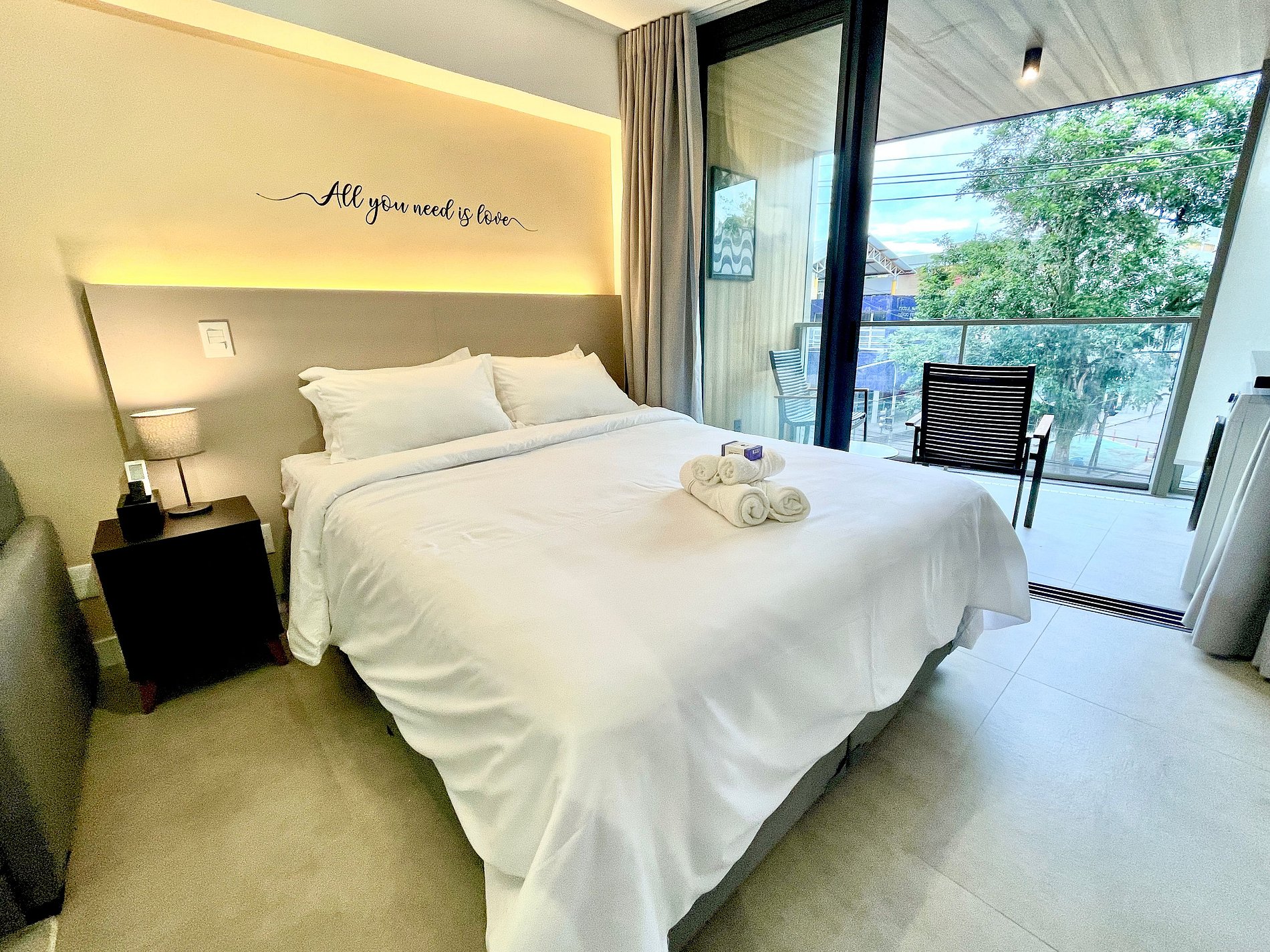 El espacio es completo y ofrece un dormitorio/sala súper agradable con excelente decoración, sofá cama premium (cama matrimonial), cama queen, closets, aire acondicionado, Smart TV, cortina blackout, mesa de comedor, lavadora, internet de alta velocidad, en ¡Además de tener un balcón súper encantador con VISTAS AL CRISTO! Baño completo y ducha con buena presión. Cocina equipada con frigorífico, vitrocerámica, microondas, cafetera Nespresso, Sandwichera Grill, Airfryer y utensilios varios. También ofrece otras comodidades, como cuna portátil, secador de pelo, tabla de planchar y plancha y kit de amenidades (champú, acondicionador y jabón).