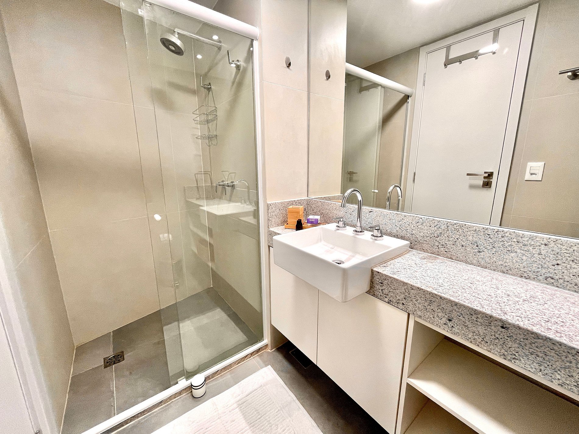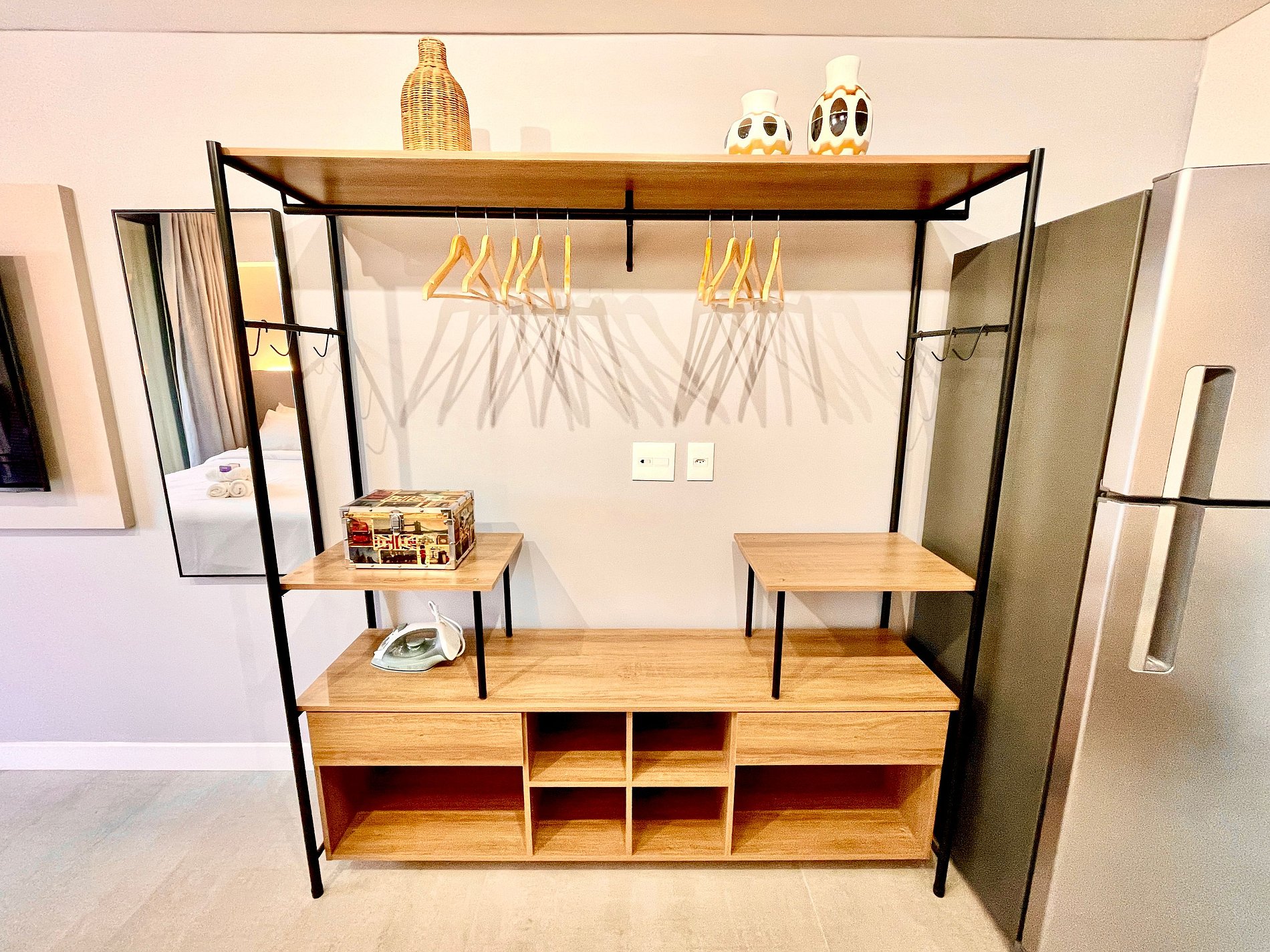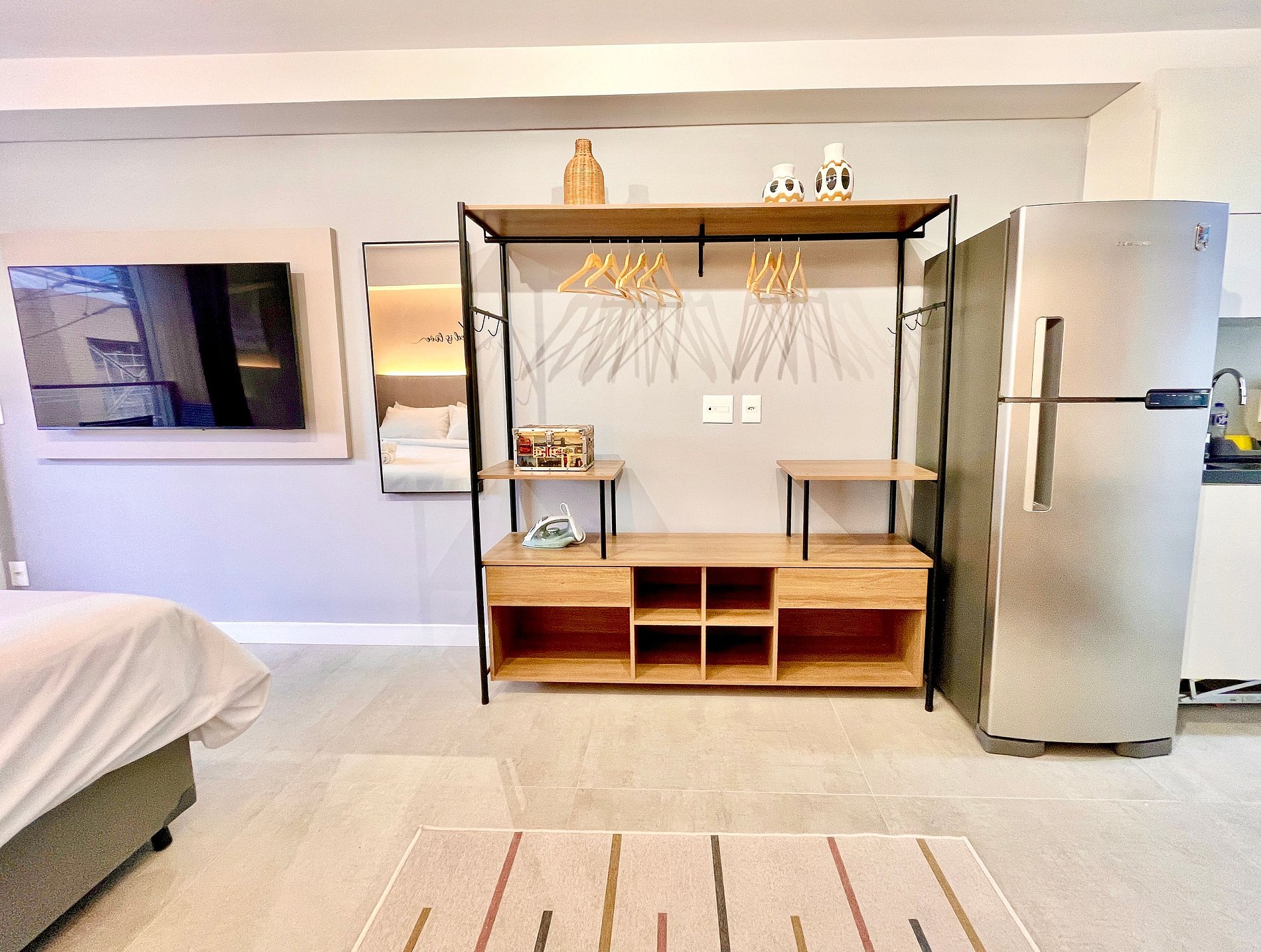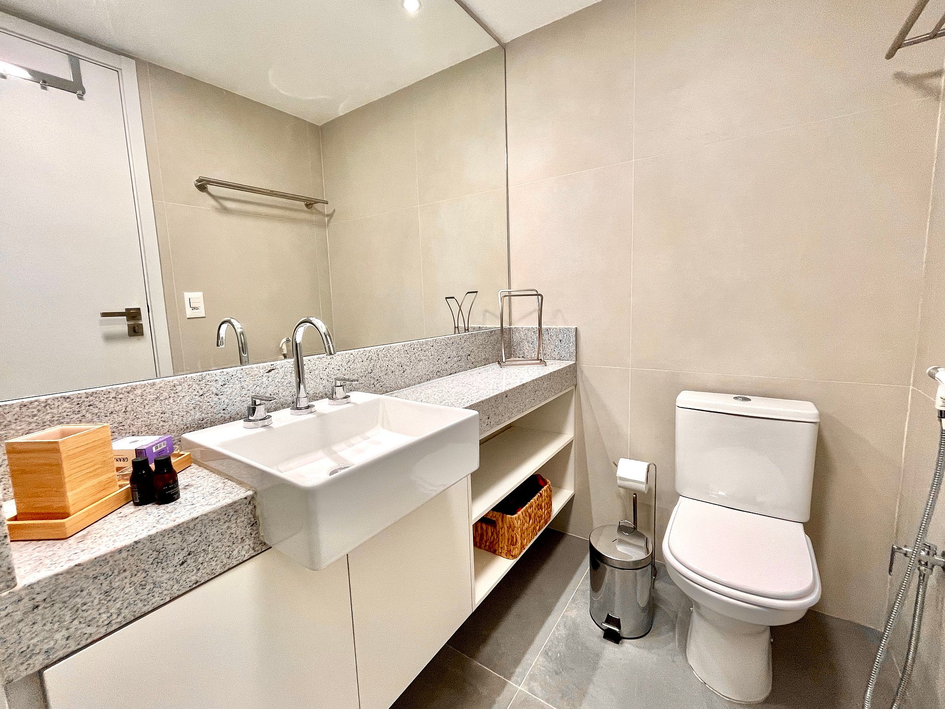 El espacio es completo y ofrece un dormitorio/sala súper agradable con excelente decoración, sofá cama premium (cama matrimonial), cama queen, closets, aire acondicionado, Smart TV, cortina blackout, mesa de comedor, lavadora, internet de alta velocidad, en ¡Además de tener un balcón súper encantador con VISTAS AL CRISTO! Baño completo y ducha con buena presión. Cocina equipada con frigorífico, vitrocerámica, microondas, cafetera Nespresso, Sandwichera Grill, Airfryer y utensilios varios. También ofrece otras comodidades, como cuna portátil, secador de pelo, tabla de planchar y plancha y kit de amenidades (champú, acondicionador y jabón).