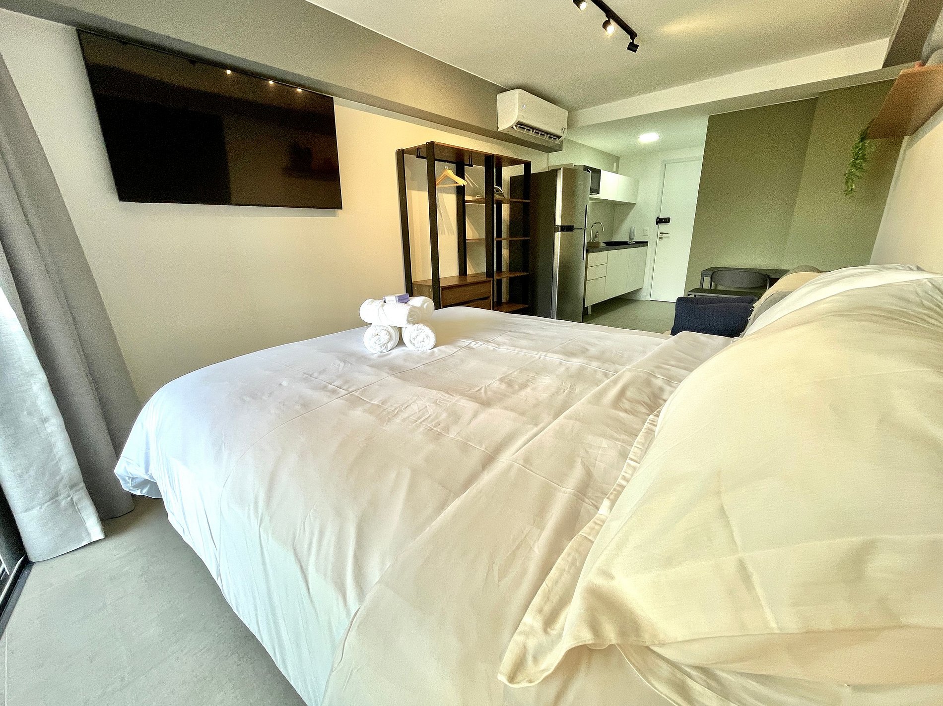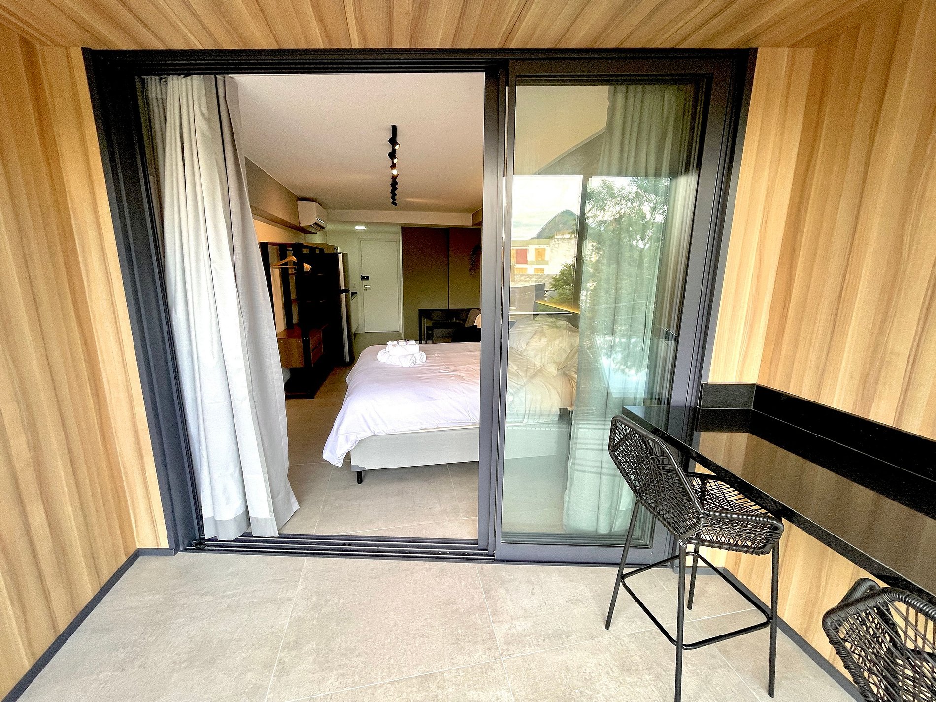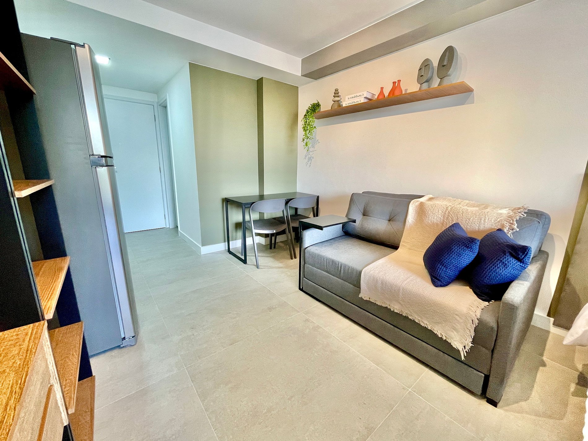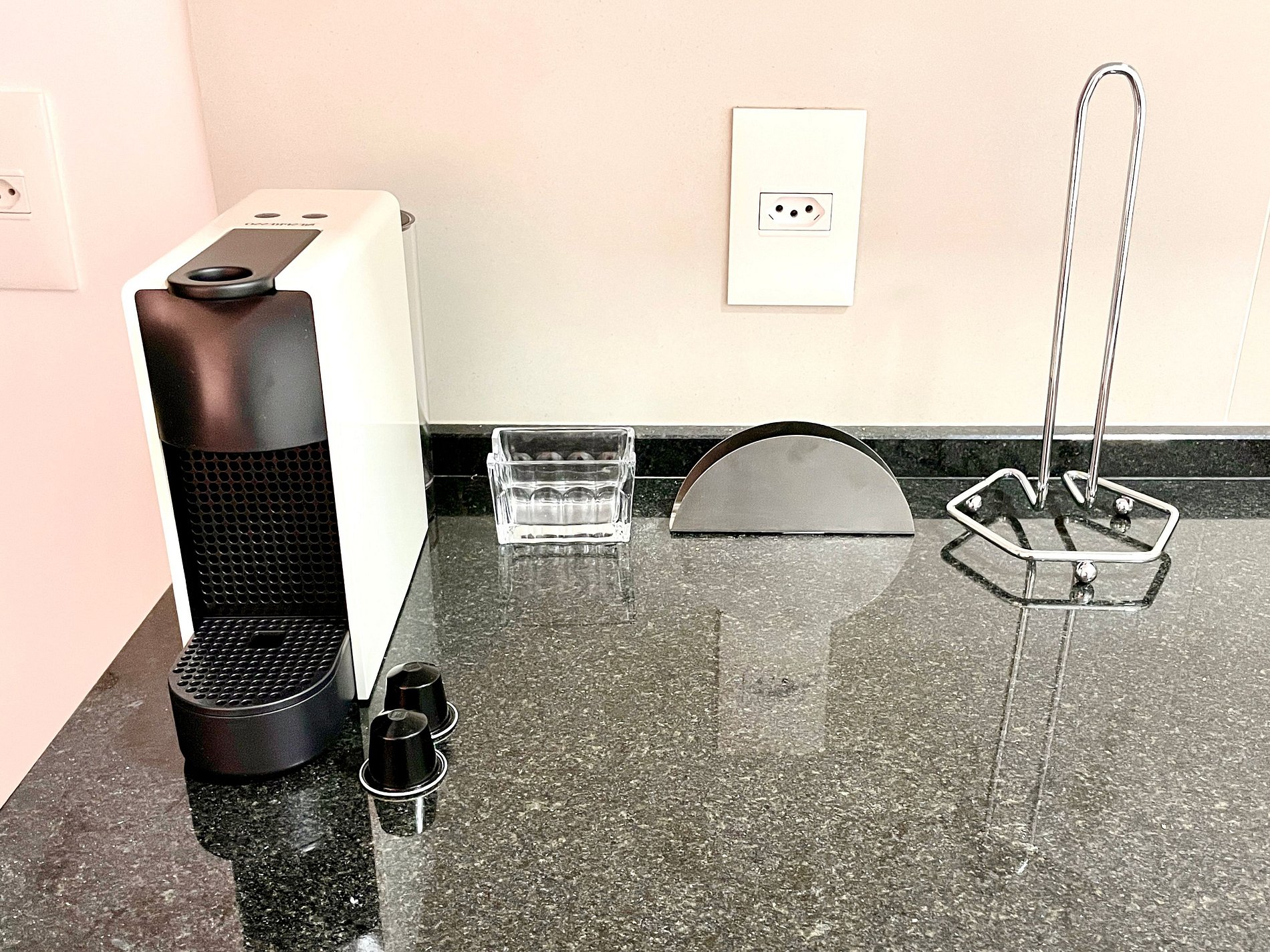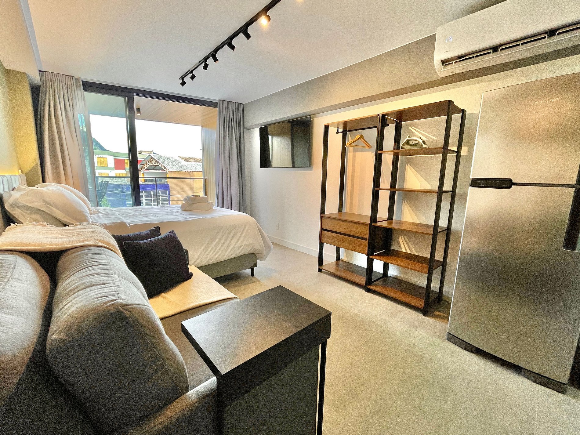 Dormitorio/sala de estar súper agradable con sofá cama, cama queen, closets, aire acondicionado, Smart TV, cortinas blackout, mesa de comedor, varios enchufes, además de un balcón súper encantador. Internet de alta velocidad. Baño completo con ducha con buena presión. Cocina equipada con frigorífico, vitrocerámica, microondas, cafetera Nespresso y utensilios varios. También ofrece otras comodidades, como cuna portátil, secador de pelo, tabla de planchar y plancha y kit de amenidades (champú, acondicionador y jabón).