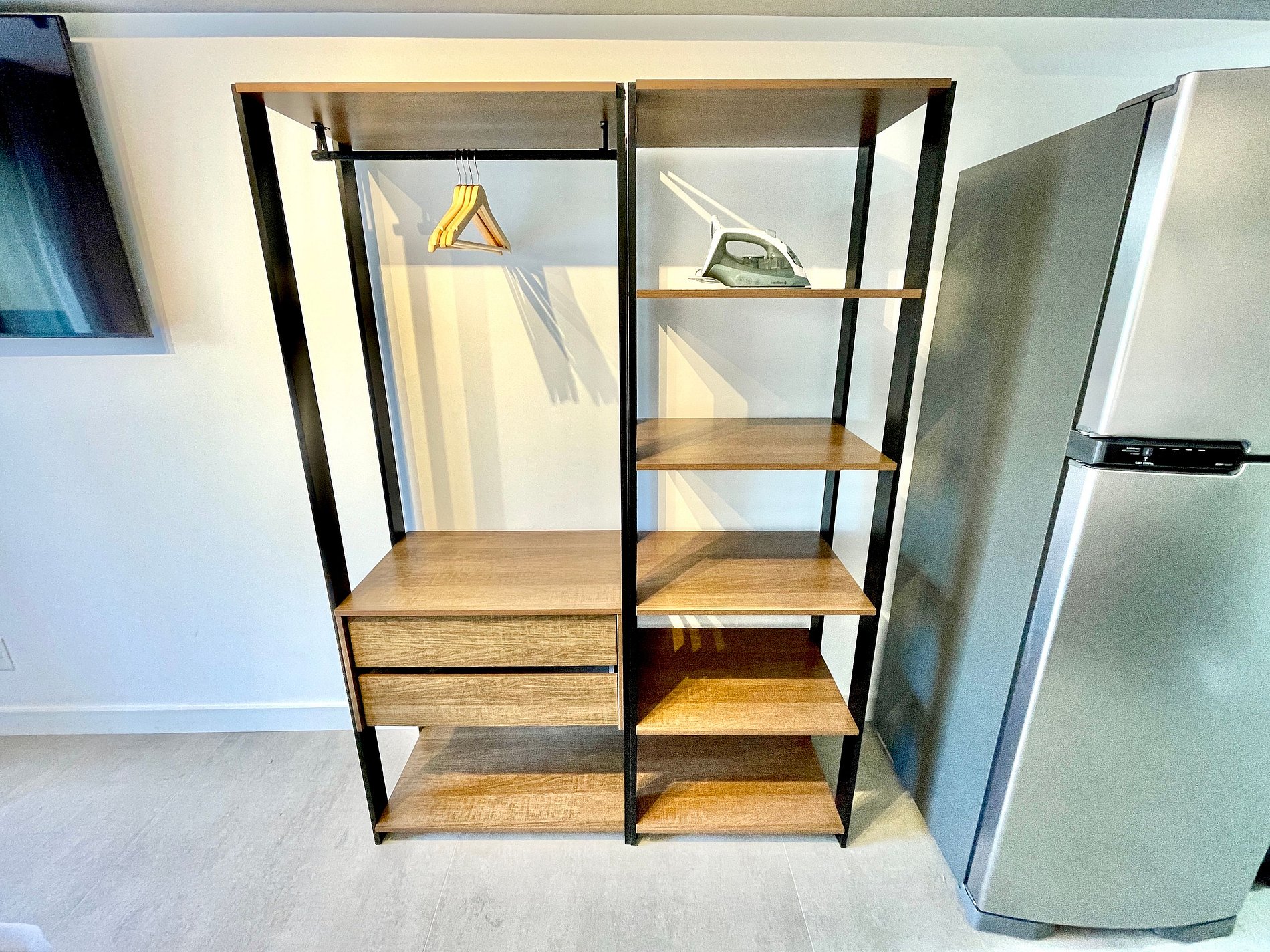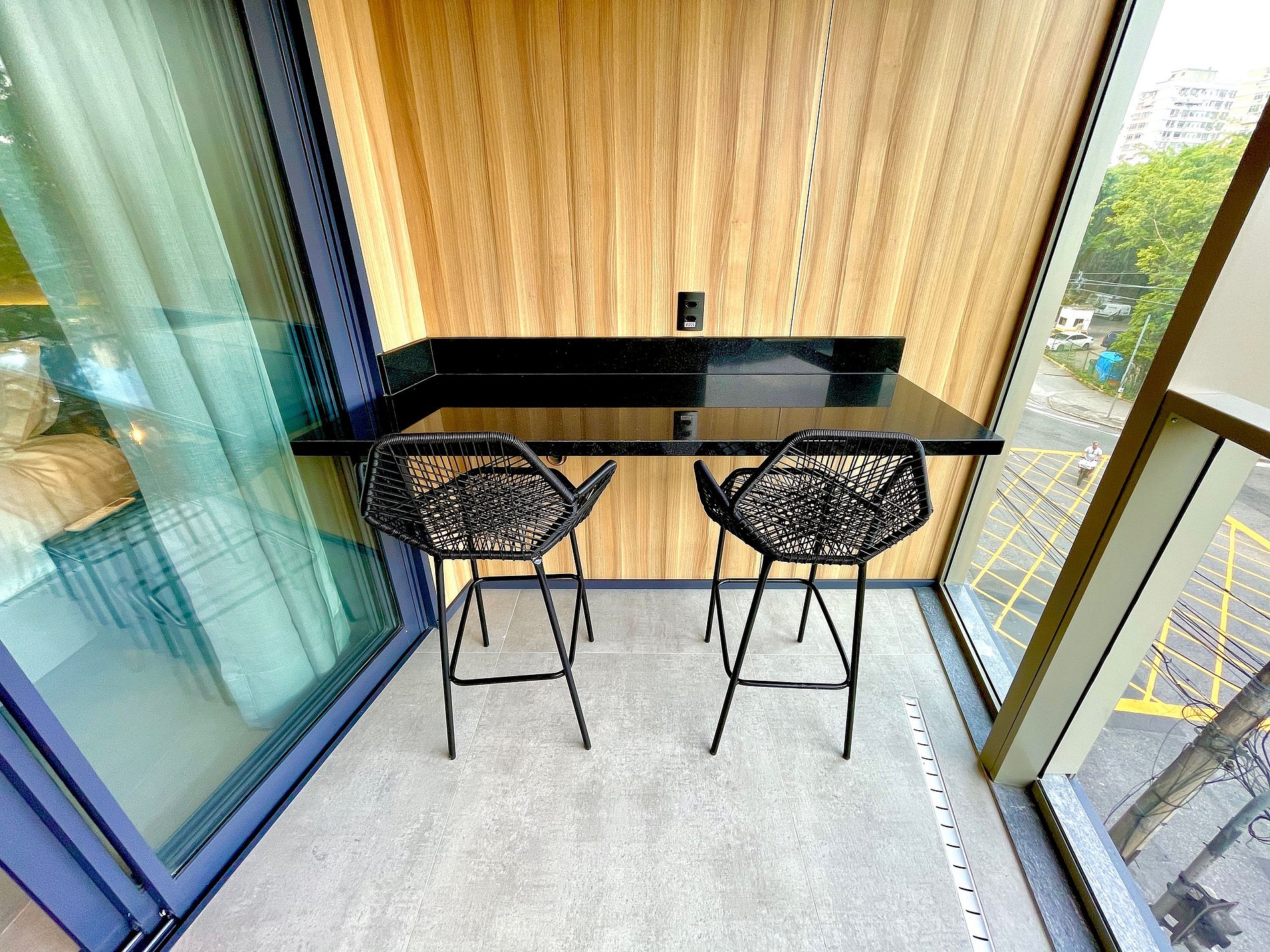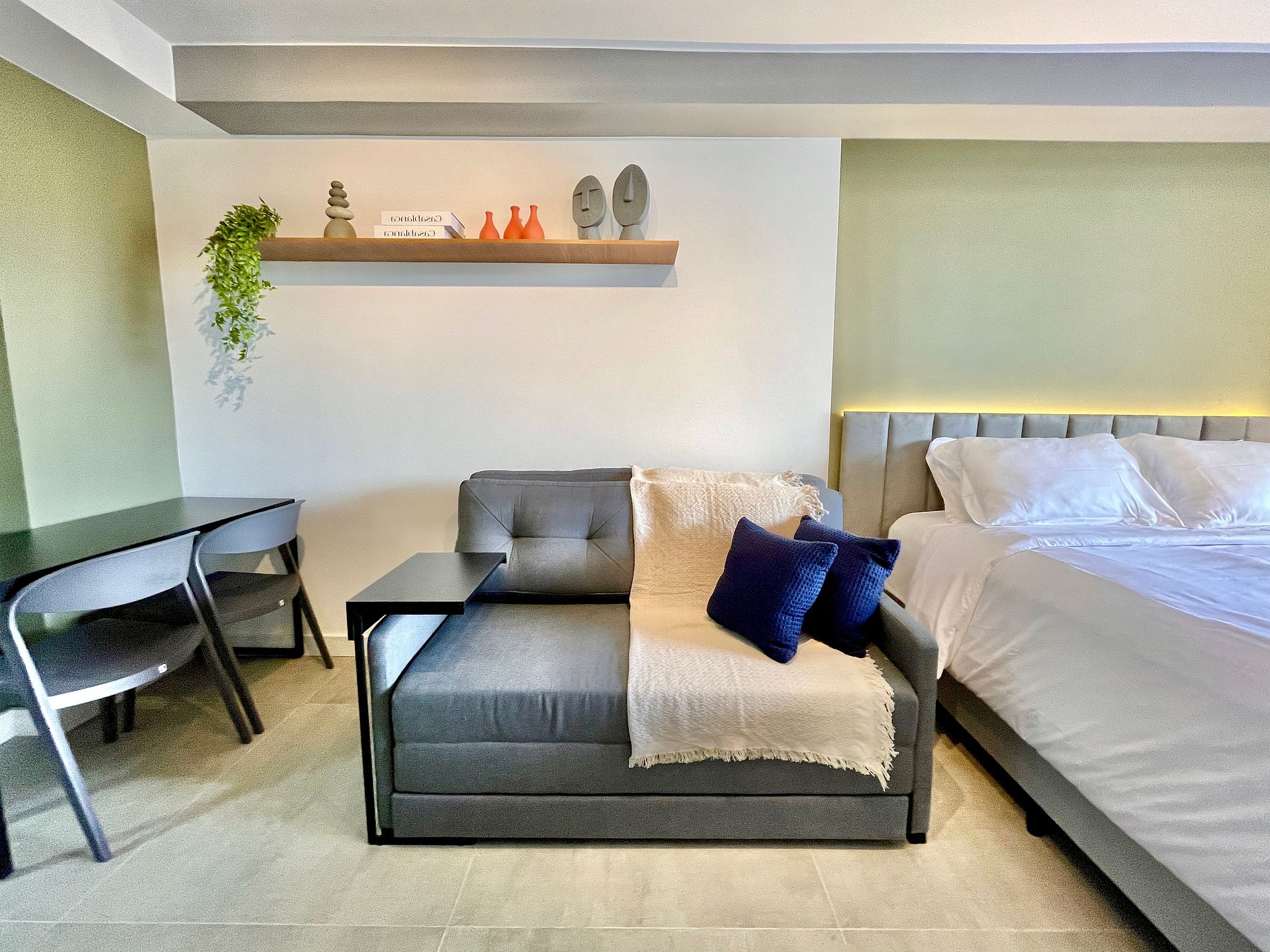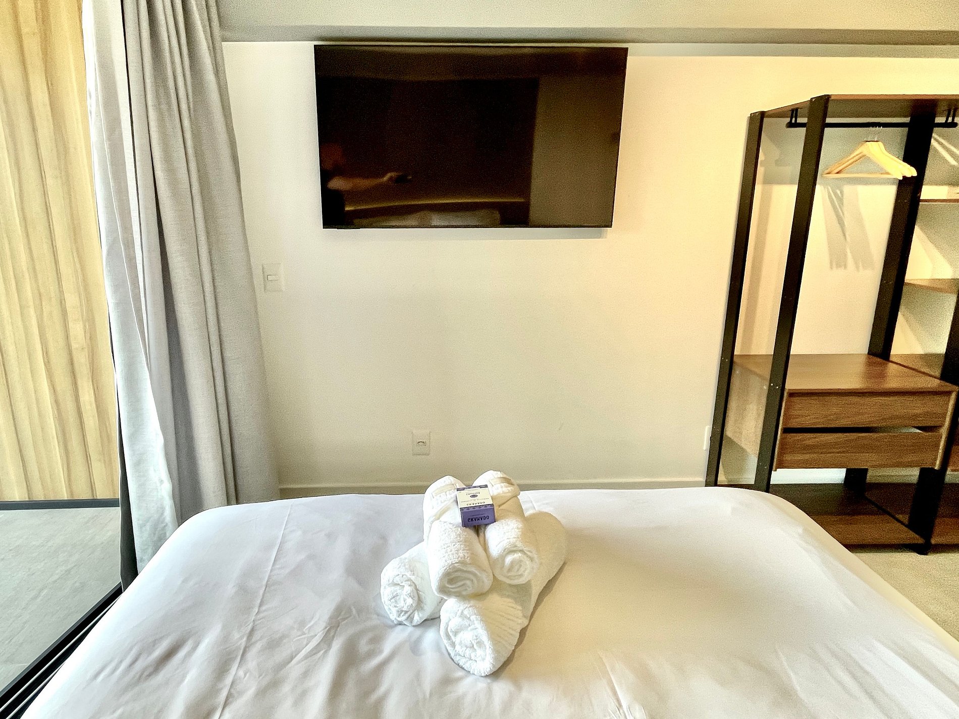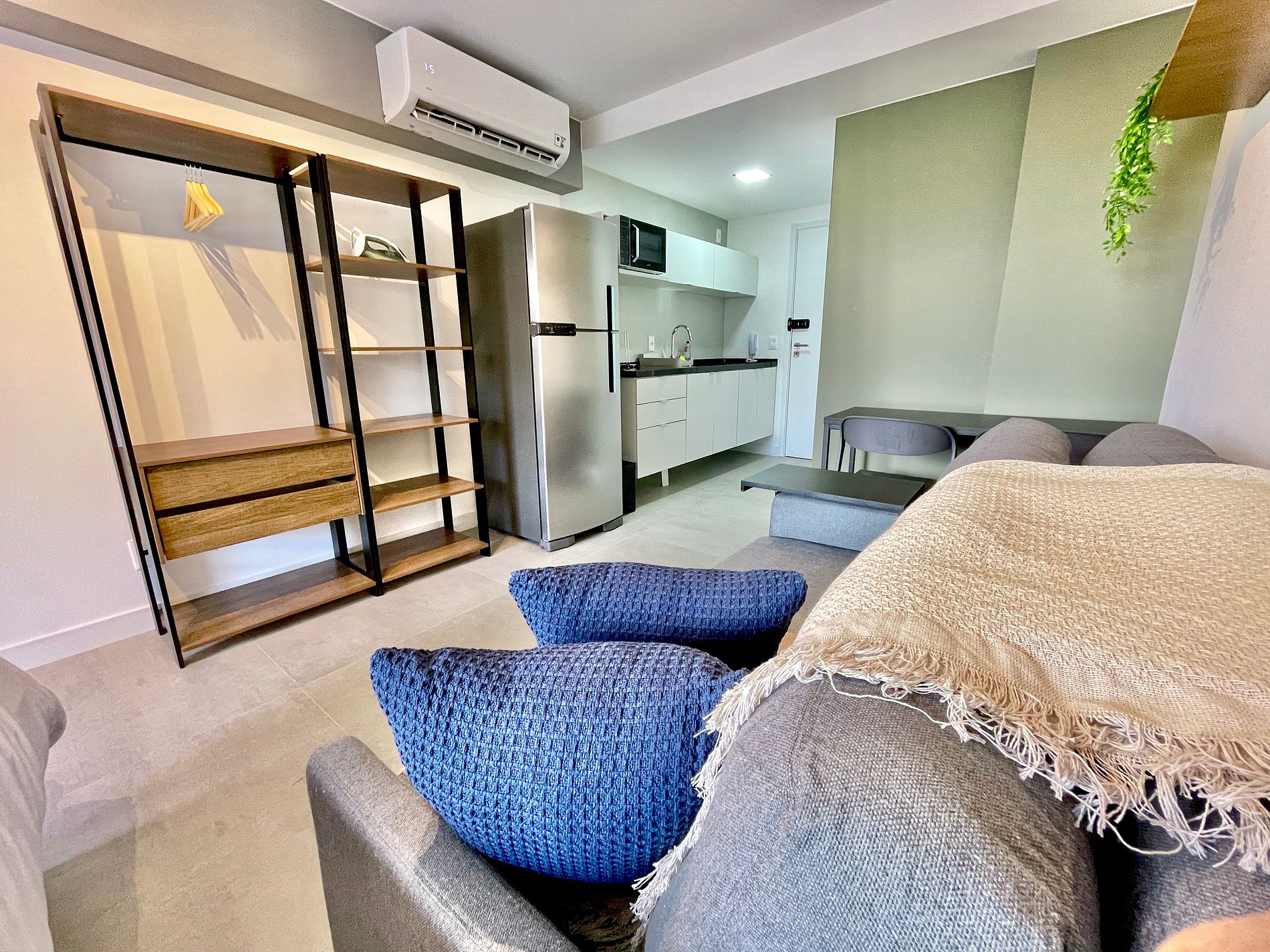 Dormitorio/sala de estar súper agradable con sofá cama, cama queen, closets, aire acondicionado, Smart TV, cortinas blackout, mesa de comedor, varios enchufes, además de un balcón súper encantador. Internet de alta velocidad. Baño completo con ducha con buena presión. Cocina equipada con frigorífico, vitrocerámica, microondas, cafetera Nespresso y utensilios varios. También ofrece otras comodidades, como cuna portátil, secador de pelo, tabla de planchar y plancha y kit de amenidades (champú, acondicionador y jabón).