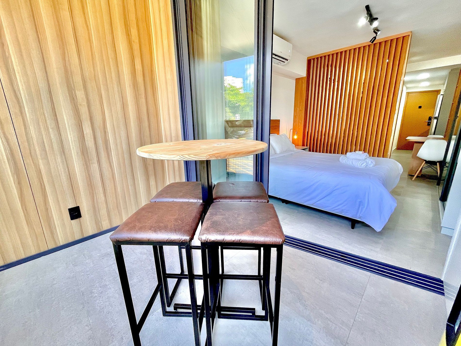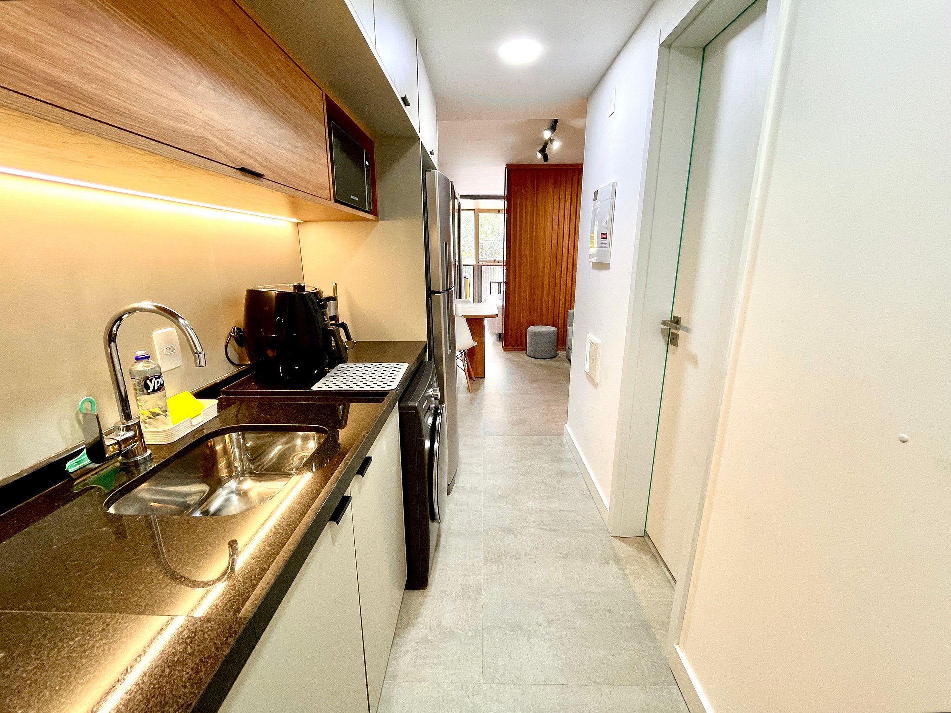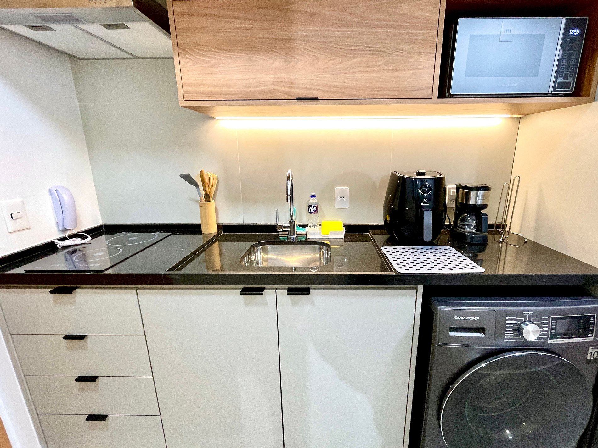 Studio súper agradable con una cómoda cama queen, sofá cama doble, armarios, aire acondicionado potente, Smart TV de 50 pulgadas, cortinas blackout, mesa de comedor y numerosos enchufes. También cuenta con un encantador balcón con vistas al Cristo Redentor, a las montañas y a la calle. Dispone de acceso a internet de alta velocidad. El baño está completamente equipado con ducha con buena presión. Cocina equipada con refrigerador, vitrocerámica, campana, microondas, cafetera, Airfryer, lavadora y secadora, y varios utensilios. Otras comodidades incluyen una cuna portátil*, secador de pelo, plancha y kit de amenidades (champú, acondicionador y jabón).