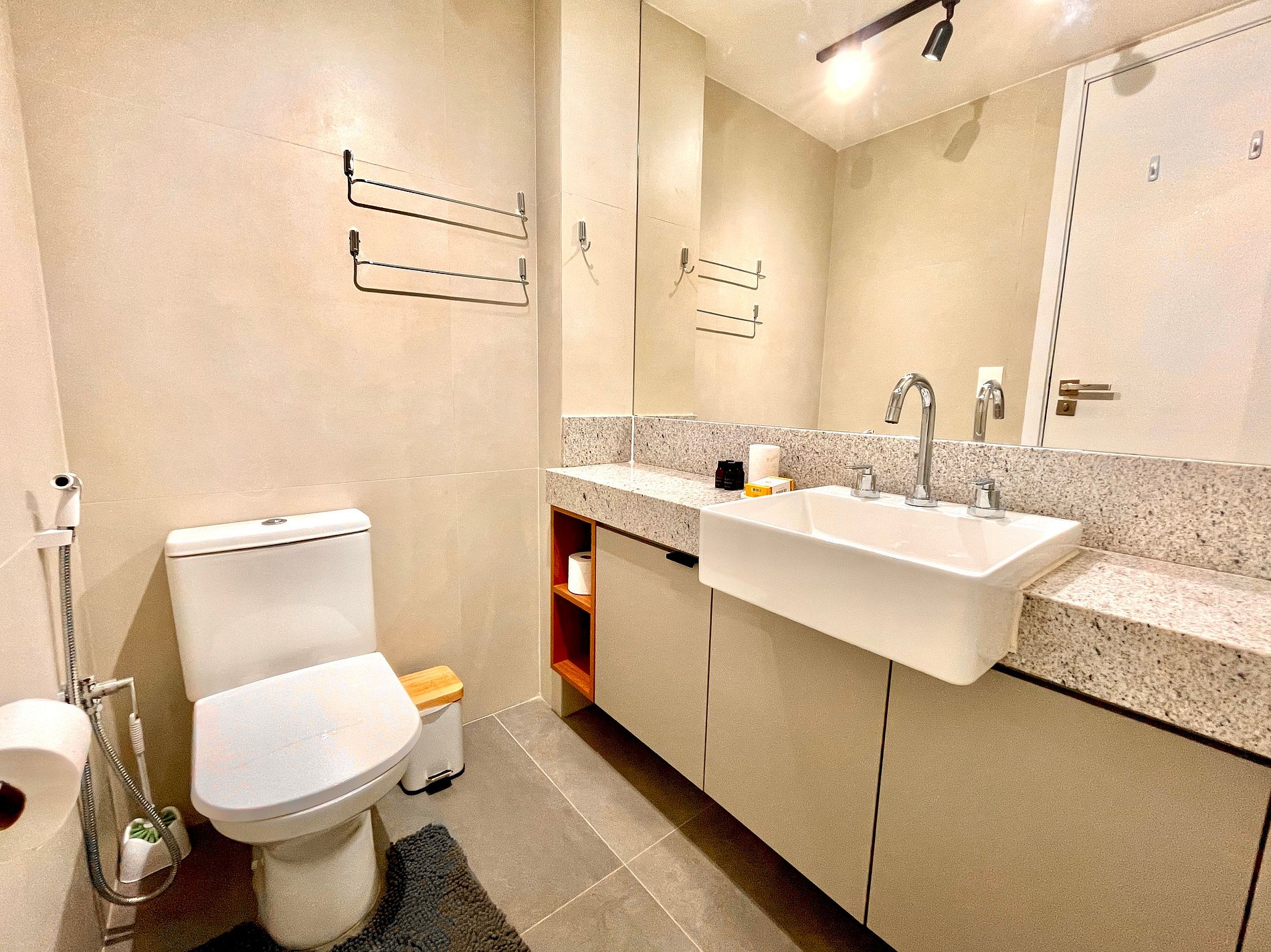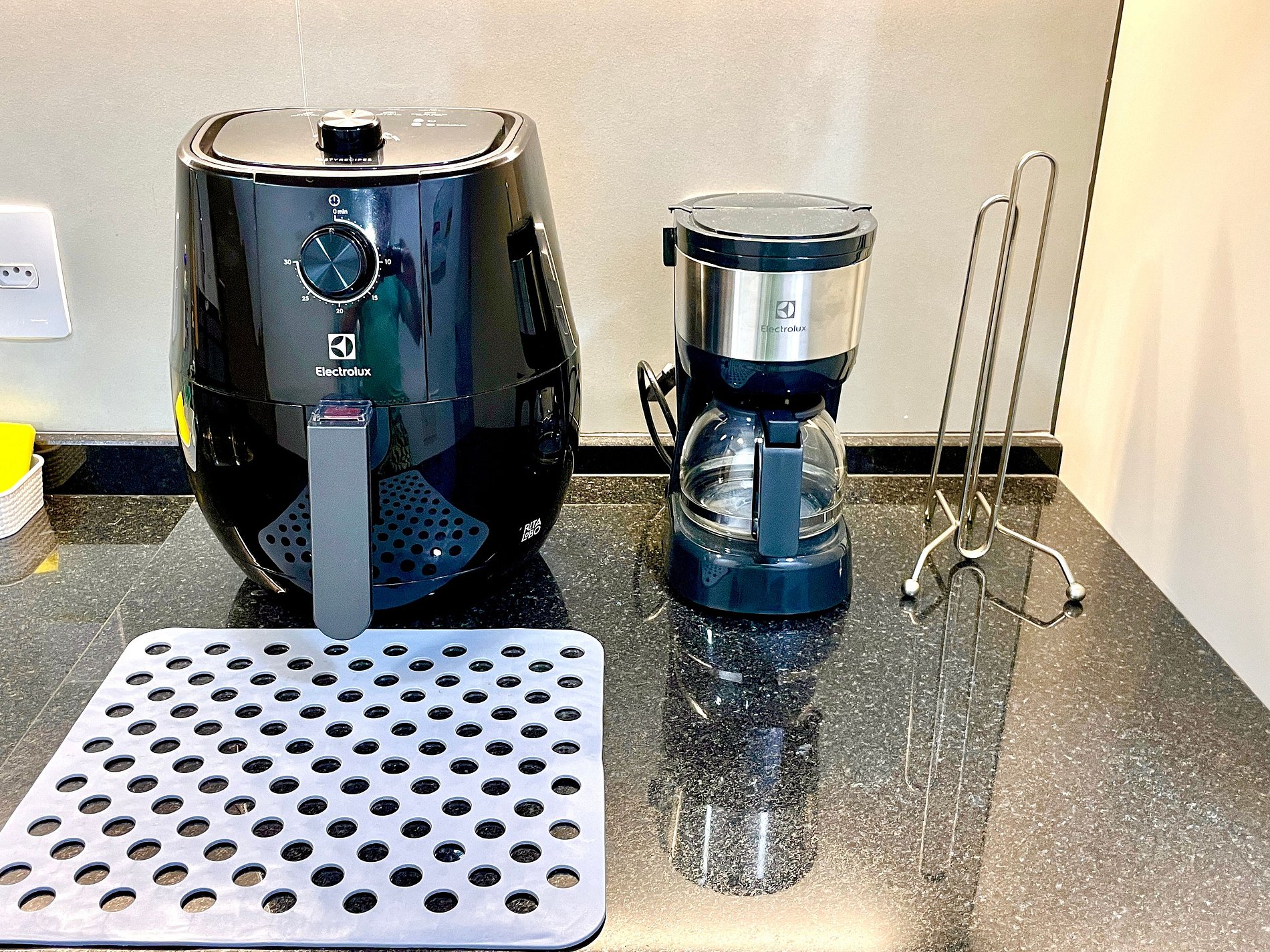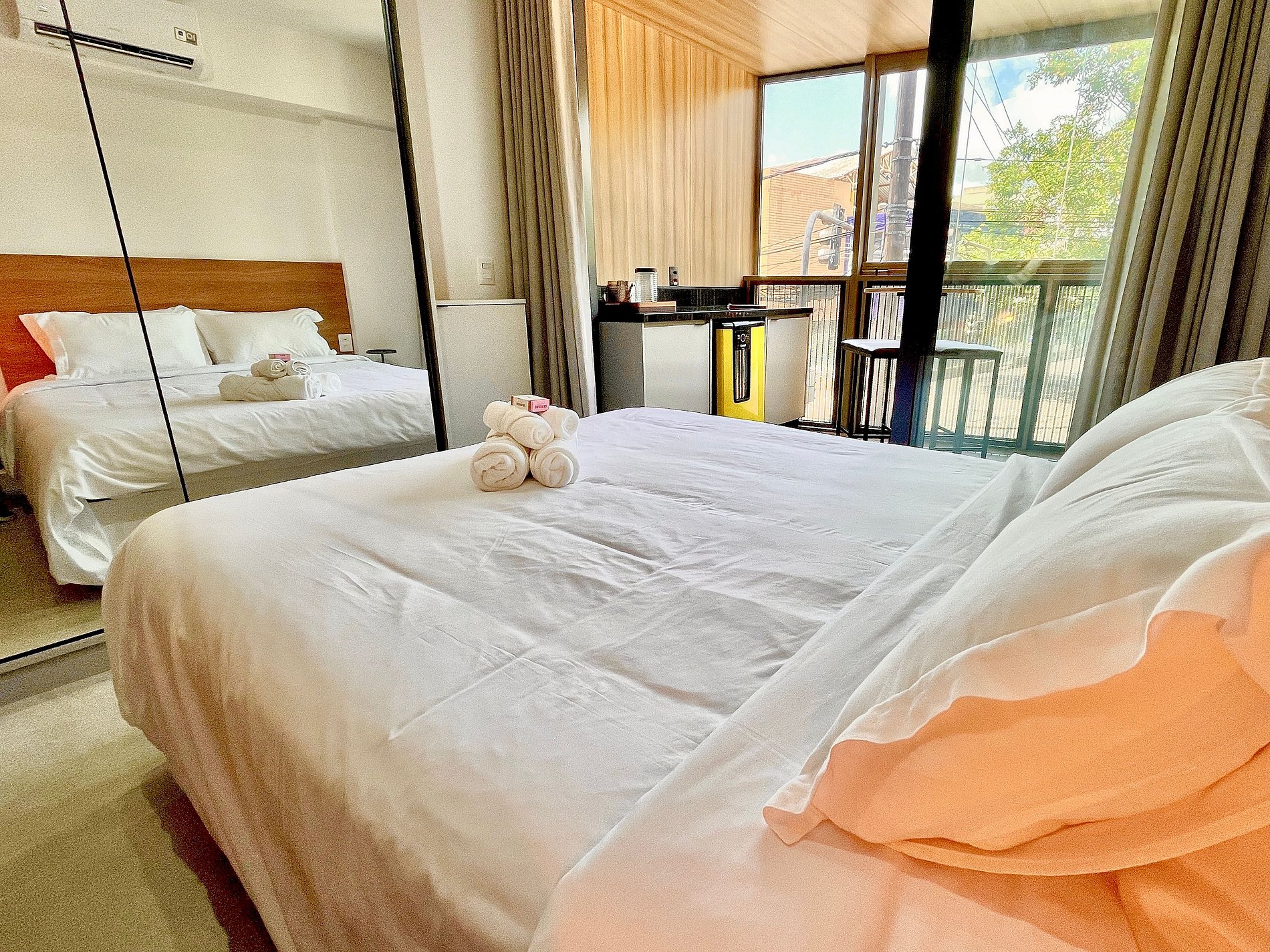 Studio súper agradable con una cómoda cama queen, sofá cama doble, armarios, aire acondicionado potente, Smart TV de 50 pulgadas, cortinas blackout, mesa de comedor y numerosos enchufes. También cuenta con un encantador balcón con vistas al Cristo Redentor, a las montañas y a la calle. Dispone de acceso a internet de alta velocidad. El baño está completamente equipado con ducha con buena presión. Cocina equipada con refrigerador, vitrocerámica, campana, microondas, cafetera, Airfryer, lavadora y secadora, y varios utensilios. Otras comodidades incluyen una cuna portátil*, secador de pelo, plancha y kit de amenidades (champú, acondicionador y jabón).