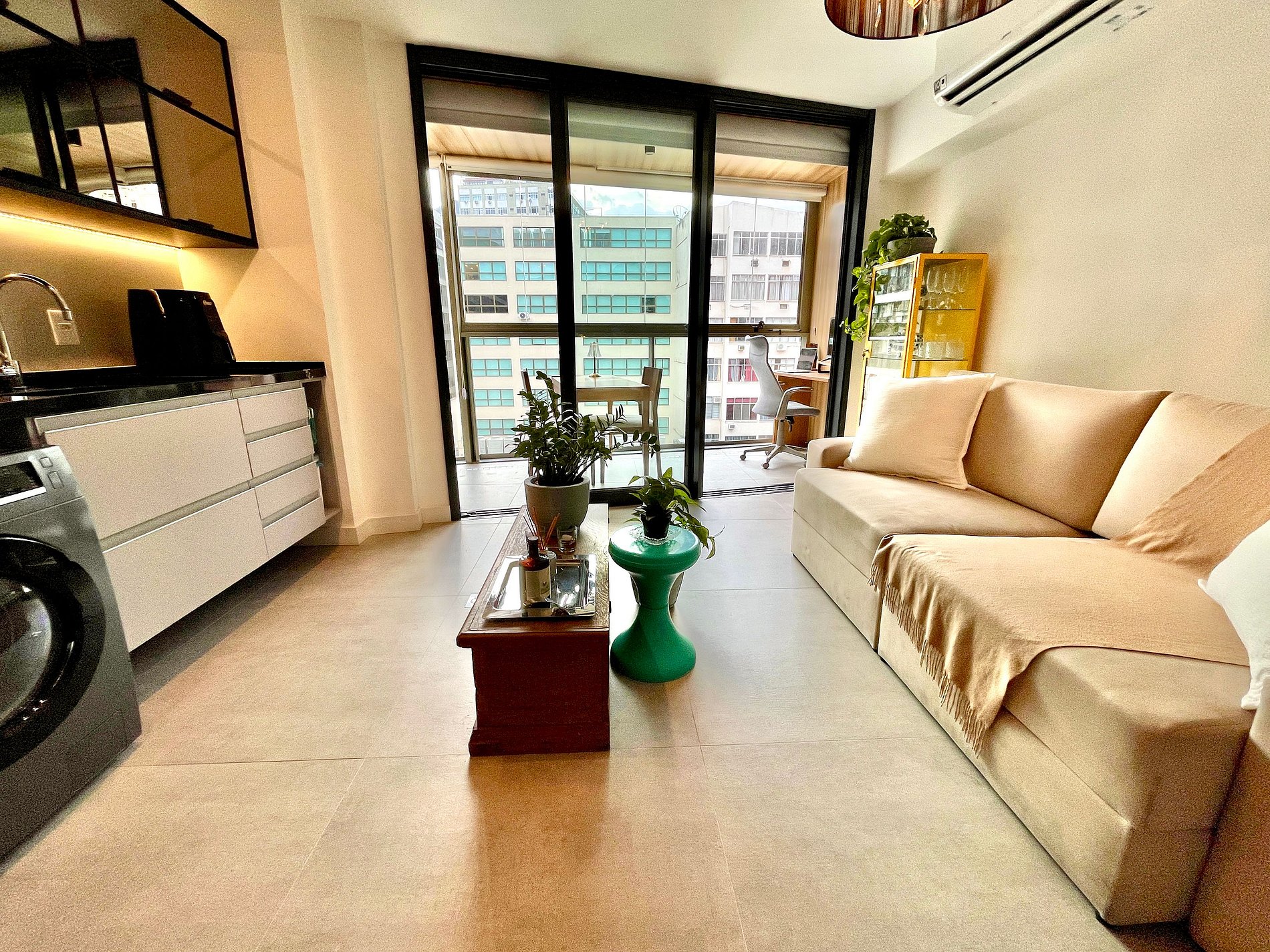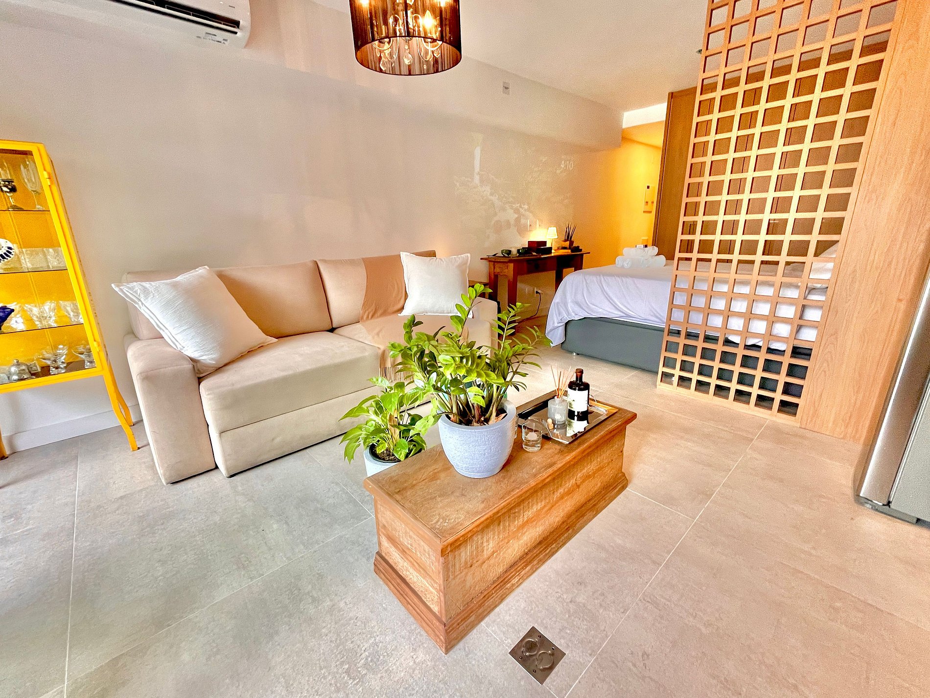 Dormitorio/sala de estar súper agradable con sofá, cama queen, closets, aire acondicionado, proyector de TV, cortina blackout automatizada, mesa de comedor, varios enchufes, además de un balcón súper encantador. Internet de alta velocidad. Baño completo con ducha con buena presión. Cocina equipada con frigorífico, vitrocerámica, microondas, cafetera Nespresso, Airfryer y utensilios varios. También ofrece otras comodidades, como cuna portátil, secador de pelo, tabla de planchar y plancha y kit de amenidades (champú, acondicionador y jabón).