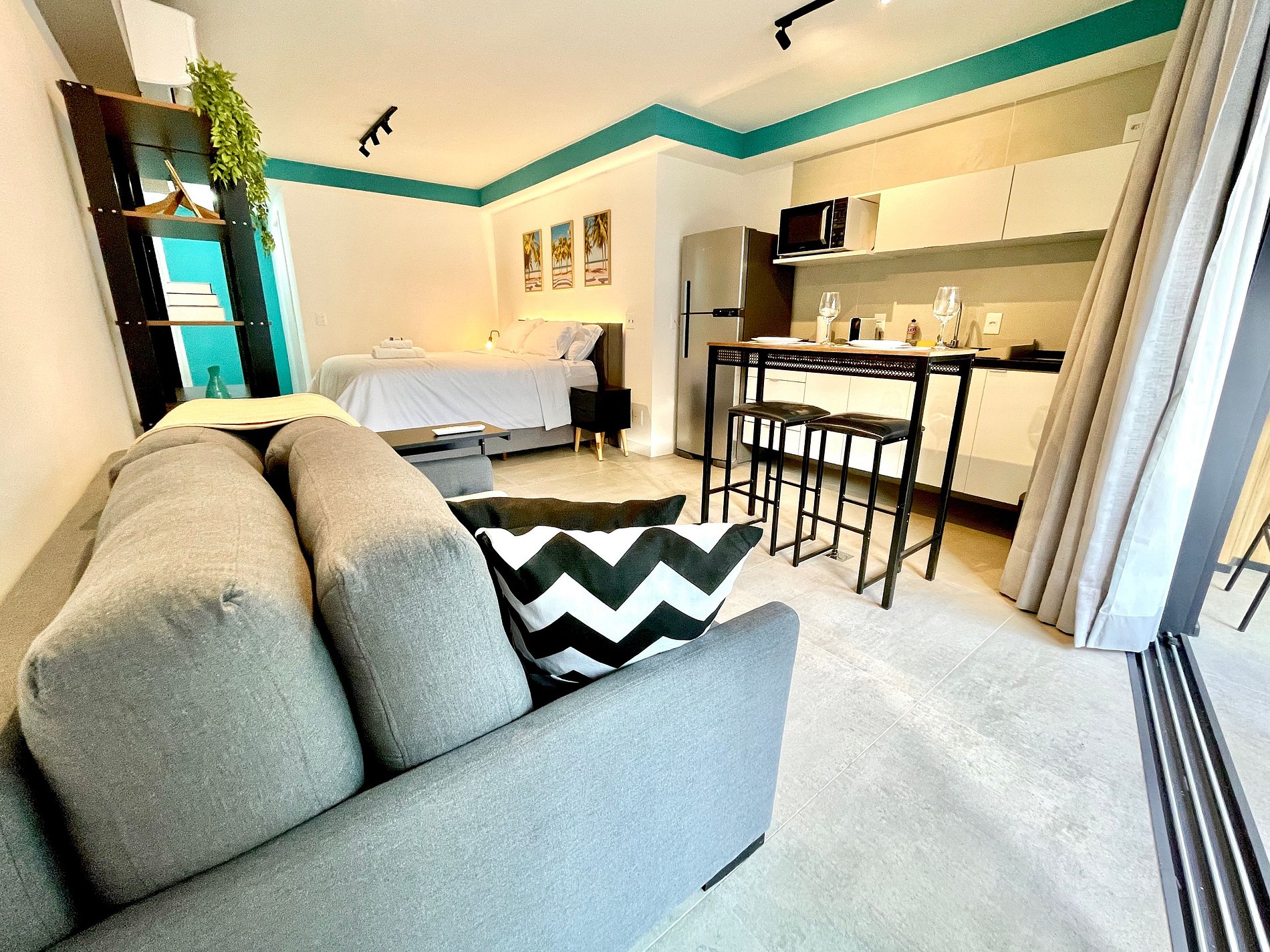 Dormitorio/sala de estar súper agradable con sofá cama, cama queen, closets, aire acondicionado, Smart TV, cortinas blackout, mesa de comedor, varios enchufes, además de un balcón súper encantador. Internet de alta velocidad. Baño completo con ducha con buena presión. Cocina equipada con frigorífico, vitrocerámica, microondas, cafetera Nespresso y utensilios varios. También ofrece otras comodidades, como cuna portátil, secador de pelo, tabla de planchar y plancha y kit de amenidades (champú, acondicionador y jabón).