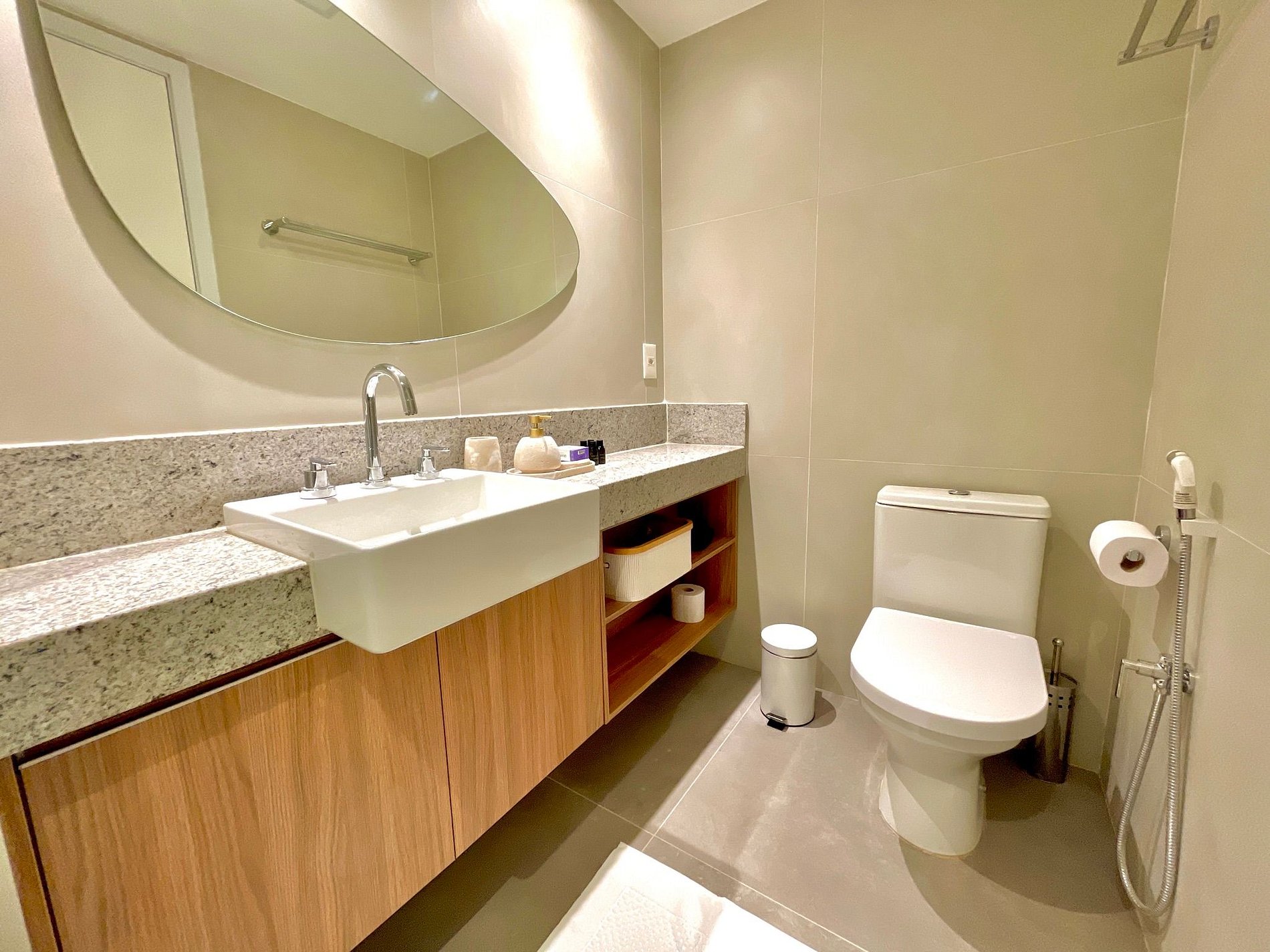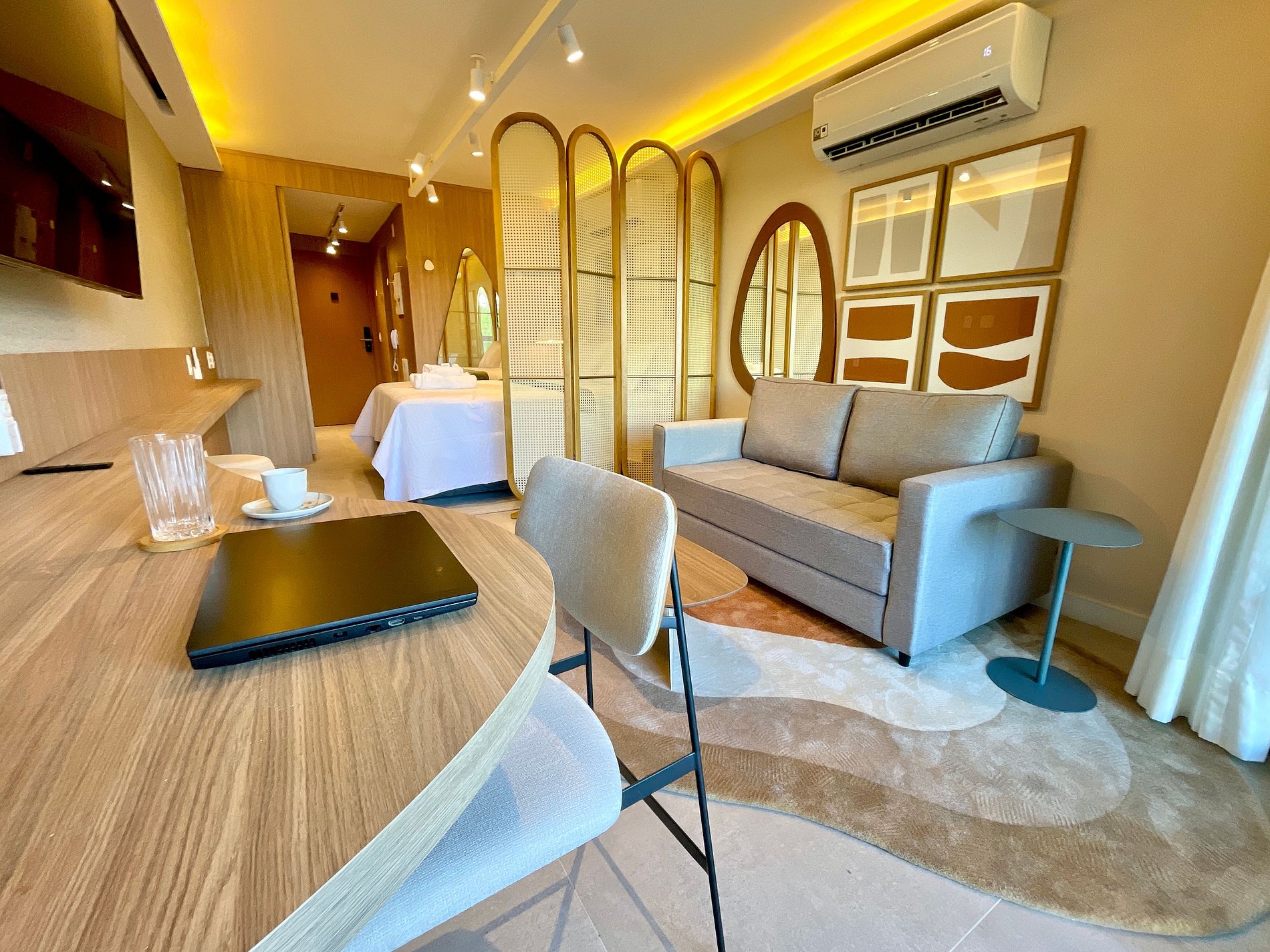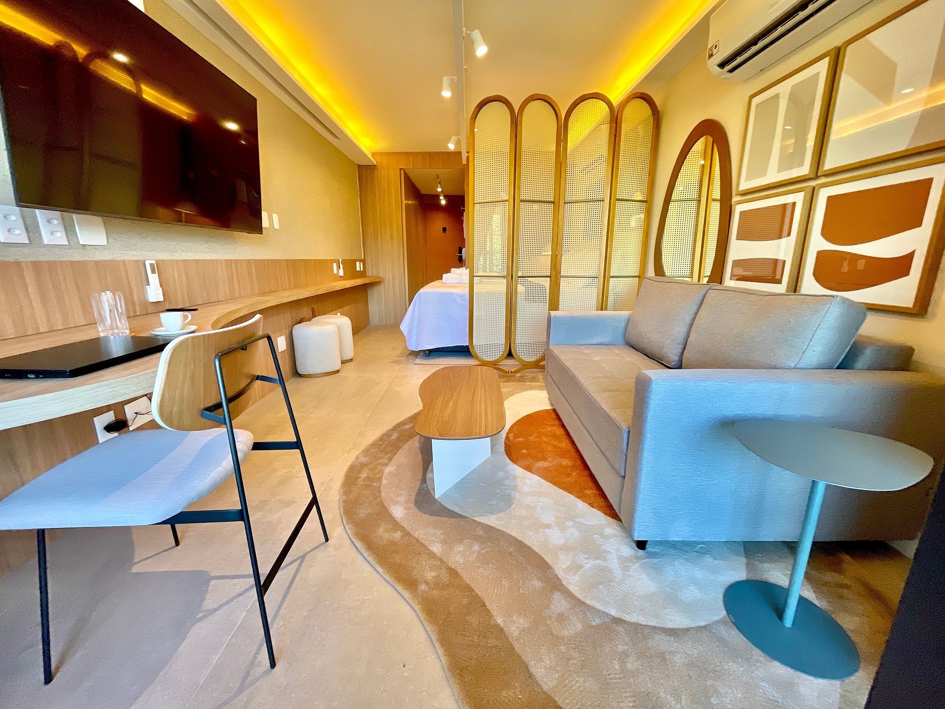 Dormitorio/sala de estar súper agradable con sofá cama, cama queen, closets, aire acondicionado, Smart TV, cortinas blackout, mesa de comedor, varios enchufes, además de un balcón súper encantador. Internet de alta velocidad. Baño completo con ducha con buena presión. Cocina equipada con frigorífico, vitrocerámica, horno, cafetera Nespresso, Airfryer, filtro de agua y utensilios varios. También ofrece otras comodidades, como cuna portátil, secador de pelo, tabla de planchar y plancha y kit de amenidades (champú, acondicionador y jabón).