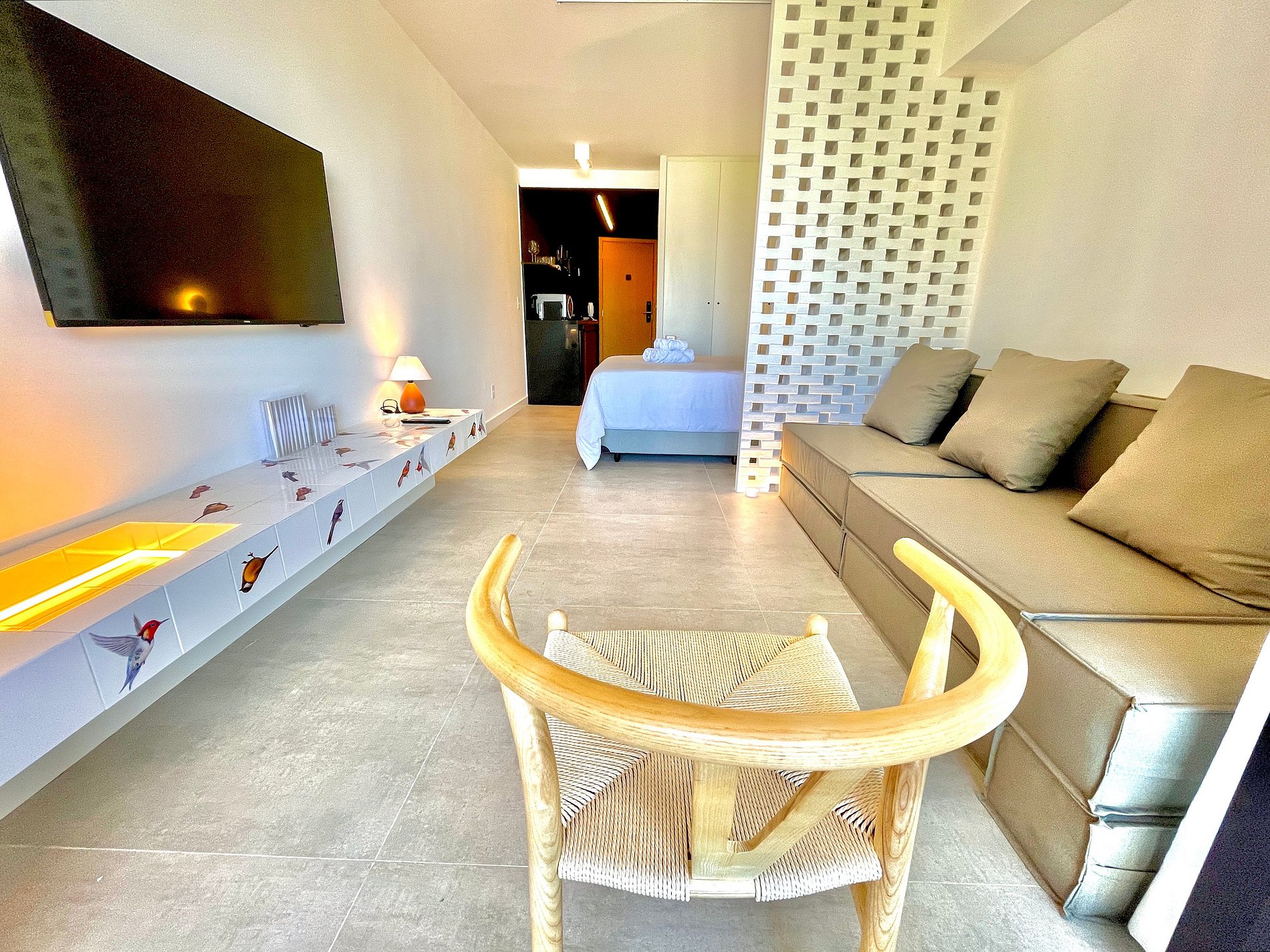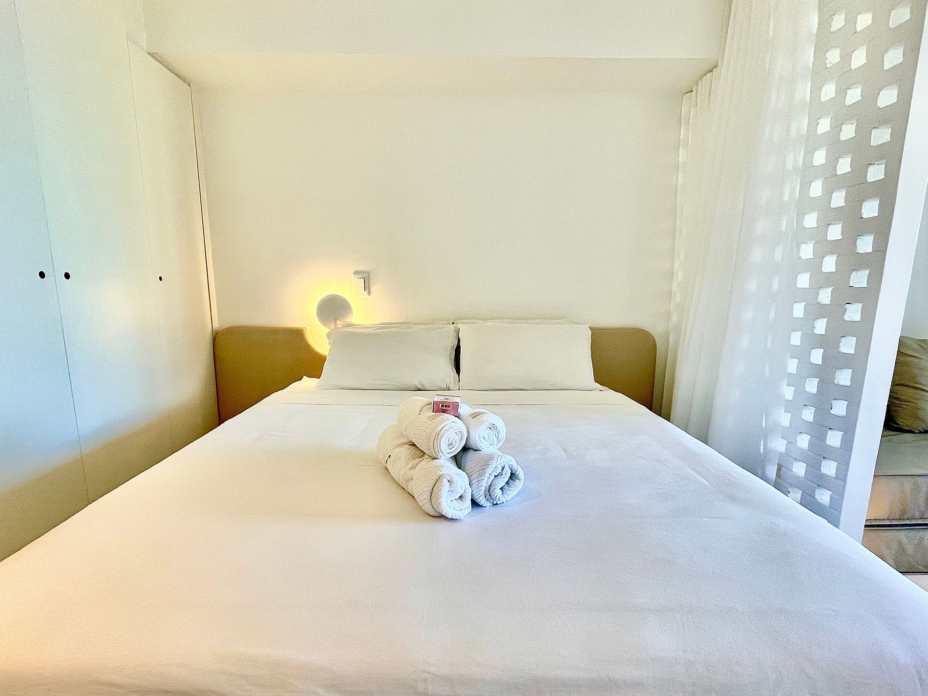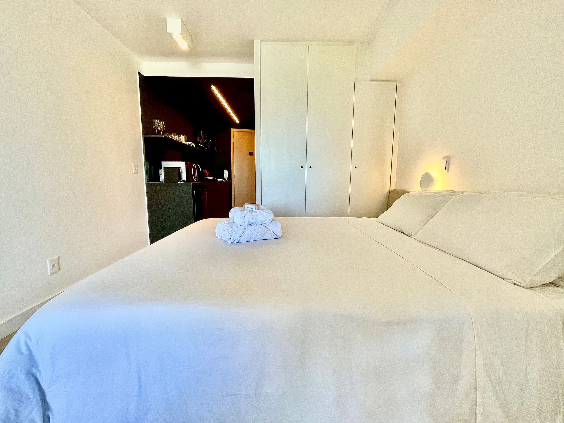 Dormitorio/sala de estar súper agradable con sofá cama, cama queen, closets, aire acondicionado, Smart TV, cortinas blackout, mesa de comedor, varios enchufes, además de un balcón súper encantador. Internet de alta velocidad. Baño completo con ducha con buena presión. Cocina equipada con frigorífico, vitrocerámica, microondas, cafetera Nespresso, Airfryer y utensilios varios. También ofrece otras comodidades, como cuna portátil, secador de pelo, tabla de planchar y plancha y kit de amenidades (champú, acondicionador y jabón).