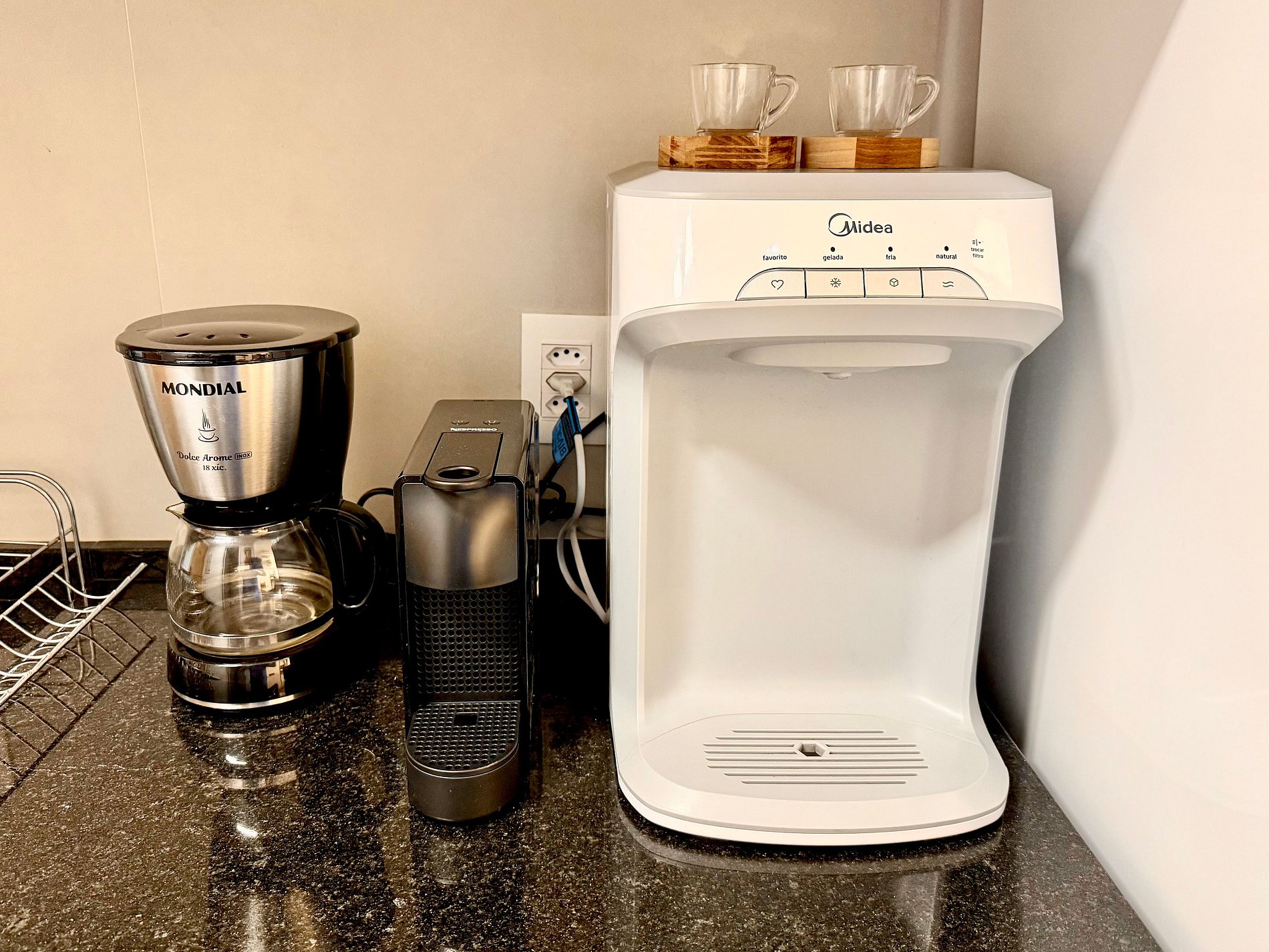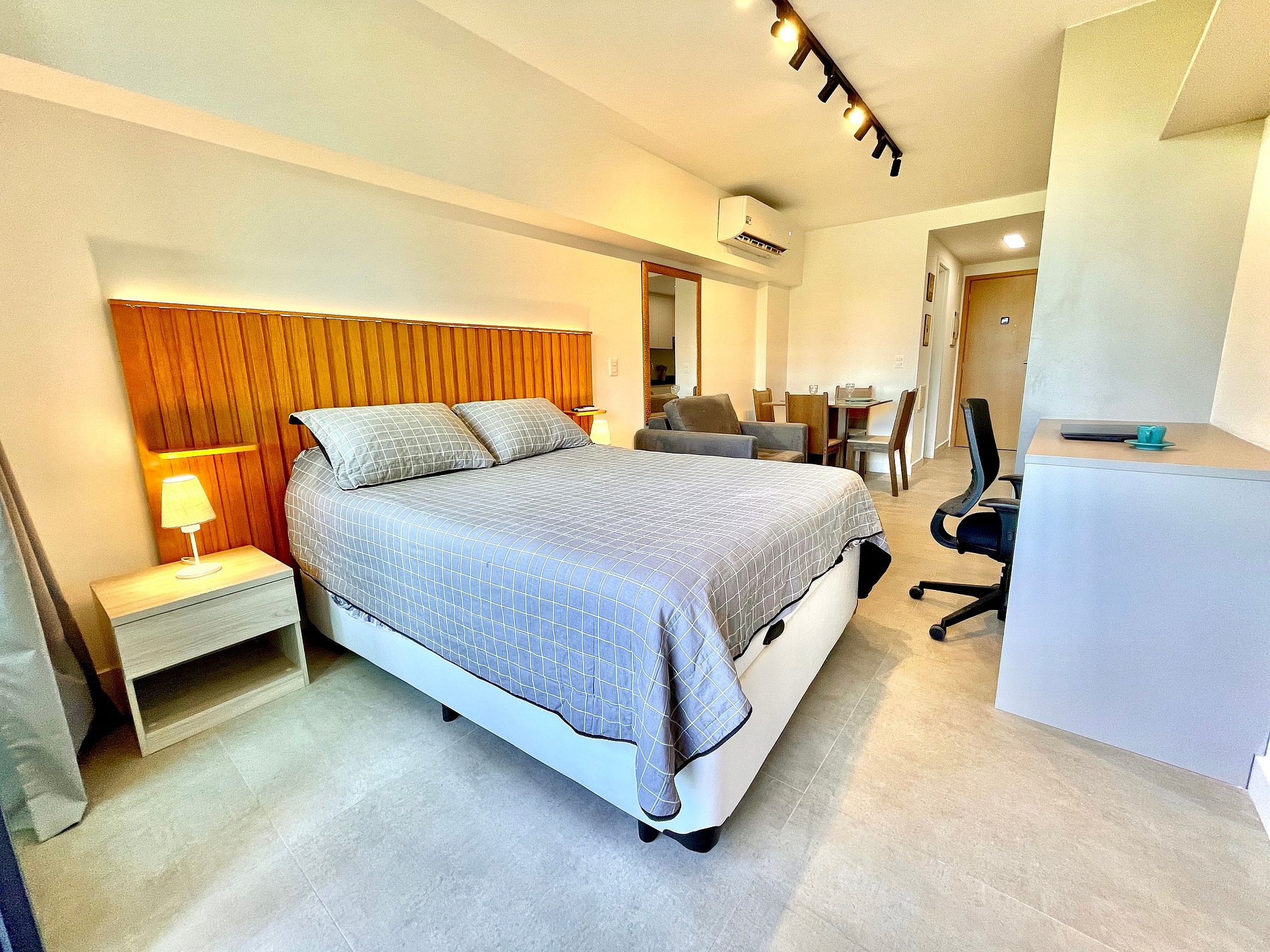 Quarto/sala super agradável com sofá, cama de casal, armários, ar condicionado, Smart TV, cortina blackout, mesa de jantar, diversas tomadas, além de contar com uma varanda super charmosa. Internet de alta velocidade. Banheiro todo completo e com chuveiro com boa pressão. Cozinha equipada com geladeira, cooktop, microondas, máquina de Nespresso, Airfryer, filtro de água e diversos utensílios. Oferece também outras comodidades, como berço portátil*, secador de cabelo, tábua e ferro de passar roupa e kit de amenities (shampoo, condicionador e sabonete).