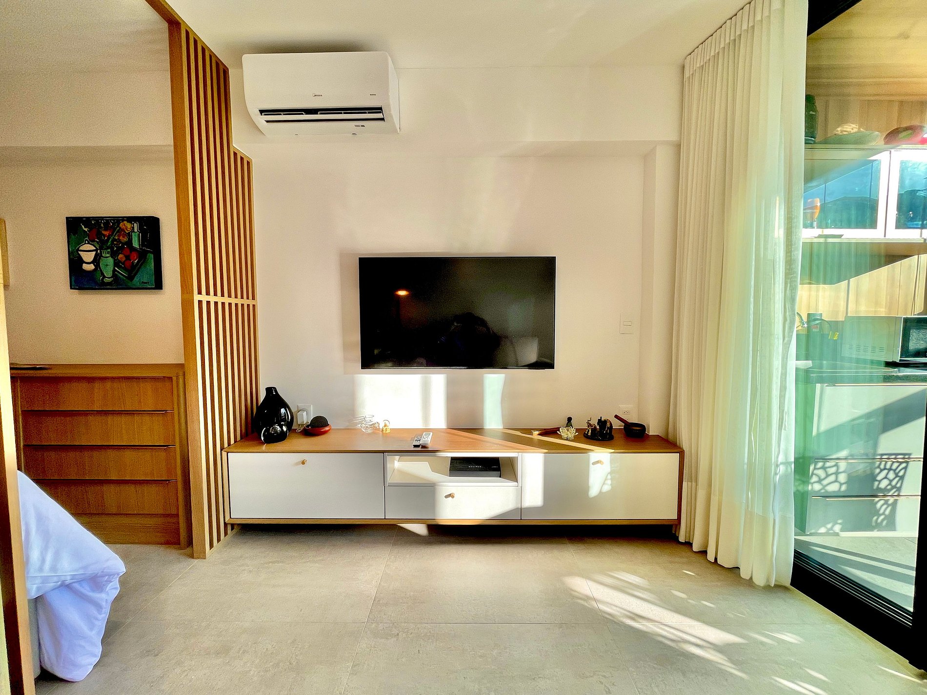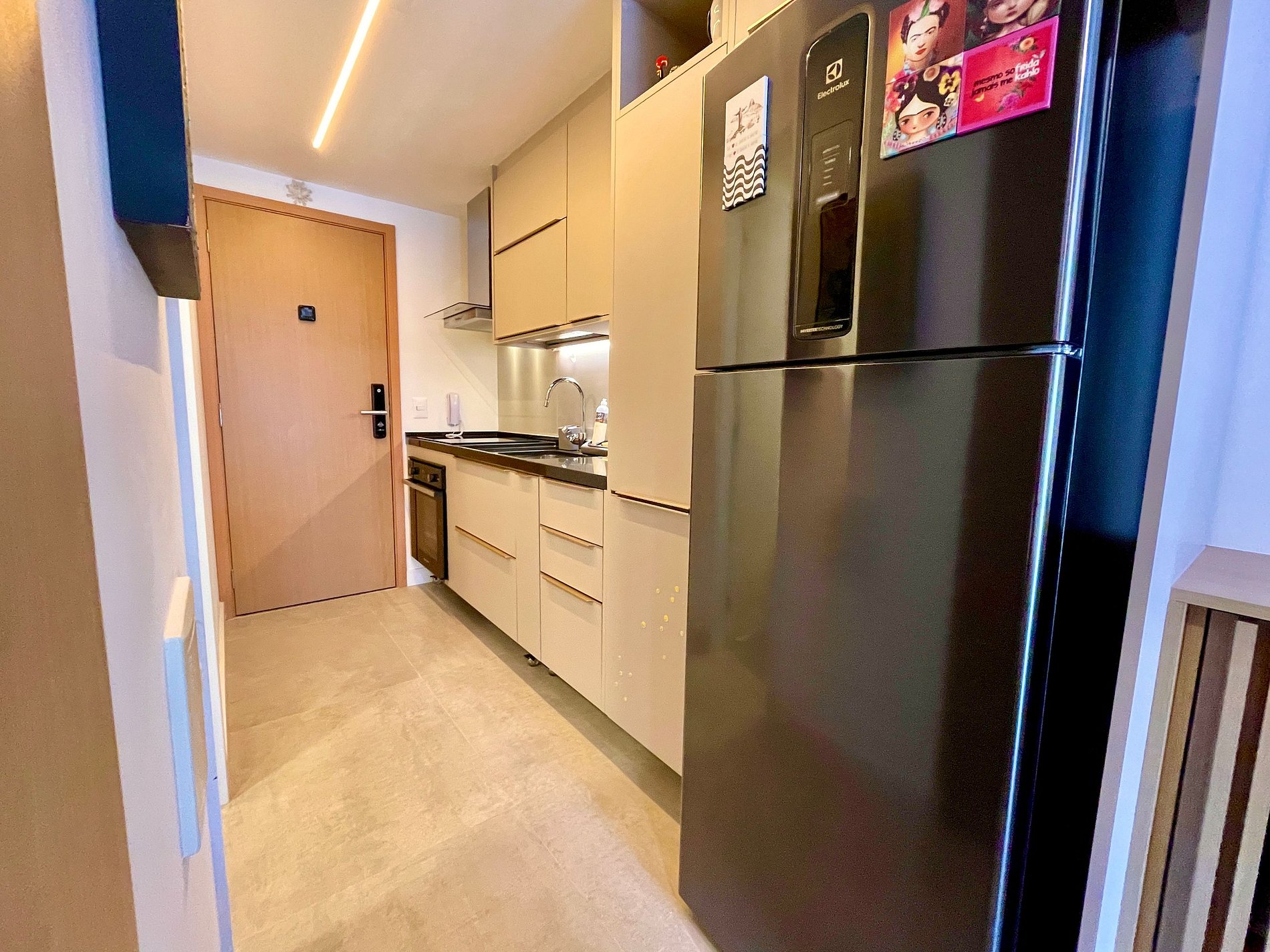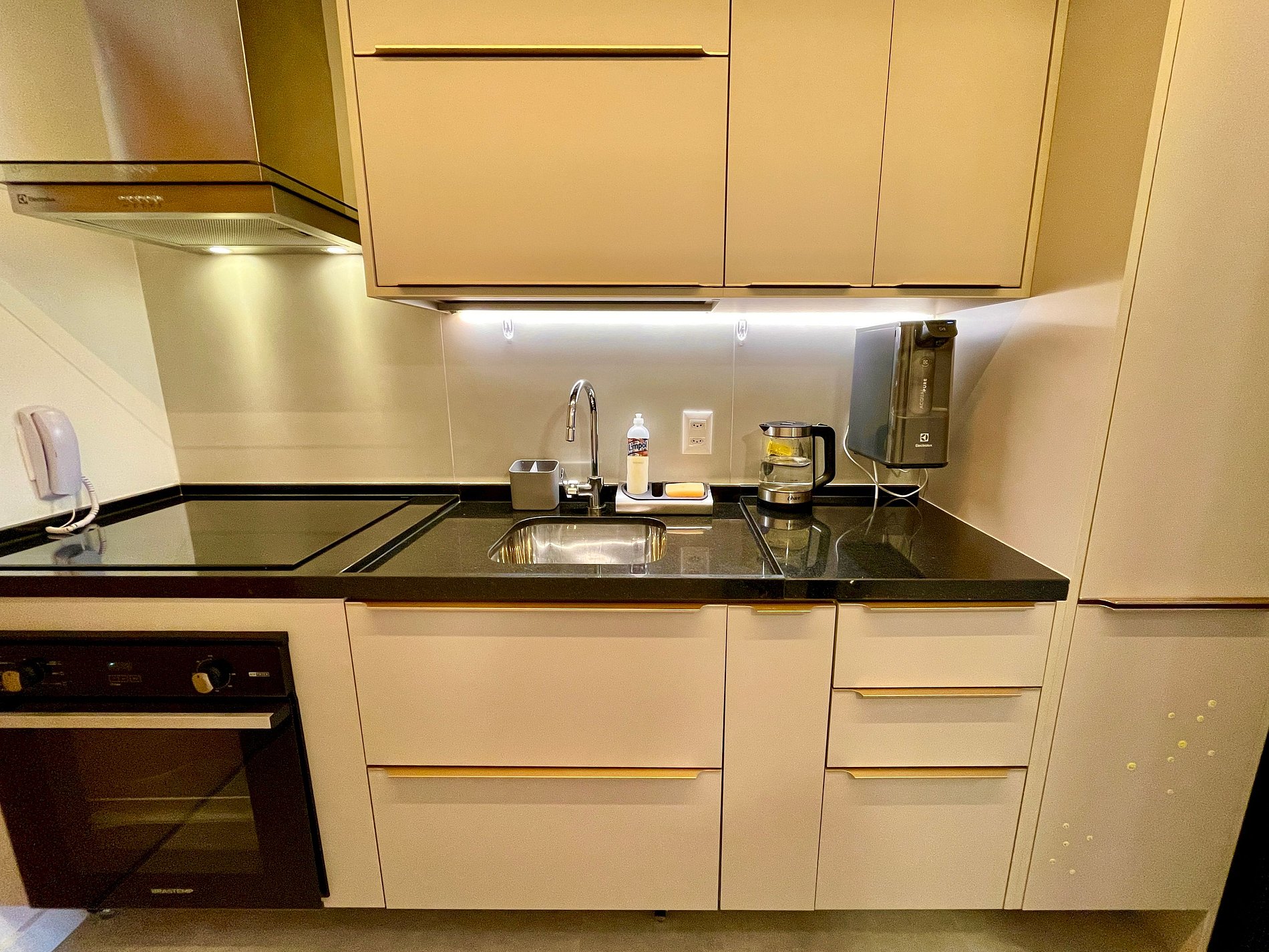 Quarto/sala super agradável com sofá, cama de casal, armários, aparelhos de ar condicionado, Smart TV, cortina blackout, mesa de jantar, diversas tomadas, além de contar com uma varanda super charmosa. Internet de alta velocidade. Banheiro todo completo e com chuveiro com boa pressão. Cozinha equipada com geladeira, cooktop, microondas, forno com Airfryer, filtro de água e diversos utensílios. Oferece também outras comodidades, como berço portátil*, secador de cabelo, tábua e ferro de passar roupa e kit de amenities (shampoo, condicionador e sabonete).