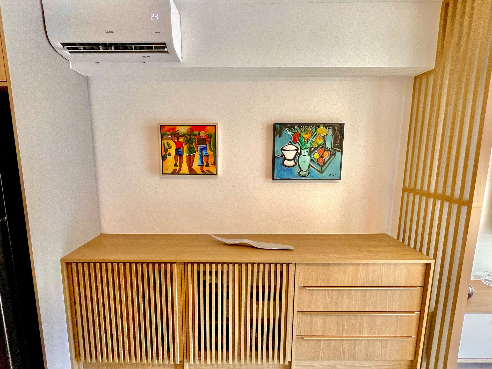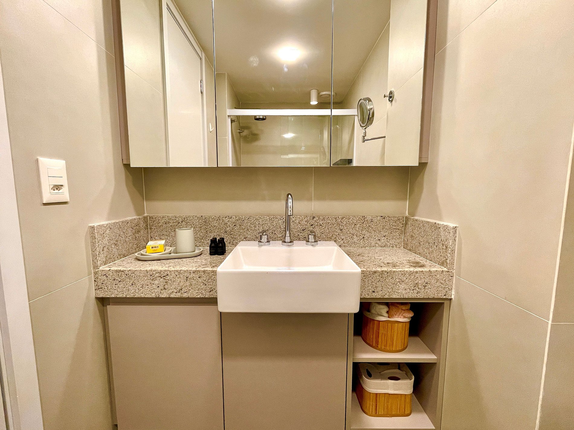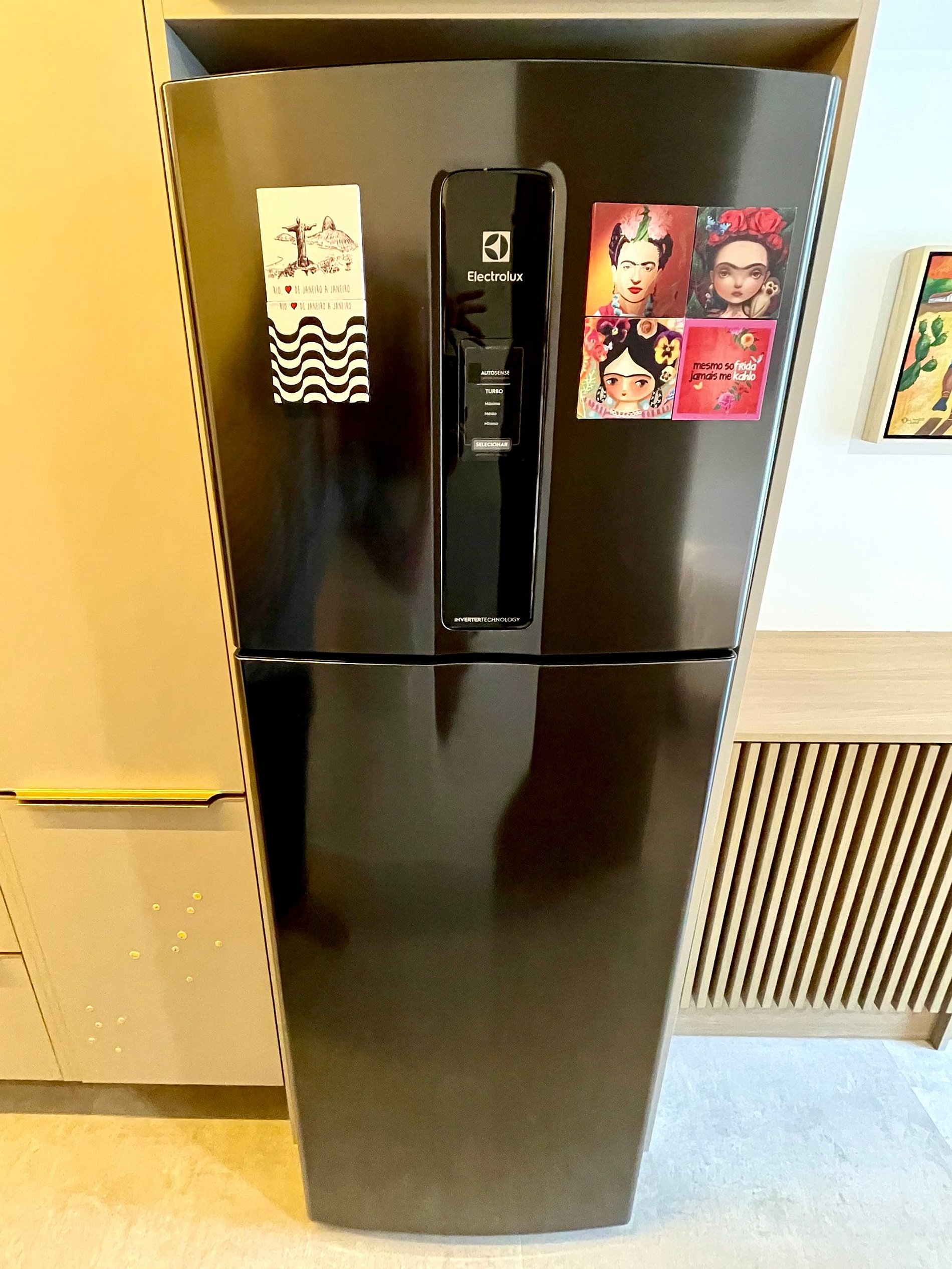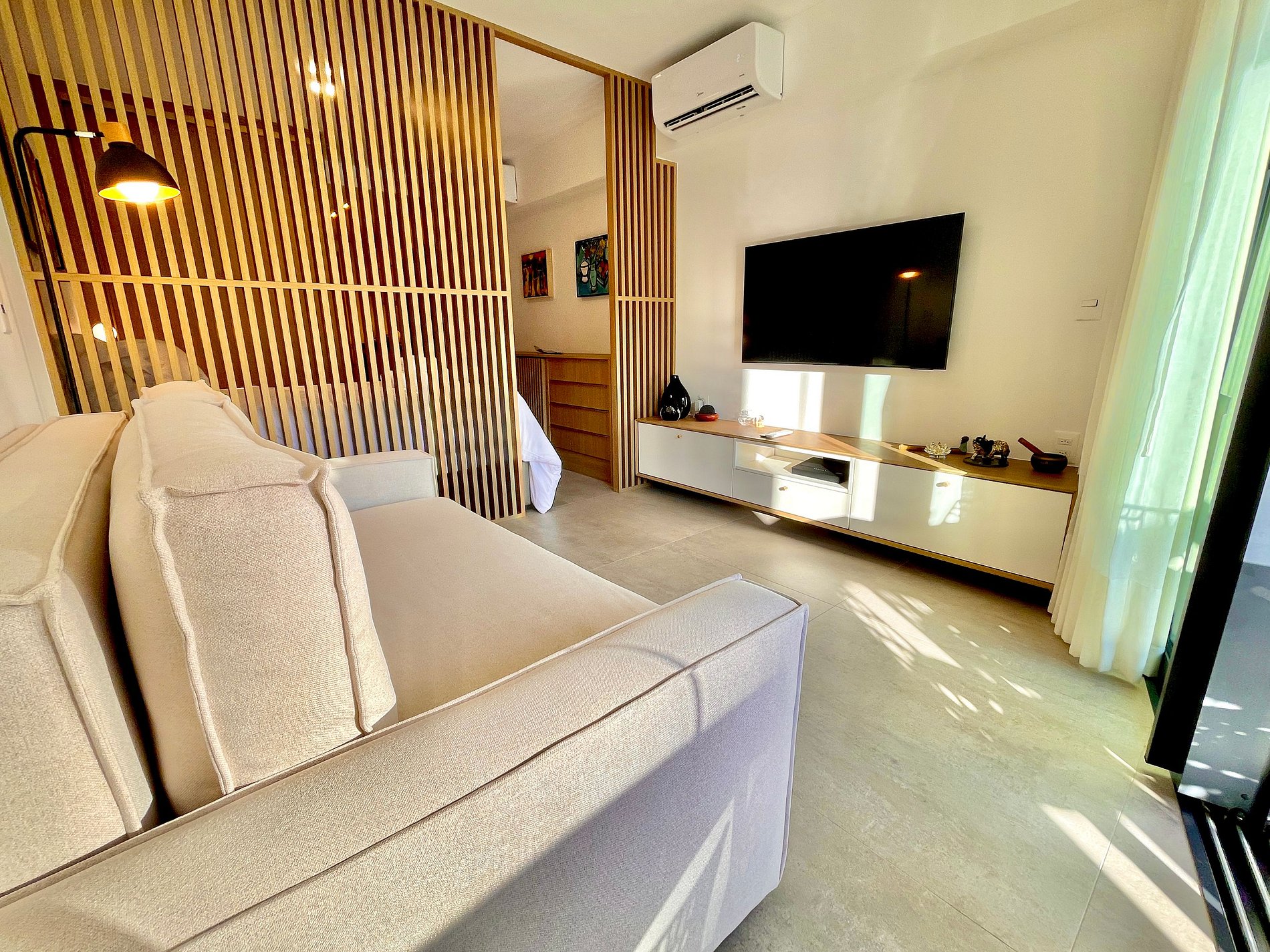 Quarto/sala super agradável com sofá, cama de casal, armários, aparelhos de ar condicionado, Smart TV, cortina blackout, mesa de jantar, diversas tomadas, além de contar com uma varanda super charmosa. Internet de alta velocidade. Banheiro todo completo e com chuveiro com boa pressão. Cozinha equipada com geladeira, cooktop, microondas, forno com Airfryer, filtro de água e diversos utensílios. Oferece também outras comodidades, como berço portátil*, secador de cabelo, tábua e ferro de passar roupa e kit de amenities (shampoo, condicionador e sabonete).
