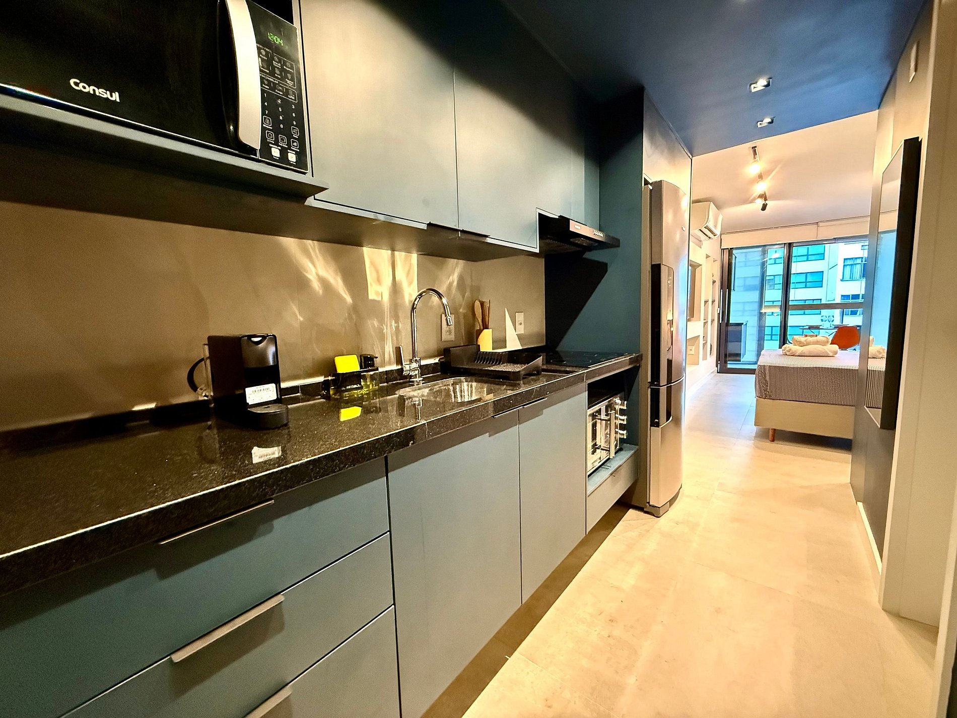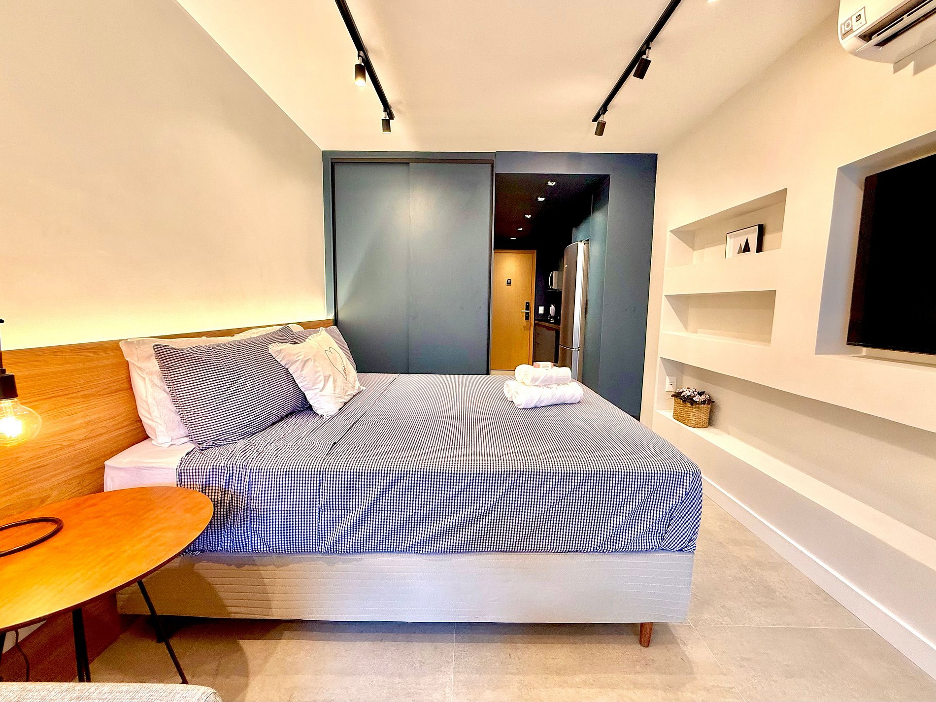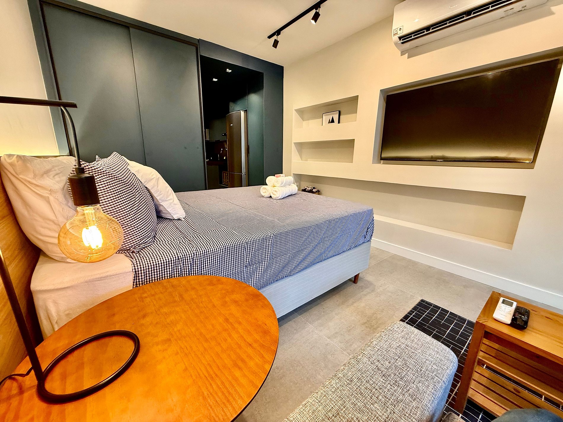 Quarto/sala super agradável com sofá, cama queen, armários, aparelhos de ar condicionado, Smart TV, cortina blackout, mesa de jantar, diversas tomadas, além de contar com uma varanda super charmosa. Internet de alta velocidade. Banheiro todo completo e com chuveiro com boa pressão. Cozinha equipada com geladeira, cooktop, microondas, máquina de Nespresso, cafeteira elétrica, forno com Airfryer e diversos utensílios. Oferece também outras comodidades, como berço portátil*, secador de cabelo, tábua e ferro de passar roupa e kit de amenities (shampoo, condicionador e sabonete).